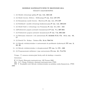 MODELE MATEMATYCZNE W EKONOMII 2014 TEMATY ZALICZENIOWE 1. (2) Modele równowagi ogólnej P roz. 3.2, 126-146 2. (2) Model Arrowa -Debreu - McKenziego P roz. 3.3, 147-170 3. (2) Dynamiczny model Arrowa - Hurwicza P, roz. 4.1, 171-187 4. (2) Stabilność i modele równowagi konkurencyjnej P roz. 4.2, 188-210 5. (2) Model Gale’a i równowaga von Neumanna P, roz. 5.1, 211 - 241 6. (2)Podstawowe pojecia systemów dynamicznych P roz. 7.1, 367-384 ‘ 7. (3) Podstawowe pojecia systemów dynamicznych P roz. 7.2, 385-422 ‘ 8. (4) Równania różnicowe i ich zastosowania P, dodatki F,G; Ch. 15.5, roz. 16, 17 9. (2) Dowód Tw. Kuhna - Tuckera Ch. 21.4; 736-741 10. (4) Metody wielokryterialne w zastosowaniu do problemów dyskretnych TT roz. 2, 43- 89 11. (4) Metody wielokryterialne w ubezpieczeniach TT roz. 5, 173 - 220 12. (3) Programowanie nieliniowe i jego zastosowania Ch roz. 21, 714-751 Uwaga. (*) oznacza orientacyjnie liczbe osób do każdego z tematów. ‘ Literatura: P E. Panek, Ekonomia matematyczna, AE Poznan 2000 Ch A.C. Chang, Podstawy ekonomii matematycznej, PWE TT T. Trzaskalik (red) Metody wielokryterialne na polskim rynku finansowym. PWE 2006 1