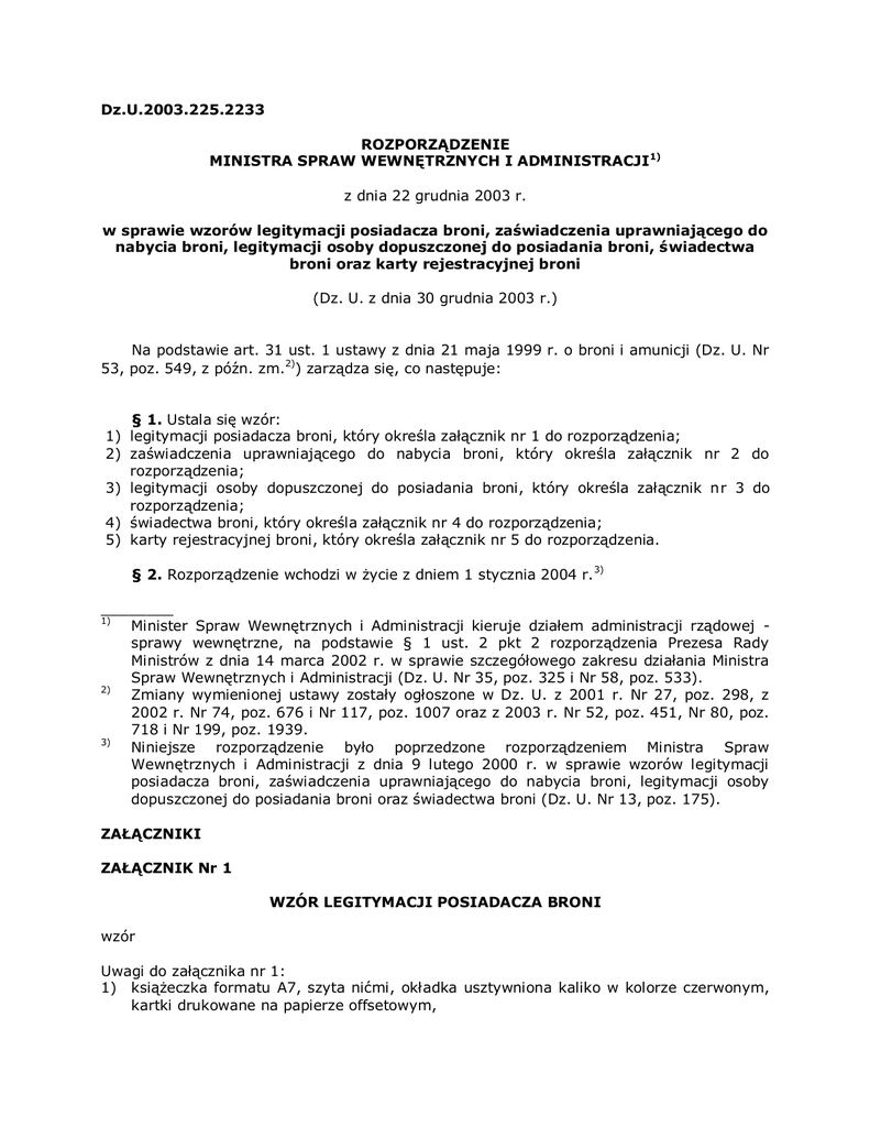 Dz.U.2003.225.2233 ROZPORZĄDZENIE MINISTRA SPRAW WEWNĘTRZNYCH I ADMINISTRACJI 1) z dnia 22 grudnia 2003 r. w sprawie wzorów legitymacji posiadacza broni, zaświadczenia uprawniającego do nabycia broni, legitymacji osoby dopuszczonej do posiadania broni, świadectwa broni oraz karty rejestracyjnej broni (Dz. U. z dnia 30 grudnia 2003 r.) Na podstawie art. 31 ust. 1 ustawy z dnia 21 maja 1999 r. o broni i amunicji (Dz. U. Nr 53, poz. 549, z późn. zm.2)) zarządza się, co następuje: § 1. Ustala się wzór: 1) legitymacji posiadacza broni, który określa załącznik nr 1 do rozporządzenia; 2) zaświadczenia uprawniającego do nabycia broni, który określa załącznik nr 2 do rozporządzenia; 3) legitymacji osoby dopuszczonej do posiadania broni, który określa załącznik nr 3 do rozporządzenia; 4) świadectwa broni, który określa załącznik nr 4 do rozporządzenia; 5) karty rejestracyjnej broni, który określa załącznik nr 5 do rozporządzenia. § 2. Rozporządzenie wchodzi w życie z dniem 1 stycznia 2004 r. 3) ________ 1) Minister Spraw Wewnętrznych i Administracji kieruje działem administracji rządowej sprawy wewnętrzne, na podstawie § 1 ust. 2 pkt 2 rozporządzenia Prezesa Rady Ministrów z dnia 14 marca 2002 r. w sprawie szczegółowego zakresu działania Ministra Spraw Wewnętrznych i Administracji (Dz. U. Nr 35, poz. 325 i Nr 58, poz. 533). 2) Zmiany wymienionej ustawy zostały ogłoszone w Dz. U. z 2001 r. Nr 27, poz. 298, z 2002 r. Nr 74, poz. 676 i Nr 117, poz. 1007 oraz z 2003 r. Nr 52, poz. 451, Nr 80, poz. 718 i Nr 199, poz. 1939. 3) Niniejsze rozporządzenie było poprzedzone rozporządzeniem Ministra Spraw Wewnętrznych i Administracji z dnia 9 lutego 2000 r. w sprawie wzorów legitymacji posiadacza broni, zaświadczenia uprawniającego do nabycia broni, legitymacji osoby dopuszczonej do posiadania broni oraz świadectwa broni (Dz. U. Nr 13, poz. 175). ZAŁĄCZNIKI ZAŁĄCZNIK Nr 1 WZÓR LEGITYMACJI POSIADACZA BRONI wzór Uwagi do załącznika nr 1: 1) książeczka formatu A7, szyta nićmi, okładka usztywniona kaliko w kolorze czerwonym, kartki drukowane na papierze offsetowym, 2) 3) kolorystyka - apla w kolorze niebieskim, tekst w kolorze czarnym, zabezpieczenia - znak wodny, mikrodruk. ZAŁĄCZNIK Nr 2 WZÓR ZAŚWIADCZENIA UPRAWNIAJĄCEGO DO NABYCIA BRONI wzór Uwagi do załącznika nr 2: 1) kartka formatu A5, na papierze offsetowym zadrukowanym jednostronnie, 2) kolorystyka - apla w kolorze jasnoniebieskim, tekst w kolorze czarnym, 3) gilosz w kolorze niebieskim w formie wyrazów "POLICJA" drukowanych wzdłuż krótszego boku strony. ZAŁĄCZNIK Nr 3 WZÓR LEGITYMACJI OSOBY DOPUSZCZONEJ DO POSIADANIA BRONI wzór Uwagi do załącznika nr 3: 1) książeczka formatu A7, szyta nićmi, okładka usztywniona kaliko w kolorze czerwonym, kartki drukowane na papierze offsetowym, 2) kolorystyka - apla w kolorze niebieskim, tekst w kolorze czarnym, 3) zabezpieczenia - znak wodny, mikrodruk. ZAŁĄCZNIK Nr 4 WZÓR ŚWIADECTWA BRONI wzór Uwagi do załącznika nr 4: 1) kartonik formatu A7, zadrukowany dwustronnie i dwustronnie foliowany, 2) kolorystyka - dwustronna apla, tekst w kolorze czarnym, 3) zabezpieczenia - mikrodruk. ZAŁĄCZNIK Nr 5 WZÓR KARTY REJESTRACYJNEJ BRONI wzór Uwagi do załącznika nr 5: 1) książeczka formatu A7, szyta nićmi, okładka usztywniona kaliko w kolorze żół tym, kartki drukowane na papierze offsetowym, 2) kolorystyka - apla w kolorze niebieskim, tekst w kolorze czarnym, 3) zabezpieczenia - znak wodny, gilosz. Strona 1 z 1 http://lex.online.wolterskluwer.pl/WKPLOnline/grafikaWindow.rpc?nro=318776114 ... 2015-08-26 Strona 1 z 1 http://lex.online.wolterskluwer.pl/WKPLOnline/grafikaWindow.rpc?nro=318776114 ... 2015-08-26 Strona 1 z 1 http://lex.online.wolterskluwer.pl/WKPLOnline/grafikaWindow.rpc?nro=318776114 ... 2015-08-26 Strona 1 z 1 http://lex.online.wolterskluwer.pl/WKPLOnline/grafikaWindow.rpc?nro=318776114 ... 2015-08-26 Strona 1 z 1 http://lex.online.wolterskluwer.pl/WKPLOnline/grafikaWindow.rpc?nro=318776114 ... 2015-08-26 Strona 1 z 1 http://lex.online.wolterskluwer.pl/WKPLOnline/grafikaWindow.rpc?nro=318776114 ... 2015-08-26 Strona 1 z 1 http://lex.online.wolterskluwer.pl/WKPLOnline/grafikaWindow.rpc?nro=318776114 ... 2015-08-26 Strona 1 z 1 http://lex.online.wolterskluwer.pl/WKPLOnline/grafikaWindow.rpc?nro=318776114 ... 2015-08-26 Strona 1 z 1 http://lex.online.wolterskluwer.pl/WKPLOnline/grafikaWindow.rpc?nro=318776114 ... 2015-08-26 Strona 1 z 1 http://lex.online.wolterskluwer.pl/WKPLOnline/grafikaWindow.rpc?nro=318776114 ... 2015-08-26 Strona 1 z 1 http://lex.online.wolterskluwer.pl/WKPLOnline/grafikaWindow.rpc?nro=318776114 ... 2015-08-26