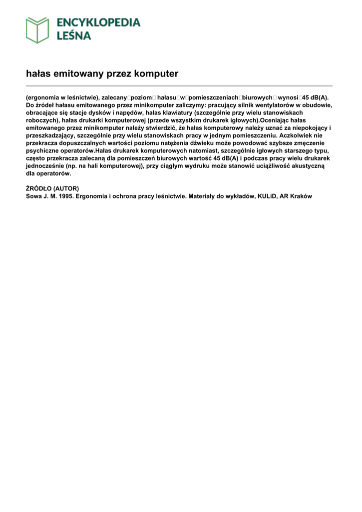 hałas emitowany przez komputer (ergonomia w leśnictwie), zalecany poziom hałasu w pomieszczeniach biurowych wynosi 45 dB(A). Do źródeł hałasu emitowanego przez minikomputer zaliczymy: pracujący silnik wentylatorów w obudowie, obracające się stacje dysków i napędów, hałas klawiatury (szczególnie przy wielu stanowiskach roboczych), hałas drukarki komputerowej (przede wszystkim drukarek igłowych).Oceniając hałas emitowanego przez minikomputer należy stwierdzić, że hałas komputerowy należy uznać za niepokojący i przeszkadzający, szczególnie przy wielu stanowiskach pracy w jednym pomieszczeniu. Aczkolwiek nie przekracza dopuszczalnych wartości poziomu natężenia dźwieku może powodować szybsze zmęczenie psychiczne operatorów.Hałas drukarek komputerowych natomiast, szczególnie igłowych starszego typu, często przekracza zalecaną dla pomieszczeń biurowych wartość 45 dB(A) i podczas pracy wielu drukarek jednocześnie (np. na hali komputerowej), przy ciągłym wydruku może stanowić uciążliwość akustyczną dla operatorów. ŹRÓDŁO (AUTOR) Sowa J. M. 1995. Ergonomia i ochrona pracy leśnictwie. Materiały do wykładów, KULiD, AR Kraków