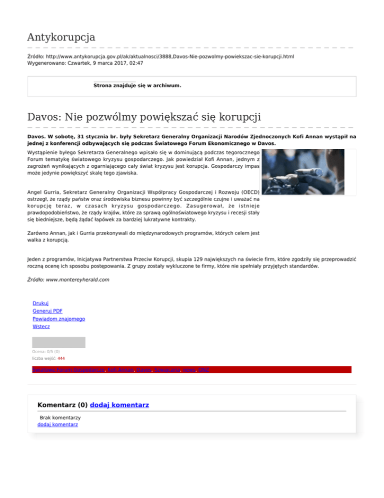 Antykorupcja Źródło: http://www.antykorupcja.gov.pl/ak/aktualnosci/3888,Davos-Nie-pozwolmy-powiekszac-sie-korupcji.html Wygenerowano: Czwartek, 9 marca 2017, 02:47 Strona znajduje się w archiwum. Davos: Nie pozwólmy powiększać się korupcji Davos. W sobotę, 31 stycznia br. były Sekretarz Generalny Organizacji Narodów Zjednoczonych Kofi Annan wystąpił na jednej z konferencji odbywających się podczas Światowego Forum Ekonomicznego w Davos. Wystąpienie byłego Sekretarza Generalnego wpisało się w dominującą podczas tegorocznego Forum tematykę światowego kryzysu gospodarczego. Jak powiedział Kofi Annan, jednym z zagrożeń wynikających z ogarniającego cały świat kryzysu jest korupcja. Gospodarczy impas może jedynie powiększyć skalę tego zjawiska. Angel Gurria, Sekretarz Generalny Organizacji Współpracy Gospodarczej i Rozwoju (OECD) ostrzegł, że rządy państw oraz środowiska biznesu powinny być szczególnie czujne i uważać na korupcję teraz, w czasach kryzysu gospodarczego. Zasugerował, że istnieje prawdopodobieństwo, że rządy krajów, które za sprawą ogólnoświatowego kryzysu i recesji stały się biedniejsze, będą żądać łapówek za bardziej lukratywne kontrakty. Zarówno Annan, jak i Gurria przekonywali do międzynarodowych programów, których celem jest walka z korupcją. Jeden z programów, Inicjatywa Partnerstwa Przeciw Korupcji, skupia 129 największych na świecie firm, które zgodziły się przeprowadzić roczną ocenę ich sposobu postępowania. Z grupy zostały wykluczone te firmy, które nie spełniały przyjętych standardów. Źródło: www.montereyherald.com Drukuj Generuj PDF Powiadom znajomego Wstecz Ocena: 0/5 (0) liczba wejść: 444 Światowe Forum Gospodarcze, Kofi Annan, Davos, Szwajcaria, news, ONZ Komentarz (0) dodaj komentarz Brak komentarzy dodaj komentarz
