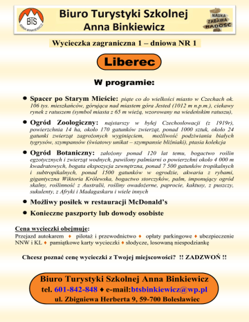 Wycieczka zagraniczna 1 – dniowa NR 1 Liberec W programie: Spacer po Starym Mieście: piąte co do wielkości miasto w Czechach ok. 106 tys. mieszkańców, górująca nad miastem góra Jested (1012 m n.p.m.), ciekawy rynek z ratuszem (symbol miasta z 65 m wieżą, wzorowany na wiedeńskim ratuszu), Ogród Zoologiczny: najstarszy w byłej Czechosłowacji (z 1919r), Ogród Botaniczny: założony ponad 120 lat temu, bogactwo roślin powierzchnia 14 ha, około 170 gatunków zwierząt, ponad 1000 sztuk, około 24 gatunki zwierząt zagrożonych wyginięciem, możliwość podziwiania białych tygrysów, szympansów (światowy unikat – szympansie bliźniaki), ptasia kolekcja egzotycznych i zwierząt wodnych, pawilony palmiarni o powierzchni około 4 000 m kwadratowych, bogata ekspozycja zewnętrzna, ponad 7 500 gatunków tropikalnych i subtropikalnych, ponad 1500 gatunków w ogrodzie, akwaria z rybami, gigantyczna Wiktoria Królewska, bogactwo storczyków, palm, imponujący ogród skalny, roślinność z Australii, rośliny owadożerne, paprocie, kaktusy, z puszczy, sukulenty, z Afryki i Madagaskaru i wiele innych Możliwy posiłek w restauracji McDonald’s Konieczne paszporty lub dowody osobiste Cena wycieczki obejmuje: Przejazd autokarem ♦ pilotaż i przewodnictwo ♦ opłaty parkingowe ♦ ubezpieczenie NNW i KL ♦ pamiątkowe karty wycieczki ♦ słodycze, losowaną niespodziankę Chcesz poznać cenę wycieczki z Twojej miejscowości? !! ZADZWOŃ !! Biuro Turystyki Szkolnej Anna Binkiewicz tel. 601-842-848 ♦ e-mail:[email protected] ul. Zbigniewa Herberta 9, 59-700 Bolesławiec