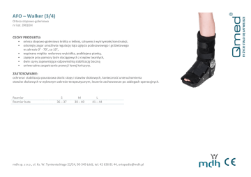 AFO – Walker (3/4) Orteza stopowo-goleniowa nr kat. DRQI3H CECHY PRODUKTU: • • • • • • orteza stopowo-goleniowa krótka o lekkiej, sztywnej i wytrzymałej konstrukcji, osłonięty zegar umożliwia regulację kąta zgięcia podeszwowego i grzbietowego w zakresie 0° - 70°, co 10°, wypinana miękka welurowa wyściółka, podklejana pianką, zapięcie przy pomocy taśm dociągowych z rzepów twardych, dwie szyny zapewniające odpowiednią stabilizację boczną uniwersalne zaopatrzenie prawej i lewej kończyny. ZASTOSOWANIE: ochrona i stabilizacja pourazowa okolic stopy i stawów skokowych, konieczność unieruchomienia stawów skokowych w wybranym zakresie terapeutycznym, leczenie zachowawcze po zabiegach operacyjnych. Rozmiar Rozmiar buta S 36 – 37 M 38 – 40 L 41 – 44 mdh sp. z o.o., ul. Ks. W. Tymienieckiego 22/24, 90-349 Łódź, tel. 42 636 81 44, [email protected]