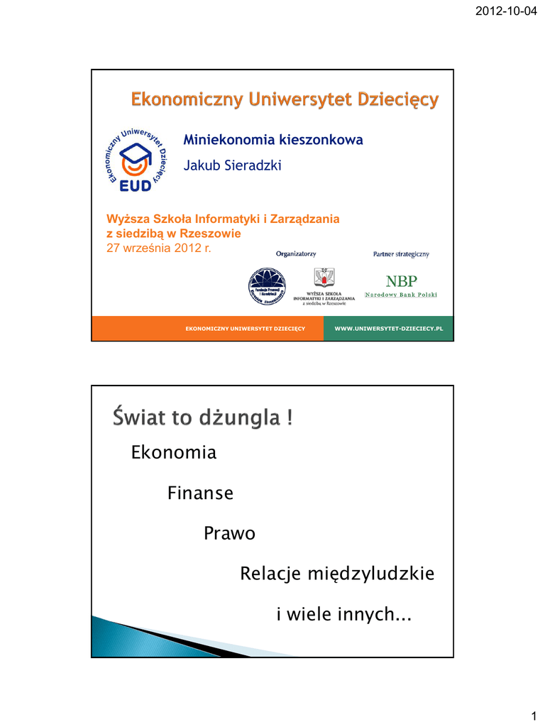 2012-10-04 Miniekonomia kieszonkowa Jakub Sieradzki Wyższa Szkoła Informatyki i Zarządzania z siedzibą w Rzeszowie 27 września 2012 r. EKONOMICZNY UNIWERSYTET DZIECIĘCY WWW.UNIWERSYTET-DZIECIECY.PL Ekonomia Finanse Prawo Relacje międzyludzkie i wiele innych... 1 2012-10-04 Wychowa dziecko na „porządnego człowieka” Nauczy dziecko myśleć samodzielnie Poruszać się w świecie (tym ekonomicznym też!) Państwo? Szkoła? Społeczeństwo? Kościół? 2 2012-10-04 Dzieci, bądźcie posłuszne w Panu waszym rodzicom, bo to jest sprawiedliwe. Czcij ojca twego i matkę - jest to pierwsze przykazanie z obietnicą - aby ci było dobrze i abyś był długowieczny na ziemi. A [wy], ojcowie, nie pobudzajcie do gniewu waszych dzieci, lecz wychowujcie je stosując karcenie i napominanie Pańskie! Ef 6, 1-4 3 2012-10-04 Dzieci uczą się patrząc na rodziców, nie słuchając ich słów ! Powiedz mi, a zapomnę, Pokaż mi, a zapamiętam, Pozwól mi zrobić, a zrozumiem. Konfucjusz 4 2012-10-04 1. Rodzinny budżet 2. Wykorzystanie momentu 3. „Każda porażka jest nawozem sukcesu” Homo oeconomicus? Dziecko i ekonomia, czyli co dziecko powinno wiedzieć 5 2012-10-04 Dlaczego jest nam tak trudno zarządzać domowym budżetem? 6 2012-10-04 1. Pieniędzmi trzeba zarządzać a) musisz wiedzieć co robisz z pieniędzmi, b) nieważne ile zarabiasz, zawsze będzie za mało 2. Nie wydawaj więcej niż zarabiasz 3. Ostrożnie z długami! 4. Wytrwałość i konsekwencja w dążeniu do celu 5. Korzystaj z okazji i słuchaj rad 6. Rozważnie podejmuj decyzje i uważnie licz 7. UCZCIWOŚĆ! 8. Przedsiębiorczość 7 2012-10-04 1. Inwestowania a oszczędzanie 2. Sposoby inwestowania 3. Ryzyko 4. Porażka 8 2012-10-04 To, co jest roztropnością w prywatnym życiu każdej rodziny, nie może być chyba szaleństwem w życiu wielkiego królestwa. Adam Smith, „Badania nad naturą i przyczynami bogactwa narodów” 1. 2. Podatki (M. Friedman: „Nie istnieje coś takiego jak darmowe obiady”) Równowaga budżetowa (czy można wiecznie żyć na kredyt?) 3. Bezrobocie 4. Inflacja 9 2012-10-04 Metoda zarządzania finansami (nauka przez praktykę) Sposób na kształtowanie odpowiedzialności 10 2012-10-04 1. Wypłacane tego samego dnia! 2. „Wyda na co zechce” czyli konsekwencja 3. Wydatki i oszczędności 4. Kieszonkowe a obowiązki domowe 5. Kieszonkowe a wiek 1. 2. 3. 4. 5. 6. 7. Ubóstwo Nieefektywność Ryzyko bankructwa Duże zagrożenie oszustwami Straty dla rodzin i dla państwa Psychiczne i społeczne ... 11 2012-10-04 12
