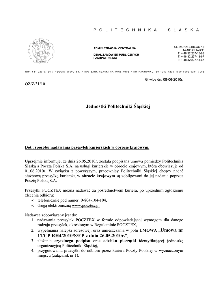 P O L I T E C H N I K A Ś L Ą S K A UL. KONARSKIEGO 18 44-100 GLIWICE T: + 48 32 237-15-83 T: + 48 32 237-13-67 F: + 48 32 237-13-67 ADMINISTRACJA CENTRALNA DZIAŁ ZAMÓWIEŃ PUBLICZNYCH I ZAOPATRZENIA NIP: 631-020-07-36 / REGON: 000001637 / ING BANK ŚLĄSKI SA O/GLIW ICE / NR RACHUNKU: 60 1050 1230 1000 0002 0211 3056 Gliwice dn. 08-06-2010r. OZ/Z/31/10 Jednostki Politechniki Śląskiej Dot.: sposobu nadawania przesyłek kurierskich w obrocie krajowym. Uprzejmie informuje, Ŝe dnia 26.05.2010r. została podpisana umowa pomiędzy Politechniką Śląską a Pocztą Polską S.A. na usługi kurierskie w obrocie krajowym, która obowiązuje od 01.06.2010r. W związku z powyŜszym, pracownicy Politechniki Śląskiej chcący nadać słuŜbową przesyłkę kurierską w obrocie krajowym są zobligowani do jej nadania poprzez Pocztę Polską S.A. Przesyłki POCZTEX moŜna nadawać za pośrednictwem kuriera, po uprzednim zgłoszeniu zlecenia odbioru: • telefonicznie pod numer: 0-804-104-104, • drogą elektroniczną www.pocztex.pl Nadawca zobowiązany jest do: 1. nadawania przesyłek POCZTEX w formie odpowiadającej wymogom dla danego rodzaju przesyłek, określonym w Regulaminie POCZTEX, 2. wypełniania nalepki adresowej, oraz umieszczania w polu UMOWA „Umowa nr 17/CP RH4/2010/S/EP z dnia 26.05.2010r.”, 3. złoŜenia czytelnego podpisu oraz odcisku pieczątki identyfikującej jednostkę organizacyjną Politechniki Śląskiej, 4. przygotowania przesyłki do odbioru przez kuriera Poczty Polskiej w wyznaczonym miejscu (załącznik nr 1). Poczta Polska S.A. dla przesyłek o masie do 1kg zapewnia bezpłatną kopertę firmową POCZTEX w formacie B4 (250x353mm). Koperty POCZTEX oraz nalepki adresowe moŜna pobrać bezpłatnie w kaŜdym urzędzie pocztowym. Więcej informacji dotyczących świadczenia usług kurierskich (POCZTEX), moŜna odnaleźć w Regulaminie świadczenia usług pocztowych POCZTEX w obrocie krajowym (załącznik nr 2). Prosimy o zapoznanie wszystkich pracowników jednostki z niniejszym pismem. Załącznik Nr 1 – Wykaz punktów nadawczych usług kurierskich – 01.06.2010r. Załącznik Nr 2 – Regulamin usług kurierskich POCZTEX w obrocie krajowym – 01.06.2010r. W/w załączniki dostępne są na stronie internetowej Działu Zamówień Publicznych i Zaopatrzenia. Kopia: OZ – a/a
