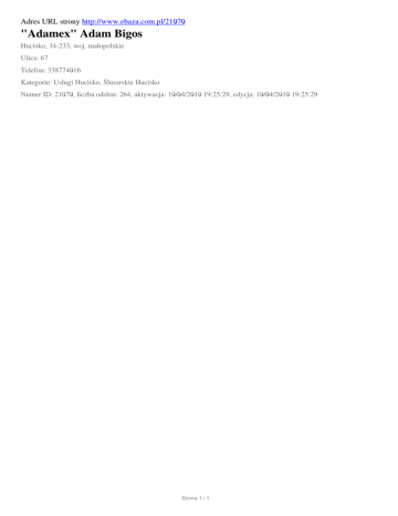 Adres URL strony http://www.ebaza.com.pl/21070 "Adamex" Adam Bigos Hucisko, 34-233, woj. małopolskie Ulica: 67 Telefon: 338774016 Kategorie: Usługi Hucisko, Ślusarskie Hucisko Numer ID: 21070, liczba odsłon: 264, aktywacja: 10/04/2010 19:25:29, edycja: 10/04/2010 19:25:29 Strona 1 / 1