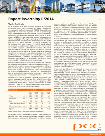 Raport kwartalny II/2014 Wyniki działalności W II kwartale 2014 roku stabilnie utrzymał się korzystny, wzrostowy trend zapoczątkowany w marcu, przynajmniej w większości działów biznesowych PCC SE. Skonsolidowane przychody ze sprzedaży wyniosły 172 mln €, przekraczając wynik poprzedniego kwartału o 19 mln €. Narastająco do końca pierwszego półrocza skonsolidowane przychody ze sprzedaży osiągnęły 325 mln €, co odpowiada wartości z analogicznego okresu ubiegłego roku. Zysk operacyjny przed odsetkami, opodatkowaniem, umorzeniem i amortyzacją (EBITDA) zwięk szył się o 14,7 mln €, osiągając 22,6 mln € narastająco do 30 czerwca 2014 roku (wobec 19,5 mln € przed rokiem). Wynik przed opodatkowaniem (EBT) wzrósł o 5 mln € kwartał do kwartału, osiągając + 3,2 mln € (rok wcześniej: – 1,3 mln €). Obydwa wskaźniki nieznacznie przekroczyły aktualną prognozę na bieżący rok obrotowy 2014. Oprócz pozytywnej dynamiki działalności operacyjnej w większości poszczególnych spółek portfelowych, wśród powodów tej korzystnej tendencji należy wymienić debiut PCC Rokita SA z Brzegu Dolnego na Giełdzie Papierów Wartościowych w Warszawie, do którego doszło w czerwcu 2014 roku (str. 2 raportu kwartalnego). Konflikt pomiędzy Rosją a Ukrainą także w II kwartale 2014 roku nie miał większego wpływu na wyniki działalności Grupy PCC. W segmencie handlu surowcami nawet zwiększyliśmy w II kwar tale wolumen importu z Rosji, podobnie jak w poprzednich kwartałach. Spadająca sprzedaż w tych krajach oraz utrzymujące się straty operatora wagonów ZAO PCC Rail z Moskwy wynikają ze spowolnienia gospodarczego na tamtych rynkach, i nie mają związku z konfliktem na linii Rosja-Ukraina. Osiągając przychody na poziomie 154 mln € w II kwartale 2014 roku, a narastająco do 30 czerwca 2014 roku 291 mln €, Pion Chemii Grupy PCC niezmiennie wniósł największy wkład w przychody ze sprzedaży i również istotny wkład w wynik finansowy. Jeżeli chodzi o poszczególne segmenty wewnątrz tego pionu, wyniki prezentują się następująco: Pion Chemii Przychody II kw. 2014 I-II kw. 2014 EBITDA II kw. 2014 I-II kw. 2014 Poliole mln € 36,3 70,8 2,5 4,5 Surfaktanty mln € 25,6 49,5 1,5 3,3 Chlor mln € 17,2 34,4 2,0 4,2 Chemia specjalistyczna mln € 64,2 114,7 0,8 1,6 Dobra konsumpcyjne mln € 10,3 21,3 0,4 0,6 Ogółem mln € 153,6 290,7 7,2 14,2 Uwaga: Możliwe różnice z zaokrąglenia. Wskaźniki są niezbadane. W segmencie polioli dynamika działalności była również w II kwartale 2014 roku mniej więcej zgodna z planem. Ponadto kontynuowano rozszerzanie działalności w zakresie dostaw [1] systemów poliuretanowych: Nowa spółka zależna PCC Prodex GmbH z siedzibą w Essen, założona niedawno przez PCC Prodex Sp. z o.o. z Warszawy, rozpoczęła w maju 2014 roku aktywną działalność gospodarczą na niemieckim rynku. Obecnie spółka ta zajmuje się dystrybucją systemów poliuretanowych wyprodukowanych w zakładach produkcyjnych w Polsce. Rozpoczęcie produkcji w Essen zaplanowano na drugą połowę 2014 roku. W dziale biznesowym surfaktantów, firmie PCC Exol SA z Brzegu Dolnego udało się zwiększyć zarówno wolumen jak i ceny sprzedaży w porównaniu z poprzednim kwartałem, w wyniku czego spółka poprawiła swoje wyniki operacyjne. Tym niemniej wynik finansowy tej spółki portfelowej – jak również całego segmentu surfaktantów – pozostał w pierwszym półroczu poniżej naszych oczekiwań. Powodem tego są m.in. koszty wspomnianego w poprzednim raporcie kwartalnym projektu PCC Exol SA w zakresie surowców odnawialnych, które obcią żyły wynik finansowy tej spółki portfelowej w II kwartale. Ponadto wyniki amerykańskiej spółki zależnej PCC Chemax, Inc., Piedmont (SC), pozostały w ubiegłych miesiącach poniżej planu. Dział chloru dobrze sobie radził w II kwartale mimo utrzymujących się niskich cen sody kaustycznej, względnie ługu sodowego jako produktu pochodnego, i zakończył zarówno ubiegły kwartał jak i pierwszą połowę 2014 roku z zyskiem i powyżej naszych oczekiwań. W spółkach portfelowych wchodzących w skład segmentu chemii specjalistycznej, w II kwartale 2014 roku znowu odnotowaliśmy bardzo zróżnicowaną dynamikę działalności. Podczas gdy działalność w handlu surowcami prowadzona przez spółki portfelowe PCC Trade & Services GmbH (dawniej Petro Carbo Chem GmbH) z Duisburga oraz PCC Morava Chem s.r.o., Czeski Cieszyn (Czechy) odnosiła sukcesy, zarówno dział fosforo- i naftalenopochodnych (PCC Rokita SA) jak i producent alkilofenoli PCC Synteza S.A. z Kędzierzyna-Koźla wciąż ponosiły straty. W szczególności, ta ostatnia spółka portfelowa ucierpiała za sprawą wysokich, w porównaniu z obecnymi warunkami rynkowymi, cen zakupu surowców znajdujących się w zapasach, przy niezmiennie słabym rynku zbytu alkilofenoli. W międzyczasie spółce udało się przynajmniej wynegocjować lepsze warunki zakupowe na najbliższe miesiące. Natomiast sprzedaż fosforo- i naftalenopochodnych została w II kwartale 2014 roku prowadzona niezmiennie przeważnie przy niskich marżach. Ze względu na przedłużające się procedury dopusz czeniowe po stronie potencjalnych odbiorców nie udało się zwiększyć, w zaplanowanej skali, udziału produktów o wyższej wartości dodanej, natomiast prace w tym zakresie zostaną zintensyfikowane w przyszłości. Przychody i wyniki finansowe kopalni kwarcytu PCC Silicium S.A. z Zagórza pozostały w II kwartale ogólnie poniżej naszych oczekiwań, m.in. z powodu okresu złej pogody w maju 2014 roku. Tym niemniej ta spółka portfelowa zakończyła zarówno II kwartał jak i pierwszą połowę 2014 roku z niewielkim operacyjnym zyskiem. Wyniki finansowe Grupy PCC Consumer Products wypadły lepiej niż w I kwartale 2014 roku, tym niemniej również pozostały poniżej prognozy. www.pcc.eu Głównymi powodami tego były zmiany w ofercie