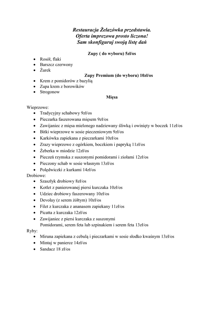 Restauracja Żelazówka przedstawia. Oferta imprezowa prosto liczona! Sam skonfiguruj swoją listę dań Rosół, flaki Barszcz czerwony Żurek Zupy ( do wyboru) 5zł/os Zupy Premium (do wyboru) 10zł/os Krem z pomidorów z bazylią Zupa krem z borowików Strogonow Mięsa Wieprzowe: Tradycyjny schabowy 9zł/os Pieczarka faszerowana mięsem 9zł/os Zawijaniec z mięsa mielonego nadziewany śliwką i owinięty w boczek 11zł/os Bitki wieprzowe w sosie pieczeniowym 9zł/os Karkówka zapiekana z pieczarkami 10zł/os Zrazy wieprzowe z ogórkiem, boczkiem i papryką 11zł/os Żeberka w miodzie 12zł/os Pieczeń rzymska z suszonymi pomidorami i ziołami 12zł/os Pieczony schab w sosie własnym 13zł/os Polędwiczki z kurkami 14zł/os Drobiowe: Szaszłyk drobiowy 8zł/os Kotlet z panierowanej piersi kurczaka 10zł/os Udziec drobiowy faszerowany 10zł/os Devolay (z serem żółtym) 10zł/os Filet z kurczaka z ananasem zapiekany 11zł/os Picatta z kurczaka 12zł/os Zawijaniec z piersi kurczaka z suszonymi Pomidorami, serem feta lub szpinakiem i serem feta 13zł/os Ryby: Miruna zapiekana z cebulą i pieczarkami w sosie słodko kwaśnym 13zł/os Mintaj w panierce 14zł/os Sandacz 18 zł/os Inne Pierogi do wyboru (ruskie, z mięsem lub z kapustą i grzybami) 10zł/os Krokiety z mięsem lub z kapustą i grzybami 10zł/os Pierogi i krokiety 15zł/os Babeczki z pieczarkami i serem 5zł/os Dodatki Ziemniaki z wody z koperkiem 4zł/os Ziemniaki zapiekane w ziołach 6zł/os Smażone Tarkami ziemniaczane 7zł/os Kluseczki szpinakowe z sosem pieczarkowym 6zł/os Kluski śląskie w sosie pieczeniowym 5zł/os Bukiet surówek (surówka z białej i czerwonej kapusty lub surówka z marchewki i jabłka) 5zł/os Warzywa na ciepło (brokuł, kalafior lub mini marchewki) 7 zł/os Przystawki (jeden rodzaj 4 zł/os, dwa rodzaje sałatek to jedna przystawka) Półmisek wędlin i mięs pieczonych Rolada łososiowa ze szpinakiem Ryba w galarecie na słodko-kwaśno Jajka faszerowane (pieczarki, łosoś) Śledź w oleju/Śledź po sułtańsku Tymbaliki drobiowe Tortilla z farszem serowo – drobiowo - warzywnym Melon z szynką szwarcwaldzką i balsamico Sałatka grecka Sałatka pieczarkowa Sałatka z kurczaka curry Sałatka brokułowa z migdałami Sałatka hawajska z kurczakiem i ananasem Sałtka jarzynowa Koreczki Koktajlowe ( 5,5zł od osoby) Koreczki „Italiano” z ananasem, suszonymi pomidorami, oliwkami, szynką parmeńską Koreczki „ norweskie” z serami pleśniowymi, łososiem i kabanosem Ciasta do wyboru - 6zł/os ( dwa rodzaje ), 10zł/os (cztery rodzaje na dużych paterach), owoce 3zł/os Sernik Ciasto Hali WZ-etka Tiramisu Szarlotka Pychotka Napoje gazowane, soki, kawa herbata – 8zł/os Jeśli mają Państwo swoje propozycje potraw, których nie zawarliśmy w menu, również jesteśmy otwarci na propozycję! Muzyka w lokalu, godziny i przebieg imprezy Standardowa muzyka w tle nie jest wliczana w koszty imprezy Oprawa muzyczna z DJ i światłami dyskotekowymi kosztuje 300zł Imprezy okolicznościowe przewidziane są do godziny 1 w nocy ( z wyjątkiem wesel) Salą na wyłączność – powyżej 40 osób Dzieci Do 3 lat – 0zł Od 3 lat do 10 lat 50% stawki Powyżej 10 lat 100% stawki Przykładowa oferta na 82 zł/os I danie (34zł) Rosół, flaki 5zł Kotlet schabowy 9zł Devolay 10zł Ziemniaki z wody 4zł Bukiet surówek 5zł II danie (23zł) Karkówka zapiekana z pieczarkami 10zł Kluski szpinakowe z sosem 6zł Brokuł i kalafior na parze 7zł Przystawki (12zł) Talerz wędlin 4zł Jaja faszerowane 4zł Sałatka grecka 2zł Sałatka z kurczakiem curry 2zł Ciasta Sernik i szarlotka 6zł Napoje gazowane, soki, kawa herbata 8zł (dokładane w trakcie trwania imprezy)
