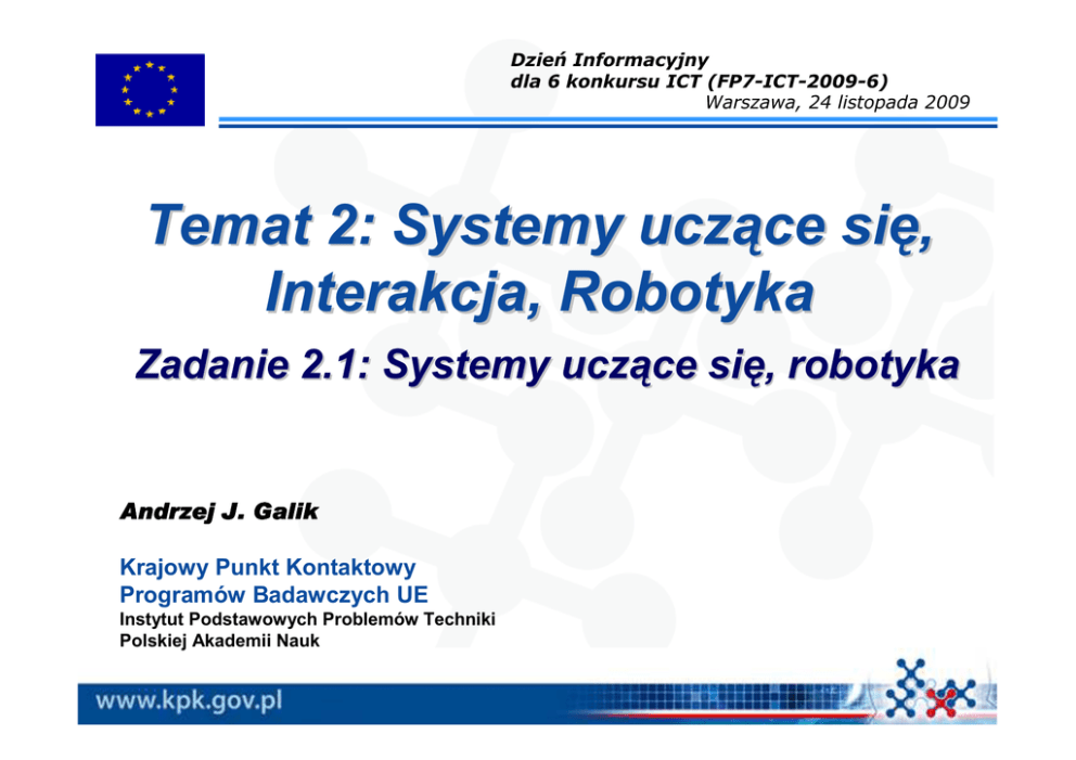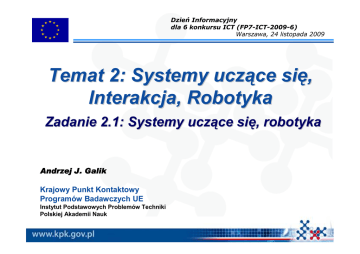 Dzień Informacyjny dla 6 konkursu ICT (FP7-ICT-2009-6) Warszawa, 24 listopada 2009 Temat 2: Systemy uczące się, Interakcja, Robotyka Zadanie 2.1: Systemy uczące się, robotyka Andrzej J. Galik Krajowy Punkt Kontaktowy Programów Badawczych UE Instytut Podstawowych Problemów Techniki Polskiej Akademii Nauk 7 Program Ramowy dla Badań, Rozwoju Technologicznego i Demonstracji (FP7). ICT Themes Obszary tematyczne Challenge 1: Pervasive and Trusted Network and Service Infrastructures Challenge 2: Cognitive Systems, Interaction, Robotics Challenge 3: Components, systems, engineering Challenge 4: Digital Libraries and Content Challenge 5: Towards sustainable and personalised healthcare Challenge 6: ICT for Mobility, Environmental Sustainability and Energy Efficiency Challenge 7: ICT for Independent Living and Inclusion Future and Emerging Technologies Horizontal Actions Challenge 2 Cognitive Systems, Interaction, Robotics Objective 2.1:Cognitive Systems and Robotics Systemy samouczące się – Główne oczekiwania: Tworzyć artificial systems które są: more robust, more adaptive more effective, more natural, cooperative, etc Potrafią radzić sobie bez ograniczeń w sytuacjach ze świata rzeczywistego O jaki rodzaj badań chodzi? Dot. nowych teorii Nowych samouczących się architektur/rozwiązań Działających prototypów W jaki sposób osiągnąć te cele? W oparciu o bio-inspiracje Maszynowe uczenie Poprzez nowe formy (inteligentnego) sterowania Nowe metody matematyczne …. Challenge 2 Cognitive Systems, Interaction, Robotics Objective 2.1:Cognitive Systems and Robotics Robotyka – Główne oczekiwania: Robotyka przemysłowa przenosi się z „cięŜkiego” sektora samochodowego w kierunku wspomagania zadań w przemyśle lŜejszym Robotyka usługowa reprezentuje równieŜ nowe produkty i zastosowania: 63,000 robotów wykonujących profesjonalne usługi zostało zainstalowanych do końca 2008 r. Ok.. 4.4 miliona domestic service robots & 2.8 million entertainment and leisure robotów zostanie zainstalowanych do końca 2009 r. Przewidywania na lata 2009 – 2012: O 49,000 więcej usług świadczonych przez roboty (profesjonalnie) O 11.6 milionów więcej usług świadczonych przez roboty na uŜytek prywatny Challenge 2 Cognitive Systems, Interaction, Robotics Objective 2.1:Cognitive Systems and Robotics Strategiczny Plan Badań (European Technology Platform for Robotics): Wspomaganie prac przez roboty w środowisku przemysłowym Bezpośrednia współpraca z pracownikiem Współdzielenie miejsca pracy bez ogrodzenia zabezpieczającego … Wizja rozwoju robotyki w czasie: Krótkoterminowa (2010) Safe interaction (actively supervised); passively compliant arms (pneumatics) Średnioterminowa (2015) Długoterminowa (2020+) Intuitive interaction, passively compliant arms (mechatronics) Cognition (co-worker modelling); avoiding critical situations by situation assessment /prediction Challenge 2 Cognitive Systems, Interaction, Robotics Objective 2.1:Cognitive Systems and Robotics Oczekiwane rezultaty: Specific target (a) (b) New approaches towards understanding and solving key issues related related to the engineering of artificial cognitive systems. ROBOTICS: New approaches towards endowing robots with advanced perception and action capabilities, capabilities, and towards developing pertinent benchmarks and tests. Project type Call STREP 6 STREP 4 (c) New ways of designing and implementing complete robotic systems. IP 6 (d) COGNITIVE SYSTEMS: New, scientifically grounded system architectures integrating communication, control, and cognitive capabilities. IP 4 (e) A framework to facilitate crosscross-fertilisation between academic and industrial research efforts in in robotics. IP 6 (f) COGNITION NETWORK: A 'Virtual Institute' Institute' integrating diverse research areas that contribute to understanding understanding cognitive systems and designing useful new ones. NoE 4 ROBOTICS INFO EXCHANGES: CoCo-ordinated coco-operation and communication within a multidisciplinary robotics community in Europe. CA 4 CoCo-ordinated coco-operation and communication within a multidisciplinary artificial artificial cognitive systems research community in Europe. CA 6 (g) (h) Challenge 2 Cognitive Systems, Interaction, Robotics Objective 2.1:Cognitive Systems and Robotics Wyzwania w zakresie B+R: A) Nowe podejście do artificial cognitive systems: Tematy do rozwiązania: Zrozumienie obiektów i środowiska: rozpoznanie / zdolność określenia obiektów, zdarzeń, sytuacji i zachowań w realnym, skalowalnym środowisku, Zdefiniowanie roli oraz wdroŜenie metod wykorzystania pamięci i sposobu uczenia się w tworzonych systemach, Zdolność do aktywnego dostosowywanie się w realiach nie do końca określonego środowiska pracy, Challenge 2 Cognitive Systems, Interaction, Robotics Objective 2.1:Cognitive Systems and Robotics Wyzwania w zakresie B+R: C) Nowe sposoby projektowania i wdraŜania complete robotic systems: Systemów, które powinny działać autonomicznie w swobodnie oktreślonym dynamicznym środowisku w bezpośredniej i ścisłej współpracy z człowiekiem. Systemy, które mogą być rozpowszechniane, a powinny integrować: bogate właściwości manipulacji z wykorzystaniem sygnałów z czujników (np.. grasping, manipulation, locomotion) wysoko rozwinięte właściwości działania / samo-uczenia się (np. reasoning, planning and decision-making). A więc te systemy powinny być bardziej robust, dependable, flexible and adaptive, oraz safer niŜ dzisiaj, Systemy te powinny mieć zdolność poprawy ich działania poprzez zdolność uczenia się. Challenge 2 Cognitive Systems, Interaction, Robotics Objective 2.1:Cognitive Systems and Robotics Wyzwania w zakresie B+R: E) Nakreślenie ram współpracy i cross-fertilisation between academic and industrial programów badawczych in robotics: poprzez szeroko prowadzone badania i eksperymenty z wykorzystaniem silnych partnerów z przemysłu przy wykor