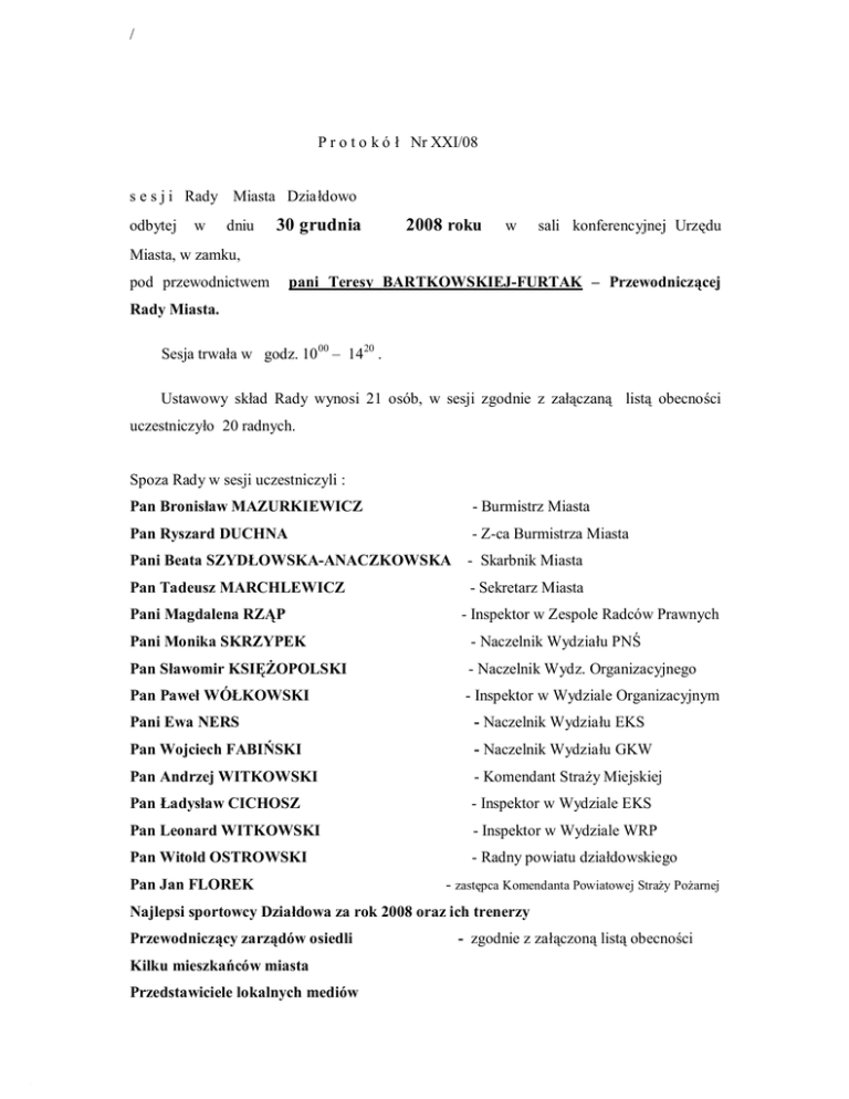 / P r o t o k ó ł Nr XXI/08 s e s j i Rady Miasta Działdowo odbytej w dniu 30 grudnia 2008 roku w sali konferencyjnej Urzędu Miasta, w zamku, pod przewodnictwem pani Teresy BARTKOWSKIEJ-FURTAK – Przewodniczącej Rady Miasta. Sesja trwała w godz. 10 00 – 1420 . Ustawowy skład Rady wynosi 21 osób, w sesji zgodnie z załączaną listą obecności uczestniczyło 20 radnych. Spoza Rady w sesji uczestniczyli : Pan Bronisław MAZURKIEWICZ - Burmistrz Miasta Pan Ryszard DUCHNA - Z-ca Burmistrza Miasta Pani Beata SZYDŁOWSKA-ANACZKOWSKA - Skarbnik Miasta Pan Tadeusz MARCHLEWICZ - Sekretarz Miasta Pani Magdalena RZĄP - Inspektor w Zespole Radców Prawnych Pani Monika SKRZYPEK - Naczelnik Wydziału PNŚ Pan Sławomir KSIĘŻOPOLSKI - Naczelnik Wydz. Organizacyjnego Pan Paweł WÓŁKOWSKI - Inspektor w Wydziale Organizacyjnym Pani Ewa NERS - Naczelnik Wydziału EKS Pan Wojciech FABIŃSKI - Naczelnik Wydziału GKW Pan Andrzej WITKOWSKI - Komendant Straży Miejskiej Pan Ładysław CICHOSZ - Inspektor w Wydziale EKS Pan Leonard WITKOWSKI - Inspektor w Wydziale WRP Pan Witold OSTROWSKI - Radny powiatu działdowskiego Pan Jan FLOREK - zastępca Komendanta Powiatowej Straży Pożarnej Najlepsi sportowcy Działdowa za rok 2008 oraz ich trenerzy Przewodniczący zarządów osiedli Kilku mieszkańców miasta Przedstawiciele lokalnych mediów - zgodnie z załączoną listą obecności 2 Przed rozpoczęciem sesji jej uczestnicy wysłuchali dwudziestominutowego koncertu Zespołu MJUT. Przebieg sesji Pkt 1 Pani Teresa BARTKOWSKA-FURTAK – Przewodnicząca Rady Miasta otworzyła sesję, powitała jej uczestników oraz stwierdziła prawomocność obrad Ad pkt 2 Pani Teresa BARTKOWSKA-FURTAK - Przewodnicząca Rady: Na wniosek Burmistrza proponuję włączenie do porządku obrad jako punktu 22 – podjecie uchwały w sprawie nabycia zabudowanej nieruchomości położonej w Działdowie przy ul. Wolności 64. Ponadto proponuję rozpatrzenie punktu 8 jako punktu 3. Rada 19 głosami „za”, tj. jednomyślnie wyraziła zgodę na powyższe zmiany, po czym przystąpiła do realizacji porządku dziennego sesji, w następującym brzmieniu : 1. Otwarcie sesji i stwierdzenie jej prawomocności. 2. Zmiany w porządku dziennym sesji. 3. PREZENTACJA NAJLEPSZYCH SPORTOWCÓW DZIAŁDOWA ZA ROK 2008. 4. Sprawozdanie Przewodniczącej Rady o działaniach podejmowanych w okresie miedzysesyjnym. 5. Sprawozdanie z działalności Burmistrza w okresie miedzysesyjnym, zwłaszcza z wykonania uchwał Rady. 6. Sprawozdanie przedstawicieli Gminy z i stowarzyszenia gmin. działalności związków miedzygminnych 3 7. Sprawozdanie z prac Komisji w okresie miedzysesyjnym. 8. Interpelacje radnych i zapytania. 9. Podjecie uchwały w sprawie zaciągnięcia długoterminowego kredytu na pokrycie deficytu na rok 2008. 10. Podjecie uchwały w sprawie zmian w budżecie miasta na rok 2008. 11. Podjecie uchwały w sprawie ustalenia wykazu wydatków inwestycyjnych i nieinwestycyjnych niewygasających z końcem roku 2008. 12. Podjęcie uchwały w sprawie budżetu miasta na rok 2009. 13. Podjecie uchwały zmieniającej uchwałę w sprawie pomocy finansowej dla Powiatu Działdowskiego. 14. Podjecie uchwały w sprawie wyrażenia zgody na oddanie w nieodpłatne użytkowanie na czas nieoznaczony nieruchomości zabudowanej położonej w Działdowie przy ul. Marii Skłodowskiej-Curie 20. 15. Podjecie uchwały w sprawie zmiany Wieloletniego Planu Inwestycyjnego Miasta Działdowo na lata 2006-2009 z projekcją do roku 2011. 16. Podjecie uchwały zmieniającej uchwałę Nr XII/203/99 Rady Miejskiej w Działdowie z dnia 28 grudnia 1999r. w sprawie sprzedaży lokali mieszkalnych stanowiących własność Gminy Miejskiej w Działdowie oraz udzielania bonifikat. 17. Podjecie uchwały w sprawie ustalenia planu potrzeb Gminy-Miasto Działdowo w zakresie wykonywania prac społecznie użytecznych na rok 2009. 18. Podjecie uchwały w sprawie ustalenia wartości najniższego wynagrodzenia zasadniczego oraz wartości jednego punktu dla potrzeb opracowania tabeli miesięcznych stawek wynagrodzenia zasadniczego dla pracowników nie będących nauczycielami zatrudnionych w szkołach i przedszkolach prowadzonych przez Gminę-Miasto Działdowo. 19. Podjecie uchwały w sprawie uchylenia uchwały Nr XVIII/212/08 Rady Miasta Działdowo z dnia 16października 2008r. w sprawie upoważnienia Dyrektora miejskiego Ośrodka 4 Pomocy Społecznej w Działdowie do podejmowania działań wobec dłużników alimentacyjnych. 20. Podjecie uchwały w sprawie uchwalenia rocznego programu współpracy z organizacjami pozarządowymi. 21. Podjecie uchwały zmieniającej uchwałę w sprawie ustalenia zasad i wysokości diet dla radnych Rady Miasta Działdowo i dla przewodniczących zarządów osiedli – organów wykonawczych jednostek pomocniczych Gminy-Miasto Działdowo oraz określenia stawek za jeden kilometr przebiegu pojazdu samochodowego użytego do celów służbowych przez radnego Rady Miasta Działdowo nie będącego własnością Gminy-Miasto Działdowo. 22. Podjecie uchwały w sprawie nabycia zabudowanej nieruchomości położonej w Działdowie przy ul. Wolności 64. 23. Odpowiedzi na zapytania. 24. Wolne wnioski i informacje. Ad pk t 3 PREZENTACJA NAJLEPSZYCH SPORTOWCÓW DZIAŁDOWA ZA ROK 2008: Pan Ładysław CICHOSZ - Inspektor w Wydziale EKS: Pani Przewodnicząca, panie Burmistrzu, Szanowni państwo radni, Szanowni goście. Po raz kolejny, już trzydziesty któryś przypadł mi w udziale zaszczyt zaprezentowania przed tak wielkim audytorium najlepszych sportowców Działdowa za mijający 2008 rok. Tradycją naszą od kilku już lat jest także prezentacja najlepszych sportowych talentów, tzn. tych młodych sportowców, którzy już w niedalekiej przyszłości będą mieli szansę zaistnieć na arenach sportowych nie tylko naszego miasta, powiatu, województwa , ale także i na arenach krajowych, a może i na arenach międzynarodowych. Drodzy państwo, nasze plebiscyty to bogata h
