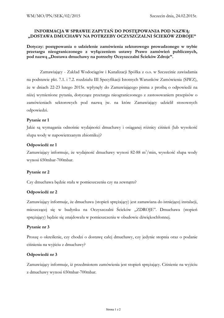 WM/MO/PN/SEK/02/2015 Szczecin dnia, 24.02.2015r. INFORMACJA W SPRAWIE ZAPYTAŃ DO POSTĘPOWANIA POD NAZWĄ: „DOSTAWA DMUCHAWY NA POTRZEBY OCZYSZCZALNI ŚCIEKÓW ZDROJE” Dotyczy: postępowania o udzielenie zamówienia sektorowego prowadzonego w trybie przetargu nieograniczonego z wyłączeniem ustawy Prawo zamówień publicznych, pod nazwą „Dostawa dmuchawy na potrzeby Oczyszczalni Ścieków Zdroje”. Zamawiający - Zakład Wodociągów i Kanalizacji Spółka z o.o. w Szczecinie zawiadamia na podstawie pkt. 7.1. i 7.2. rozdziału III Specyfikacji Istotnych Warunków Zamówienia (SIWZ), że w dniach 22-23 lutego 2015r. wpłynęły do Zamawiającego pisma z prośbą o odpowiedź na niżej wymienione pytania, dotyczące przetargu nieograniczonego z zastosowaniem przepisów o zamówieniach sektorowych pod nazwą jw. na które Zamawiający udzielił stosownych odpowiedzi. Pytanie nr 1 Jakie są wymagania odnośnie wydajności dmuchawy i osiąganej różnicy ciśnień (lub wysokość słupa wody w napowietrzanym zbiorniku)? Odpowiedź nr 1 Zamawiający informuje, że wydajność dmuchawy wynosi 82-88 m3/min, wysokość słupa wody wynosi 650mbar-700mbar. Pytanie nr 2 Czy dmuchawa będzie stała w pomieszczeniu czy na zewnątrz? Odpowiedź nr 2 Zamawiający informuje, że dmuchawa (stopień sprężający) jest zamawiana do istniejącej instalacji, mieszczącej się w budynku na Oczyszczalni Ścieków „ZDROJE”. Dmuchawa (stopień sprężający) będzie się znajdowała w pomieszczeniu w obudowie dźwiękochłonnej. Pytanie nr 3 Proszę o określenie, czy chodzi o dostawę całej dmuchawy, czy jedynie stopnia oraz o podanie ciśnienia na wyjściu z dmuchawy? Odpowiedź nr 3 Zamawiający informuje, iż przedmiotem zamówienia jest stopień sprężający. Ciśnienie na wyjściu z dmuchawy wynosi 650mbar-700mbar. Strona 1 z 2 WM/MO/PN/SEK/02/2015 Szczecin dnia, 24.02.2015r. Pytanie nr 4 Proszę o podanie wymaganej wydajności maksymalnej (w m3/min lub m3/h) i nadciśnienia /sprężu (bar lub kPa) oraz mocy pobieranej przez silnik (z odczytu z falownika przy maksymalnej wydajności) i mocy zainstalowanego silnika dla wymaganej dmuchawy Aerzen GM90S oraz kartę katalogową zespołu sprężającego? Odpowiedź nr 4 Zamawiający informuje, że wymagana wydajność dmuchawy wynosi 82-88 m3/min przy wysokości słupa wody 650mbar-700mbar. Moc pobierana przez silnik (z odczytu z falownika przy maksymalnej wydajności) wynosi 135 kW. Moc zainstalowanego silnika dla wymaganej dmuchawy Aerzen GM90S wynosi 160 kW. Pytanie nr 5 Czy jest możliwość złożenia oferty na dostawę dmuchawy innego producenta o takich samych parametrach? Odpowiedź nr 5 Zamawiający informuje, że nie wyraża zgody na dostawę dmuchawy innego producenta. Dmuchawa (stopień sprężający) będzie stanowił urządzenie rezerwowe przeznaczone do szybkiego montażu w stacji dmuchaw w razie awarii urządzenia obecnie pracującego w ciągu napowietrzania. Powietrze wtłaczane jest za pomocą dmuchaw powietrza prod. Aerzen typu 90S składającego się z silnika i stopnia sprężającego. Zakup stopnia sprężającego innej firmy spowodowałby konieczność wymiany wielu współpracujących urządzeń oraz doprowadzonych instalacji. Zamawiający informuje, iż termin na składanie ofert oraz pozostałe terminy i postanowienia SIWZ pozostają bez zmian. Osoba upoważniona do kontaktu: p. Marta Ogrodowczyk – tel. 091 489 88 34. Strona 2 z 2