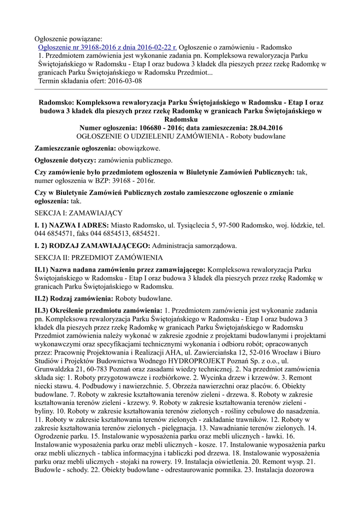 Ogłoszenie powiązane: Ogłoszenie nr 39168-2016 z dnia 2016-02-22 r. Ogłoszenie o zamówieniu - Radomsko 1. Przedmiotem zamówienia jest wykonanie zadania pn. Kompleksowa rewaloryzacja Parku Świętojańskiego w Radomsku - Etap I oraz budowa 3 kładek dla pieszych przez rzekę Radomkę w granicach Parku Świętojańskiego w Radomsku Przedmiot... Termin składania ofert: 2016-03-08 Radomsko: Kompleksowa rewaloryzacja Parku Świętojańskiego w Radomsku - Etap I oraz budowa 3 kładek dla pieszych przez rzekę Radomkę w granicach Parku Świętojańskiego w Radomsku Numer ogłoszenia: 106680 - 2016; data zamieszczenia: 28.04.2016 OGŁOSZENIE O UDZIELENIU ZAMÓWIENIA - Roboty budowlane Zamieszczanie ogłoszenia: obowiązkowe. Ogłoszenie dotyczy: zamówienia publicznego. Czy zamówienie było przedmiotem ogłoszenia w Biuletynie Zamówień Publicznych: tak, numer ogłoszenia w BZP: 39168 - 2016r. Czy w Biuletynie Zamówień Publicznych zostało zamieszczone ogłoszenie o zmianie ogłoszenia: tak. SEKCJA I: ZAMAWIAJĄCY I. 1) NAZWA I ADRES: Miasto Radomsko, ul. Tysiąclecia 5, 97-500 Radomsko, woj. łódzkie, tel. 044 6854571, faks 044 6854513, 6854521. I. 2) RODZAJ ZAMAWIAJĄCEGO: Administracja samorządowa. SEKCJA II: PRZEDMIOT ZAMÓWIENIA II.1) Nazwa nadana zamówieniu przez zamawiającego: Kompleksowa rewaloryzacja Parku Świętojańskiego w Radomsku - Etap I oraz budowa 3 kładek dla pieszych przez rzekę Radomkę w granicach Parku Świętojańskiego w Radomsku. II.2) Rodzaj zamówienia: Roboty budowlane. II.3) Określenie przedmiotu zamówienia: 1. Przedmiotem zamówienia jest wykonanie zadania pn. Kompleksowa rewaloryzacja Parku Świętojańskiego w Radomsku - Etap I oraz budowa 3 kładek dla pieszych przez rzekę Radomkę w granicach Parku Świętojańskiego w Radomsku Przedmiot zamówienia należy wykonać w zakresie zgodnie z projektami budowlanymi i projektami wykonawczymi oraz specyfikacjami technicznymi wykonania i odbioru robót; opracowanych przez: Pracownię Projektowania i Realizacji AHA, ul. Zawierciańska 12, 52-016 Wrocław i Biuro Studiów i Projektów Budownictwa Wodnego HYDROPROJEKT Poznań Sp. z o.o., ul. Grunwaldzka 21, 60-783 Poznań oraz zasadami wiedzy technicznej. 2. Na przedmiot zamówienia składa się: 1. Roboty przygotowawcze i rozbiórkowe. 2. Wycinka drzew i krzewów. 3. Remont niecki stawu. 4. Podbudowy i nawierzchnie. 5. Obrzeża nawierzchni oraz placów. 6. Obiekty budowlane. 7. Roboty w zakresie kształtowania terenów zieleni - drzewa. 8. Roboty w zakresie kształtowania terenów zieleni - krzewy. 9. Roboty w zakresie kształtowania terenów zieleni byliny. 10. Roboty w zakresie kształtowania terenów zielonych - rośliny cebulowe do nasadzenia. 11. Roboty w zakresie kształtowania terenów zielonych - zakładanie trawników. 12. Roboty w zakresie kształtowania terenów zielonych - pielęgnacja. 13. Nawadnianie terenów zielonych. 14. Ogrodzenie parku. 15. Instalowanie wyposażenia parku oraz mebli ulicznych - ławki. 16. Instalowanie wyposażenia parku oraz mebli ulicznych - kosze. 17. Instalowanie wyposażenia parku oraz mebli ulicznych - tablica informacyjna i tabliczki pod drzewa. 18. Instalowanie wyposażenia parku oraz mebli ulicznych - stojaki na rowery. 19. Instalacja oświetlenia. 20. Remont wysp. 21. Budowle - schody. 22. Obiekty budowlane - odrestaurowanie pomnika. 23. Instalacja dozorowa CCTV. 24. Polery do cumowania łodzi i 2 łodzie. 25. Pozostałe nasadzenia. 26. Remont zasuwy. 27. Ogrodzenie na mostkach nad rzeką Radomką. 28. Pozostałe elementy małej architektury. 29. Sieć wodociągowa. 30. WIFI. 31. Rozbiórka istniejącej kładki na rzece Radomce oraz budowa 3 kładek dla pieszych przez rzekę Radomkę. 3. Szczegółowy opis przedmiotu zamówienia zawierają: 1. Projekt budowlany, dotyczący kompleksowej rewaloryzacji założenia ogrodowego Parku Świętojańskiego w Radomsku opracowany przez jednostkę projektową: Pracownię Projektowania i Realizacji AHA, ul. Zawierciańska 12, 52-016 Wrocław - stanowiący dodatek nr 8 do SIWZ. 2. Projekt wykonawczy - architektura, dotyczący kompleksowej rewaloryzacji założenia ogrodowego Parku Świętojańskiego w Radomsku - stanowiący dodatek nr 9 do SIWZ. 3. Projekt wykonawczy drogi, dotyczący kompleksowej rewaloryzacji założenia ogrodowego Parku Świętojańskiego w Radomsku - stanowiący dodatek nr 10 do SIWZ. 4. Projekt wykonawczy - konstrukcja, dotyczący kompleksowej rewaloryzacji założenia ogrodowego Parku Świętojańskiego w Radomsku stanowiący dodatek nr 11 do SIWZ. 5. Projekt wykonawczy - instalacje sanitarne, dotyczący kompleksowej rewaloryzacji założenia ogrodowego Parku Świętojańskiego w Radomsku stanowiący dodatek nr 12 do SIWZ. 6. Projekt wykonawczy - instalacje elektryczne, dotyczący kompleksowej rewaloryzacji założenia ogrodowego Parku Świętojańskiego w Radomsku stanowiący dodatek nr 13 do SIWZ. 7. Projekt wykonawczy - zieleń, dotyczący kompleksowej rewaloryzacji założenia ogrodowego Parku Świętojańskiego w Radomsku - stanowiący dodatek nr 14 do SIWZ. 8. Specyfikacja techniczna wykonania i odbioru robót, dotycząca kompleksowej rewaloryzacji założenia ogrodowego Parku Świętojańskiego w Radomsku - stanowiąca dodatek nr 15 do SIWZ. 9. Projekt budowlany budowy 3 kładek dla pieszych przez rzekę Radomkę w granicach Parku Świętojańskiego wraz z opisem zakresu i sposobu prowadzenia robót rozbiórkowych, opracowanych przez jednostkę projektową: Biuro Studiów i Projektów Budownictwa Wodnego HYDROPROJEKT Poznań Sp. z o.o., ul. Grunwaldzka 21, 60-783 Poznań - stanowiący dodatek nr 16 do SIWZ. 10. Projekt wykonawczy budowy 3 kładek dla pieszych przez rzekę Radomkę w granicach Parku Świętojańskiego - stanowiący dodatek nr 17 do SIWZ. 11. Specyfikacja techniczna wykonania i odbioru robót budowlanych, dotycząca budowy 3 kładek dla pieszych przez rzekę Radomkę w granicach Parku Świętojańskiego - stanowiąca dodatek n