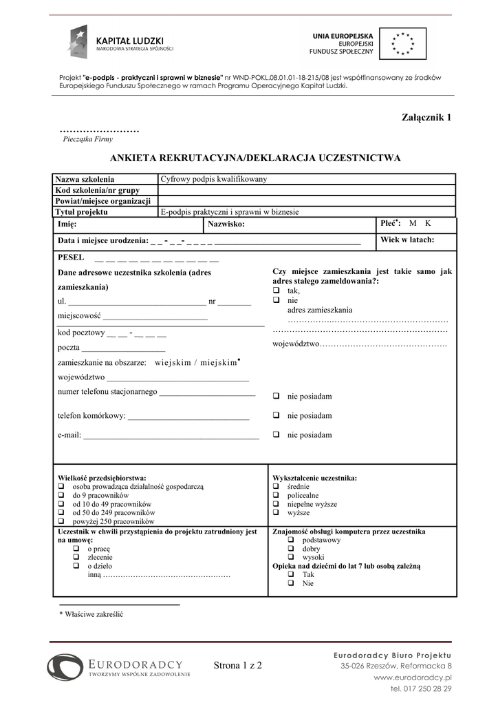 Projekt "e-podpis - praktyczni i sprawni w biznesie" nr WND-POKL.08.01.01-18-215/08 jest współfinansowany ze środków Europejskiego Funduszu Społecznego w ramach Programu Operacyjnego Kapitał Ludzki. Załącznik 1 …………………… Pieczątka Firmy ANKIETA REKRUTACYJNA/DEKLARACJA UCZESTNICTWA Nazwa szkolenia Kod szkolenia/nr grupy Powiat/miejsce organizacji Tytuł projektu Imię: Cyfrowy podpis kwalifikowany E-podpis praktyczni i sprawni w biznesie Nazwisko: Płeć∗: Data i miejsce urodzenia: _ _ - _ _- _ _ _ _ ___________________________________ PESEL M K Wiek w latach: __ __ __ __ __ __ __ __ __ __ __ kod pocztowy __ __ - __ __ __ Czy miejsce zamieszkania jest takie samo jak adres stałego zameldowania?: tak, nie adres zamieszkania …………….…………………………………… ……………………………………………………… poczta ____________________ województwo………………………………………. Dane adresowe uczestnika szkolenia (adres zamieszkania) ul. _________________________________ nr ________ miejscowość _________________________ zamieszkanie na obszarze: wiej skim / miej skim ∗ województwo __________________________________ numer telefonu stacjonarnego _______________________ nie posiadam telefon komórkowy: _____________________________ nie posiadam e-mail: __________________________________________ nie posiadam Wielkość przedsiębiorstwa: osoba prowadząca działalność gospodarczą do 9 pracowników od 10 do 49 pracowników od 50 do 249 pracowników powyŜej 250 pracowników Uczestnik w chwili przystąpienia do projektu zatrudniony jest na umowę: o pracę zlecenie o dzieło inną …………………………………………… Wykształcenie uczestnika: średnie policealne niepełne wyŜsze wyŜsze Znajomość obsługi komputera przez uczestnika podstawowy dobry wysoki Opieka nad dziećmi do lat 7 lub osobą zaleŜną Tak Nie * Właściwe zakreślić Strona 1 z 2 E u rod ora d cy B iu ro P roj e k t u 35-026 Rzeszów, Reformacka 8 www.eurodoradcy.pl tel. 017 250 28 29 [W Projekt "e-podpis - praktyczni i sprawni w biznesie" nr WND-POKL.08.01.01-18-215/08 jest współfinansowany ze środków Europejskiego Funduszu Społecznego w ramach Programu Operacyjnego Kapitał Ludzki. Źródło informacji o projekcie: Wojewódzki Urząd Pracy, Urząd Skarbowy Inspektorat ZUS Urząd Gminy, Starostwo Powiatowe, Instytucja Okołobiznesowa Faks z ofertą udziału w projekcie Bezpośredni kontakt telefoniczny, GC Nowiny, Super Nowości, Gazeta Wyborcza Ulotki informacyjne, Plakat informacyjny, Wiadomość E-mail z ofertą udziału w projekcie Strona internetowa WWW.EURODORADCY.PL, Portal internetowy ……………………………….. Informacja od znajomych, Polecenie przez innego uczestnika szkolenia Inne źródła: ……………………………………… 1. Oświadczam, Ŝe: − Zapoznałem/łam się z zasadami udziału w w/w projekcie i wyraŜam zgodę na uczestnictwo w nim, − Zgodnie z wymogami jestem uprawniony do uczestnictwa w projekcie. Spełniam kryteria: stałe bądź czasowe zamieszkanie na Podkarpaciu, zatrudnienie w firmie posiadającej siedzibę lub oddział na terenie Podkarpacia, ukończone 18 lat, wykształcenie minimum średnie, podstawowa znajomość obsługi komputera. − Oświadczam, ze zamieszkuję na terenie województwa podkarpackiego zgodnie z Art. 25 Kodeksu Cywilnego (Dz. U. 1965 nr 16 poz. 93, ze zm.) − Zostałem/łam poinformowany/na, Ŝe projekt jest współfinansowany ze środków Unii Europejskiej w ramach Europejskiego Funduszu Społecznego oraz z budŜetu państwa w ramach Programu Operacyjnego Kapitał Ludzki − Mam świadomość, Ŝe szkolenie moŜe odbywać się w miejscowości innej od mojego miejsca zamieszkania. 2. Odnośnie gromadzenia i przetwarzania danych osobowych: a) WyraŜam dobrowolną zgodę na gromadzenie, przetwarzanie i przekazywanie moich danych osobowych zawartych w niniejszym formularzu (zgodnie z Ustawą z dnia 29 sierpnia 1997 r. o ochronie danych osobowych Dz. U. z 2002 r. Nr 101 poz. 926, ze zm.), do celów związanych z przeprowadzeniem szkolenia, monitoringu i ewaluacji projektu, a takŜe w zakresie niezbędnym do wywiązania się Beneficjenta projektu z obowiązków sprawozdawczych wobec Wojewódzkiego Urzędu Pracy w Rzeszowie. Moja zgoda obejmuje równieŜ przetwarzanie danych o których mowa w punkcie a) w przyszłości, pod warunkiem, Ŝe nie zostanie zmieniony cel przetwarzania. b) WyraŜam dobrowolnie zgodę na przetwarzanie moich danych osobowych, obejmujących informacje wymienione w punkcie a) przez Wojewódzki Urząd Pracy w Rzeszowie, ul. Lisa Kuli 20 lub podmiot przez niego upowaŜniony do celów sprawozdawczych z realizacji usługi szkolenia, w której brałem udział oraz monitoringu i ewaluacji projektu c) Oświadczam, Ŝe zostałem poinformowany o prawie dostępu do treści swoich danych osobowych oraz ich poprawiania, przetwarzanych przez Beneficjenta projektu oraz Wojewódzki Urząd Pracy w Rzeszowie 3. Uprzedzony/a o odpowiedzialności karnej z art. 233 Kodeksu Karnego za złoŜenie nieprawdziwego oświadczenia lub zatajenie prawdy, niniejszym oświadczam, Ŝe dane wymienione w ankiecie rekrutacyjnej są zgodne z prawdą. 4. WyraŜam zgodę na udział w badaniu ankietowym, które odbędzie się 6 m-cy po zakończeniu udziału w projekcie. ______________________ Data __________________________ Podpis Uczestnika projektu Strona 2 z 2 E u rod ora d cy B iu ro P roj e k t u 35-026 Rzeszów, Reformacka 8 www.eurodoradcy.pl tel. 017 250 28 29 [W