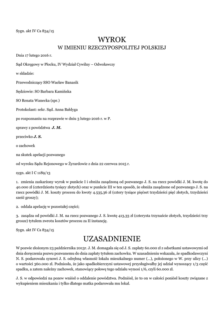 Sygn. akt IV Ca 834/15 WYROK W IMIENIU RZECZYPOSPOLITEJ POLSKIEJ Dnia 17 lutego 2016 r. Sąd Okręgowy w Płocku, IV Wydział Cywilny – Odwoławczy w składzie: Przewodniczący SSO Wacław Banasik Sędziowie: SO Barbara Kamińska SO Renata Wanecka (spr.) Protokolant: sekr. Sąd. Anna Bałdyga po rozpoznaniu na rozprawie w dniu 3 lutego 2016 r. w P. sprawy z powództwa J. M. przeciwko J. S. o zachowek na skutek apelacji pozwanego od wyroku Sądu Rejonowego w Żyrardowie z dnia 22 czerwca 2015 r. sygn. akt I C 1189/13 1. zmienia zaskarżony wyrok w punkcie I i obniża zasądzoną od pozwanego J. S. na rzecz powódki J. M. kwotę do 40.000 zł (czterdziestu tysięcy złotych) oraz w punkcie III w ten sposób, że obniża zasądzone od pozwanego J. S. na rzecz powódki J. M. koszty procesu do kwoty 4.535,36 zł (cztery tysiące pięćset trzydzieści pięć złotych, trzydzieści sześć groszy); 2. oddala apelację w pozostałej części; 3. zasądza od powódki J. M. na rzecz pozwanego J. S. kwotę 413,33 zł (czterysta trzynaście złotych, trzydzieści trzy grosze) tytułem zwrotu kosztów procesu za II instancję. Sygn. akt IV Ca 834/15 UZASADNIENIE W pozwie złożonym 23 października 2013r. J. M. domagała się od J. S. zapłaty 60.000 zł z odsetkami ustawowymi od dnia doręczenia pozwu pozwanemu do dnia zapłaty tytułem zachowku. W uzasadnieniu wskazała, że spadkodawczyni N. S. podarowała synowi J. S. odrębną własność lokalu mieszkalnego numer (...), położonego w W. przy ulicy (...) o wartości 360.000 zł. Podniosła, że jako spadkobierczyni ustawowej przysługiwałby jej udział wynoszący 1/3 część spadku, a zatem należny zachowek, stanowiący połowę tego udziału wynosi 1/6, czyli 60.000 zł. J. S. w odpowiedzi na pozew wniósł o oddalenie powództwa. Podniósł, że to on w całości poniósł koszty związane z wykupieniem mieszkania i tylko dlatego matka podarowała mu lokal. Wyrokiem z 22 czerwca 2015r. Sąd Rejonowy w Żyrardowie zasądził od J. S. na rzecz J. M. kwotę 56.384,16 zł wraz z odsetkami ustawowymi od dnia 28 sierpnia 2014r. do dnia zapłaty, oddalając powództwo w pozostałej części. Sąd zasądził również od pozwanego na rzecz powódki kwotę 7.877,83 zł tytułem zwrotu kosztów procesu oraz nakazał zwrócić ze Skarbu Państwa – Sądu Rejonowego w Żyrardowie powódce J. M. kwotę 505,46 zł tytułem niewykorzystanej części zaliczki. Sąd Rejonowy ustalił następujący stan faktyczny: Spadkodawczyni N. S. zmarła 5 lipca 2010 roku w W.. Zgodnie z postanowieniem Sądu Rejonowego dla m. st. Warszawy w Warszawie spadek po N. S. na podstawie testamentu notarialnego z dnia 15 maja 2008 roku nabył w całości syn J. S.. Testament nie zawierał żadnych postanowień w zakresie wydziedziczenia powódki. W skład spadku po N. S. wchodziło prawo odrębnej własności lokalu, oznaczonego nr (...), położonego w budynku nr (...), przy ulicy (...) w W. o powierzchni 42,45 m2 oraz związany z tym prawem udział w nieruchomości wspólnej. Dla lokalu tego Sąd Rejonowy dla Warszawy –Mokotowa w W. prowadzi księgę wieczystą Kw nr (...). Opisany wyżej lokal mieszkalny przyznany został spadkodawczyni i jej mężowi w 1964 roku jako mieszkanie kwaterunkowe. Pozwany zamieszkiwał w przedmiotowym lokalu od 2005 roku z matką i żoną M. S., a później z dziećmi. Jego siostry wyprowadziły się wcześniej. Z uwagi na pogarszający się stan zdrowia pozwanego oraz ze względu na fakt, że mieszkanie stanowiło lokal kwaterunkowy - między spadkodawczynią a pozwanym i jego żoną M. S. została zawarta ustna umowa, mocą której pozwany miał przekazać matce środki niezbędne na wykupienie lokalu, a matka zobowiązała się następnie do jego przekazania pozwanemu. Spadkodawczyni nie dysponowała odpowiednimi środkami na wykup mieszkania. Utrzymywała się ze świadczenia emerytalnego, które wynosiło wówczas 1.400 – 1.500 zł miesięcznie. W dniu 28 kwietnia 2008 roku pozwany przelał ze swojego rachunku bankowego na rachunek bankowy spadkodawczyni kwotę 35.000 zł. Pieniądze te stanowiły oszczędności pozwanego. Przekazując pieniądze matce pozwany nie oczekiwał zwrotu tych pieniędzy i nie traktował tego, jako pożyczki. Spadkodawczyni po przekazaniu jej pieniędzy uważała pozwanego za właściciela lokalu. W dniu 12 maja 2008 roku z rachunku bankowego spadkodawczyni i pozwanego na rachunek bankowy (...) D. O. m. st. W. dokonano przelewu kwoty 33.744,15 zł tytułem wykupu mieszkania przy ulicy (...). W dniu 15 maja 2008 roku została zawarta umowa, mocą której ustanowiona została odrębna własność lokalu mieszkalnego nr (...) o powierzchni 42,45 m2, usytuowanego w budynku położonym w W. przy ulicy (...), objętego księgą wieczystą Kw nr (...) i lokal ten został sprzedany N. S. wraz z udziałem wynoszącym 0,0103 części we współwłasności wszelkich części wspólnych budynku i innych urządzeń, które nie służą wyłącznie do użytku właścicieli poszczególnych lokali. Wartość lokalu ustalono na kwotę 337.222 zł, a cena lokalu po zastosowaniu 90% bonifikaty wynosiła 33.722,20 zł. W dniu 9 lipca 2009 roku została zawarta umowy darowizny, na podstawie której N. S. darowała swojemu synowi J. S. do jego majątku osobistego odrębną własność lokalu nr (...) o powierzchni 42,45 m2, usytuowanego w budynku położonym w W. przy ulicy (...), objętego księgą wieczystą Kw nr (...). Wartość przedmiotu darowizny została określona, jako 80.000 zł. Wartość rynkowa opisanego wyżej lokalu mieszkalnego wraz z udziałem w nieruchomości wspólnej na dzień otwarcia spadku (5 lipca 2010 roku) wynosiła 285.000 zł. W skład spadku po N. S. wchodziły również środki finansowe w kwocie 53.305 zł, które spadkodawczyni otrzymała w listopadzie 2009 roku od (...) Związku (...) tytułem odszkodowania za wywłaszczenie działki pracowniczej pod autostradę. Znaczną część tych pieniędz