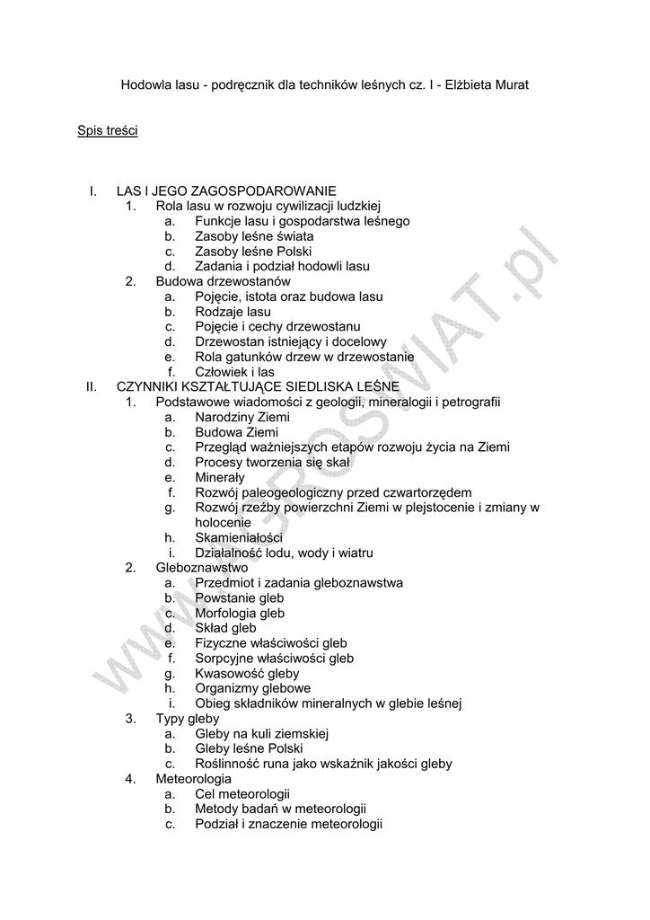 Hodowla lasu - podręcznik dla techników leśnych cz. I - ElŜbieta Murat Spis treści I. II. LAS l JEGO ZAGOSPODAROWANIE 1. Rola lasu w rozwoju cywilizacji ludzkiej a. Funkcje lasu i gospodarstwa leśnego b. Zasoby leśne świata c. Zasoby leśne Polski d. Zadania i podział hodowli lasu 2. Budowa drzewostanów a. Pojęcie, istota oraz budowa lasu b. Rodzaje lasu c. Pojęcie i cechy drzewostanu d. Drzewostan istniejący i docelowy e. Rola gatunków drzew w drzewostanie f. Człowiek i las CZYNNIKI KSZTAŁTUJĄCE SIEDLISKA LEŚNE 1. Podstawowe wiadomości z geologii, mineralogii i petrografii a. Narodziny Ziemi b. Budowa Ziemi c. Przegląd waŜniejszych etapów rozwoju Ŝycia na Ziemi d. Procesy tworzenia się skał e. Minerały f. Rozwój paleogeologiczny przed czwartorzędem g. Rozwój rzeźby powierzchni Ziemi w plejstocenie i zmiany w holocenie h. Skamieniałości i. Działalność lodu, wody i wiatru 2. Gleboznawstwo a. Przedmiot i zadania gleboznawstwa b. Powstanie gleb c. Morfologia gleb d. Skład gleb e. Fizyczne właściwości gleb f. Sorpcyjne właściwości gleb g. Kwasowość gleby h. Organizmy glebowe i. Obieg składników mineralnych w glebie leśnej 3. Typy gleby a. Gleby na kuli ziemskiej b. Gleby leśne Polski c. Roślinność runa jako wskaźnik jakości gleby 4. Meteorologia a. Cel meteorologii b. Metody badań w meteorologii c. Podział i znaczenie meteorologii III. d. Atmosfera ziemska, jej skład i budowa e. Promieniowanie w atmosferze f. Temperatura g. Ciśnienie atmosferyczne h. Para wodna w atmosferze i. Kondensacja pary wodnej j. Ruch powietrza w atmosferze k. Pogoda i jej zmiany 5. Zarys klimatologii a. Pojęcie klimatu b. Czynniki klimatyczne c. Klasyfikacja klimatów d. Klimat Polski CHARAKTERYSTYKA EKOLOGICZNA Ĺ RODOWISKA LEŚNEGO 1. Las jako system ekologiczny a. Siedlisko i środowisko leśne b. Biocenoza c. Obserwacje fitofenologiczne i ich znaczenie w leśnictwie 2. Las jako zjawisko geograficzne a. Ekologiczne formy lasu według ich rozmieszczenia poziomego b. Ekologiczne typy lasu według ich rozmieszczenia pionowego Wydawca Liczba stron Wymiary Okładka Wydawnictwo Świat 144 B5 miękka