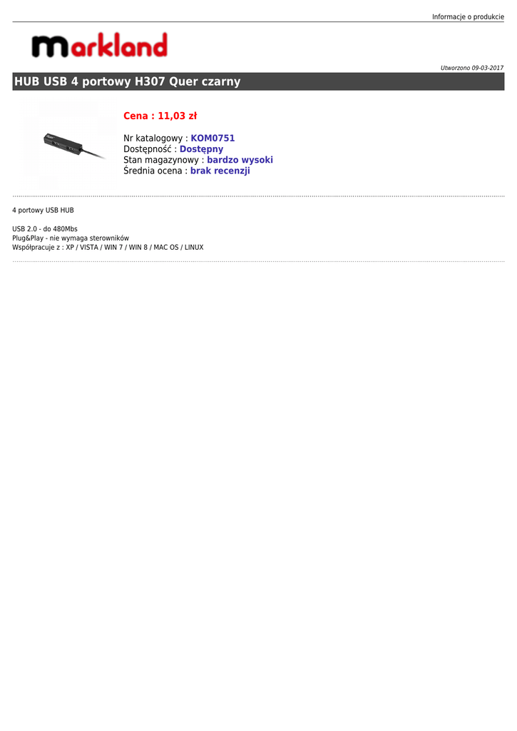 Informacje o produkcie Utworzono 09-03-2017 HUB USB 4 portowy H307 Quer czarny Cena : 11,03 zł Nr katalogowy : KOM0751 Dostępność : Dostępny Stan magazynowy : bardzo wysoki Średnia ocena : brak recenzji 4 portowy USB HUB USB 2.0 - do 480Mbs Plug&Play - nie wymaga sterowników Współpracuje z : XP / VISTA / WIN 7 / WIN 8 / MAC OS / LINUX