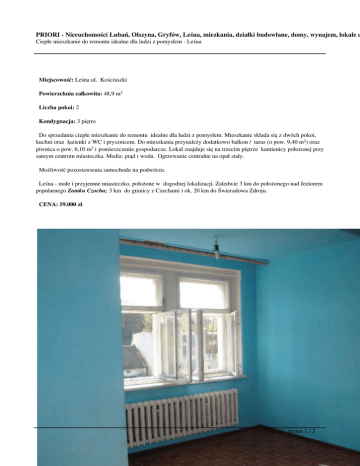 PRIORI - Nieruchomości Lubań, Olszyna, Gryfów, Leśna, miezkania, działki budowlane, domy, wynajem, lokale u Ciepłe mieszkanie do remontu idealne dla ludzi z pomysłem - Leśna Miejscowość: Leśna ul. Kościuszki Powierzchnia całkowita: 48,9 m2 Liczba pokoi: 2 Kondygnacja: 3 piętro Do sprzedania ciepłe mieszkanie do remontu idealne dla ludzi z pomysłem. Mieszkanie składa się z dwóch pokoi, kuchni oraz łazienki z WC i prysznicem. Do mieszkania przynależy dodatkowo balkon / taras (o pow. 9,40 m2) oraz piwnica o pow. 6,10 m2 i pomieszczenie gospodarcze. Lokal znajduje się na trzecim piętrze kamienicy położonej przy samym centrum miasteczka. Media: prąd i woda. Ogrzewanie centralne na opał stały. Możliwość pozostawienia samochodu na podwórzu. Leśna - małe i przyjemne miasteczko, położone w dogodnej lokalizacji. Zaledwie 3 km do położonego nad Jeziorem popularnego Zamku Czocha; 3 km do granicy z Czechami i ok. 20 km do Świeradowa Zdroju. CENA: 59.000 zł. strona 1 / 3 PRIORI - Nieruchomości Lubań, Olszyna, Gryfów, Leśna, miezkania, działki budowlane, domy, wynajem, lokale u Ciepłe mieszkanie do remontu idealne dla ludzi z pomysłem - Leśna strona 2 / 3 PRIORI - Nieruchomości Lubań, Olszyna, Gryfów, Leśna, miezkania, działki budowlane, domy, wynajem, lokale u Ciepłe mieszkanie do remontu idealne dla ludzi z pomysłem - Leśna strona 3 / 3