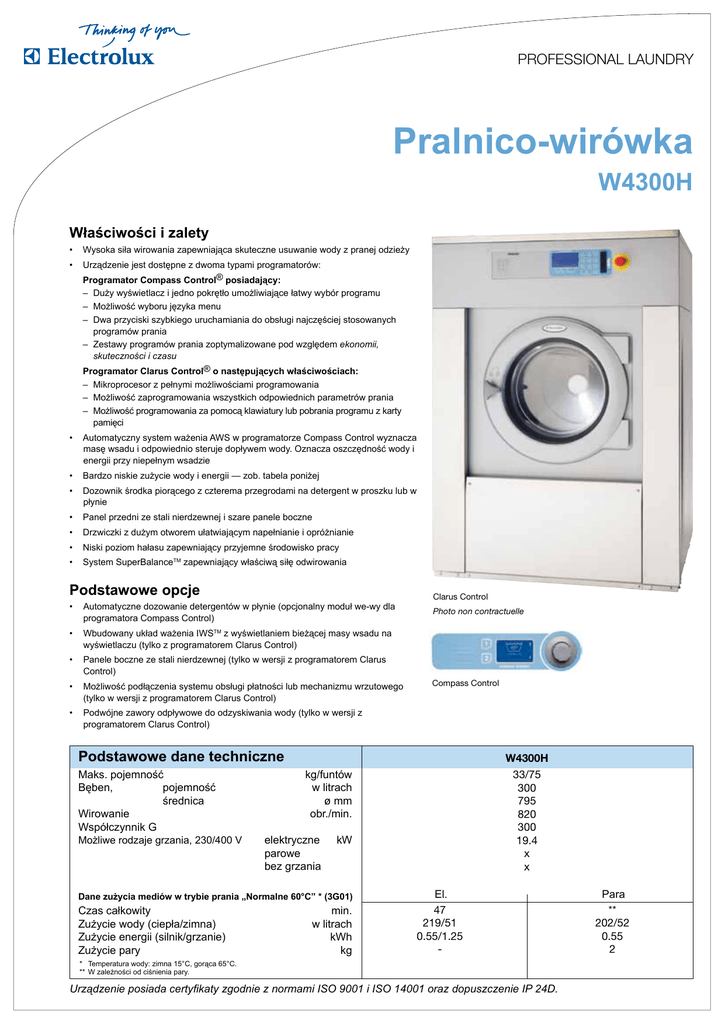 PROFESSIONAL LAUNDRY Pralnico-wirówka W4300H Właściwości i zalety • Wysoka siła wirowania zapewniająca skuteczne usuwanie wody z pranej odzieży • Urządzenie jest dostępne z dwoma typami programatorów: Programator Compass Control® posiadający: – Duży wyświetlacz i jedno pokrętło umożliwiające łatwy wybór programu – Możliwość wyboru języka menu – Dwa przyciski szybkiego uruchamiania do obsługi najczęściej stosowanych programów prania – Zestawy programów prania zoptymalizowane pod względem ekonomii, skuteczności i czasu Programator Clarus Control® o następujących właściwościach: – Mikroprocesor z pełnymi możliwościami programowania – Możliwość zaprogramowania wszystkich odpowiednich parametrów prania – Możliwość programowania za pomocą klawiatury lub pobrania programu z karty pamięci • Automatyczny system ważenia AWS w programatorze Compass Control wyznacza masę wsadu i odpowiednio steruje dopływem wody. Oznacza oszczędność wody i energii przy niepełnym wsadzie • Bardzo niskie zużycie wody i energii — zob. tabela poniżej • Dozownik środka piorącego z czterema przegrodami na detergent w proszku lub w płynie • Panel przedni ze stali nierdzewnej i szare panele boczne • Drzwiczki z dużym otworem ułatwiającym napełnianie i opróżnianie • Niski poziom hałasu zapewniający przyjemne środowisko pracy • System SuperBalanceTM zapewniający właściwą siłę odwirowania Podstawowe opcje • Automatyczne dozowanie detergentów w płynie (opcjonalny moduł we-wy dla programatora Compass Control) Clarus Control Photo non contractuelle • Wbudowany układ ważenia IWSTM z wyświetlaniem bieżącej masy wsadu na wyświetlaczu (tylko z programatorem Clarus Control) • Panele boczne ze stali nierdzewnej (tylko w wersji z programatorem Clarus Control) • Możliwość podłączenia systemu obsługi płatności lub mechanizmu wrzutowego (tylko w wersji z programatorem Clarus Control) Compass Control • Podwójne zawory odpływowe do odzyskiwania wody (tylko w wersji z programatorem Clarus Control) Podstawowe dane techniczne Maks. pojemność Bęben, pojemność średnica Wirowanie Współczynnik G Możliwe rodzaje grzania, 230/400 V W4300H kg/funtów w litrach ø mm obr./min. elektryczne parowe bez grzania kW Dane zużycia mediów w trybie prania „Normalne 60°C” * (3G01) Czas całkowity Zużycie wody (ciepła/zimna) Zużycie energii (silnik/grzanie) Zużycie pary 33/75 300 795 820 300 19.4 x x min. w litrach kWh kg El. 47 219/51 0.55/1.25 - * Temperatura wody: zimna 15°C, gorąca 65°C. ** W zależności od ciśnienia pary. Urządzenie posiada certyfikaty zgodnie z normami ISO 9001 i ISO 14001 oraz dopuszczenie IP 24D. Para ** 202/52 0.55 2 Przyłącza elektryczne* W4300H Grzanie Napięcie El. 230 V, 3-fazowe, 50 Hz kW(A) 208–240 V, 3-fazowe, 60 HzkW(A) 400–415 V, 3-fazowe, 50 Hz kW(A) 19.4(63) 19.4(63) 19.4(35) 2.1(10) 2.1(10) 2.1(10) Para 240 V, 1-fazowe, 60 Hz kW(A) lub bez 208 - 240 V, 1-fazowe, 60 Hz kW(A) podgrzewania240 V, 1-fazowe, 50 Hz kW(A) 7 Przyłącze wody i pary Zawory wody Ciśnienie wody A 8 DN kPa Przepustowość przy ciśnieniu 300 kPa l/min Zawór odpływowy ø mm Przepustowość odpływu l/min Zawór pary DN Ciśnienie pary kPa Układy dozowania płynów piorących 20 150-400 60 75 170 15 300-600 5 9 C Wymagania dotyczące podłoża D Częstotliwość sił dynamicznych Hz Maks. obciążenie podłoża przy wirowaniu kN 13.7 5.5 ± 1.3 5377 Strona przednia Poziomy hałasu Poziom ciśnienia akustycznego** dB(A) Poziom mocy akustycznej (IEC 60704-2-4)dB(A) 76 83 B Ciepło emitowane % zainstalowanej mocy, maks. 5 Dane transportowe Masa Objętość transportowa netto, kg ze skrzynią, kg m3 509 528 2.1 Akcesoria Zbiornik wody do ponownego wykorzystania (programator Clarus Control) Zestawy węży do wody lub pary x x x 5 Wymiary w mm A Szerokość B Głębokość C Wysokość D E F G H I K L M N O P 1 2 3 4 5 Przyłącze elektryczne Przyłącze zimnej wody Przyłącze gorącej wody Przyłącze pary Odpływ 1020 1060 1445 500 1135 1155 100 1360 215 1320 300 380 100 360 330 6 7 8 9 Przyłącza dozowania płynów Panel obsługi Pojemnik na środki piorące Otwór drzwiowy ø435 5379 E Strona prawa M L P G I 3 4 2 6 1 K H F * Możliwe są również inne wartości napięcia, zob. instrukcja instalacji. ** Przybliżona wartość w miejscu przebywania osoby obsługującej w pralni średniej wielkości. N 5 O 5378 www.electrolux.com/laundrysystems Share more of our thinking at www.electrolux.com Art. No. 438901954/2010.04.09 Strona tylna Zastrzega się prawo do zmiany danych technicznym bez powiadomienia. Stalowa rama podstawy
