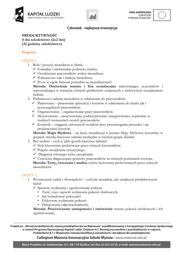 PRODUKTYWNOŚĆ 4 dni szkoleniowe (2x2 dni) (32 godziny szkoleniowe) Program DZIEŃ 1 1. Rola i pozycja menedżera w firmie. Formalne i nieformalne podstawy władzy. Oczekiwania pracowników wobec menedżera. Podstawowe role i funkcje menedżera. Po co w ogóle firmom potrzebni są menedżerowie? Metoda: Omówienie tematu i Gra symulacyjna uaktywniająca uczestników i wprowadzająca w tematykę różnych problemów związanych z efektywnym zarządzaniem ludźmi. 2. Podstawowe zadania menedżera w odniesieniu do pracowników. Planowanie – planowanie sprzedaży i kosztów w odniesieniu do działu jak i poszczególnych pracowników. Organizowanie – organizowanie pracy pracowników. Motywowanie – motywowanie, podtrzymywanie zaangażowania, wspieranie w trudnych momentach swoich pracowników. Kontrola – osiąganie założonych wyników przy przestrzeganiu procedur i nie przekraczaniu kosztów. Metoda: Mapa Myślowa – na bazie wizualizacji w postaci Mapy Myślowej uczestnicy w grupach określą kluczowe zadania niezbędne w każdym grupie działań 3. Być szefem – czyli w jakli sposób kierować ludźmi? Style kierowania preferowane przez różnych kierowników. Pojęcie zarządzania sytuacyjnego. Diagnoza własnego styku zarządzania. Ćwiczenia diagnozujące potrzeby pracowników na różnych poziomach rozwoju. Metoda: Testy, ćwiczenia i analiza stylów kierowania preferowanych przez różnych menedżerów. DZIEŃ 2 1. Wyznaczanie zadań i obowiązków – czyli jak zarządzać, aby zwiększać produktywność ludzi? Sprawne wydawanie i egzekwowanie poleceń. • Treść, czas i sposób wydawania poleceń służbowych. • Jak formułować polecenie? • Efektywne wydawanie poleceń. • Delegowanie odpowiedzialności. Metoda: Przećwiczenie umiejętności i omówienie tematu poleceń służbowych i ich egzekwowania. 2. Przekazywanie informacji zwrotnych – jak je formułować, aby korygowały niepożądane zachowania, a nie zabijały motywacji pracowników? Metoda przekazywania informacji zwrotnych. Wygłaszanie krytyki – czyli jak mówić pracownikom o błędach? Pochwały i komplementy – niedoceniane narzędzie kierownika. Podsumowanie efektów indywidualnych – uwypuklanie mocnych stron pracownika i wskazanie błędów wymagających korekty. Metoda: Przećwiczenie umiejętności i omówienie tematu metodologii przekazywania informacji zwrotnej, roli krytyki i pochwały w zwiększaniu zaangażowania pracowników. 3. Zarządzanie sytuacyjne podwładnymi (w oparciu o Model K. Blancharda). Diagnoza zmiennych sytuacyjnych (poziomy rozwoju pracownika). Dostosowanie odpowiedniego stylu zarządzania do osoby i sytuacji. Metoda: Omówienie modelu, ćwiczenia wprowadzające model i ćwiczące jego zastosowanie. DZIEŃ 3 1. Jak skutecznie motywować swoich pracowników? Od czego zacząć – co motywuje moich podwładnych? Potrzeby i motywy działań ludzi. • Hierarchia potrzeb ludzkich i sposoby ich realizowania. • Rozpoznawanie wartości ważnych dla innych ludzi – podstawą właściwego motywowania pracowników. Jak postrzegamy swoich pracowników? Menedżerowie i pracownicy o orientacji X i Y. Skuteczne, pozafinansowe metody motywowania podwładnych. Metoda: Omówienie teorii motywacyjnych, studia przypadków i dyskusja grupowa na temat efektywnych metod motywowania pracowników. 2. Sztuka kierowania podległą grupą na poziomie operacyjnym. Zarządzanie przez zadania, cle, wyjątki jako skuteczna metoda działania na poziomie operacyjnym. Jak efektywnie delegować obowiązki? Jak mobilizować zaangażowanie pracowników? • Wspólny cel – siła jedności. • Wzbudzanie poczucia odpowiedzialności pracownika. • Konkretne cele i wymierne standardy. • Przedstawianie wizji i wspólnego celu. 3. Delegowanie obowiązków. Komu i co delegować? Stopnie delegowania jako metoda dopasowania zadania do kompetencji podwładnego Delegowanie odpowiedzialności. Czym się różni delegowanie od spychologii? Metoda: Omówienie tematu i Dyskusja grupowa uaktywniająca uczestników i wprowadzająca w tematykę różnych problemów związanych z komunikacją społeczną. DZIEŃ 4 1. Metody zarządzania w zależności od stopnia dojrzałości pracowników. Dla początkujących – MBS (Management by Specifics) – Zarządzanie przez Konkrety. Dla zaawansowanych – MBO (Management by Objectives) – Zarządzanie przez Cele. Dla ekspertów – MBE (Management by Exceptions) Zarządzanie przez Wyjątki. 2. Jak uniknąć typowych błędów w zarządzaniu ludźmi? Efekt seppuku – jak zniszczyć zapał pracownika? Efekt Pigmaliona – jak Cię oceniam taki jesteś. Syndrom „odgłosu piły” – nikt mnie nie wyprzedzi. Syndrom A – osobiście się tym zajmę. Mobbing – wszyscy na jednego. Metoda: Omówienie studiów przypadków błędów w zarządzaniu i motywowaniu, Dyskusja grupowa uaktywniająca uczestników. 3. Budowanie wzorców postępowania z różnego rodzaju pracownikami. Osoby, co do których są stale zastrzeżenia. Wiecznie wzorowi. Osoby, które ciągle czują się pokrzywdzone. Osoby nieustannie niezadowolone. Metoda: Dyskusja grupowa na temat zarządzania różnymi typami pracowników. 4. Podsumowanie szkolenia.