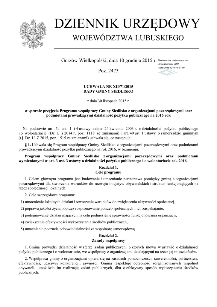 DZIENNIK URZĘDOWY WOJEWÓDZTWA LUBUSKIEGO Gorzów Wielkopolski, dnia 10 grudnia 2015 r. Elektronicznie podpisany przez: Anna Zacharia; LUW Poz. 2473 Data: 2015-12-10 15:01:09 UCHWAŁA NR XII/71/2015 RADY GMINY SIEDLISKO z dnia 30 listopada 2015 r. w sprawie przyjęcia Programu współpracy Gminy Siedlisko z organizacjami pozarządowymi oraz podmiotami prowadzącymi działalność pożytku publicznego na 2016 rok Na podstawie art. 5a ust. 1 i 4 ustawy z dnia 24 kwietnia 2003 r. o działalności pożytku publicznego i o wolontariacie (Dz. U. z 2014 r, poz. 1118 ze zmianami) i art. 40 ust. 1 ustawy o samorządzie gminnym (t.j. Dz. U. Z 2015, poz. 1515 ze zmianami) uchwala się, co następuje: § 1. Uchwala się Program współpracy Gminy Siedlisko z organizacjami pozarządowymi oraz podmiotami prowadzącymi działalność pożytku publicznego na rok 2016, w brzmieniu: Program współpracy Gminy Siedlisko z organizacjami pozarządowymi oraz podmiotami wymienionymi w art. 3 ust. 3 ustawy o działalności pożytku publicznego i o wolontariacie rok 2016. Rozdział 1. Cele programu 1. Celem głównym programu jest budowanie i umacnianie partnerstwa pomiędzy gminą a organizacjami pozarządowymi dla stworzenia warunków do rozwoju inicjatyw obywatelskich i struktur funkcjonujących na rzecz społeczności lokalnych. 2. Cele szczegółowe programu: 1) umocnienie lokalnych działań i stworzenie warunków do zwiększenia aktywności społecznej, 2) poprawa jakości życia poprzez rozpoznawanie potrzeb społecznych i ich zaspakajanie, 3) podejmowanie działań mających na celu podniesienie sprawności funkcjonowania organizacji, 4) zwiększenie efektywności wykorzystania środków publicznych, 5) umacnianie poczucia odpowiedzialności za wspólnotę samorządową. Rozdział 2. Zasady współpracy 1. Gmina prowadzi działalność w sferze zadań publicznych, o których mowa w ustawie o działalności pożytku publicznego i o wolontariacie, we współpracy z organizacjami działającymi na rzecz jej mieszkańców. 2. Współpraca gminy z organizacjami opiera się na zasadach pomocniczości, suwerenności, partnerstwa, efektywności, uczciwej konkurencji, jawności. Gmina respektuje odrębność zorganizowanych wspólnot obywateli, umożliwia im realizację zadań publicznych, dba o efektywny sposób wykorzystania środków publicznych. Dziennik Urzędowy Województwa Lubuskiego –2– Poz. 2473 Rozdział 3. Zakres przedmiotowy 1. Przedmiotem współpracy Gminy Siedlisko z organizacjami pozarządowymi jest sfera zadań publicznych zgodna z obszarami określonymi w art. 4 ust. 1 ustawy o działalności pożytku publicznego i o wolontariacie. Rozdział 4. Formy współpracy 1. Współpraca w 2016 r. realizowana będzie w sposób następujący: 1) finansowy, poprzez: a) powierzanie wykonywania zadań publicznych wraz z udzielaniem dotacji na finansowanie ich realizacji, b) wspieranie wykonywania zadań publicznych wraz z udzieleniem dotacji na dofinansowanie ich realizacji, 2) pozafinansowy, poprzez: a) konsultowaniu projektów aktów normatywnych w dziedzinach dotyczących działalności statutowej tych organizacji, b) wzajemne informowanie się o planowanych kierunkach działalności, c) doradzaniu i współpracy przy pozyskiwaniu przez organizacje środków pozabudżetowych, d) pomocy merytorycznej, e) nieodpłatnym udostępnianiu, w miarę możliwości, pomieszczeń lub sprzętu. Rozdział 5. Priorytetowe zadania publiczne 1. Priorytetowe zdania publiczne realizowane przez Gminę we współpracy z podmiotami Programu obejmują zadania z zakresu: 1) pomocy społecznej, w tym pomoc rodzinom i osobom w trudnej sytuacji życiowej, wyrównywania szans tych rodzin i osób oraz działania na rzecz osób niepełnosprawnych, 2) kultury, sztuki, ochrony dóbr kultury i tradycji, 3) upowszechniania kultury fizycznej i sportu, 4) przeciwdziałanie uzależnieniom i patologiom społecznym, 5) edukacji, oświaty i wychowania. 2. Wójt Gminy na podstawie rozeznania potrzeb lokalnych lub na wniosek podmiotów prowadzących działalność pożytku publicznego, pod warunkiem zabezpieczenia środków finansowych w budżecie Gminy może określić w ciągu roku kolejne zadania i ogłosić otwarte konkursy na ich realizację przez podmioty prowadzące działalność pożytku publicznego. Rozdział 6. Finansowanie, okres i sposób realizacji programu 1. Program realizowany jest w okresie od 1 stycznia 2016 r. do dnia 31 grudnia 2016 r. 2. Na realizację zadań określonych w Programie przeznacza się ogółem kwotę nie mniej niż 328 820,-zł, ujętą w projekcie budżetu Gminy na rok 2016. 3. Program będzie realizowany poprzez: 1) organizowanie otwartych konkursów ofert na realizację zadań publicznych, 2) zlecanie wykonywania zadań publicznych organizacjom, 3) udzielanie wsparcia finansowego na działania podejmowane przez organizacje, 4) systematyczną wymianę informacji na temat podejmowanych działań i możliwości ich realizacji, Dziennik Urzędowy Województwa Lubuskiego –3– Poz. 2473 5) organizowanie i współorganizowanie przedsięwzięć mających na celu rozwój organizacji oraz ich profesjonalizację. 4. Organizacje w każdym czasie mogą występować z inicjatywami i propozycjami dotyczącymi realizacji zadań w obszarach określonych ustawą oraz informować gminę o podejmowanych przedsięwzięciach. Rozdział 7. Sposób oceny realizacji programu 1. Dokonując oceny realizacji Programu uwzględnione zostaną następujące elementy: 1) liczbę skonsultowanych z organizacjami projektów aktów normatywnych w dziedzinach dotyczących działalności statutowej tych organizacji; 2) liczbę ogłoszonych konkursów na realizację zadania publicznego; 3) liczbę ofert złożonych przez organizacje do konkursów na realizację zadań publicznych; 4) liczbę wniosków złożonych przez organizacje o realizację zadań publicznych z pominięciem konkursów; 5) liczbę organizacji, które otrzymały dofin