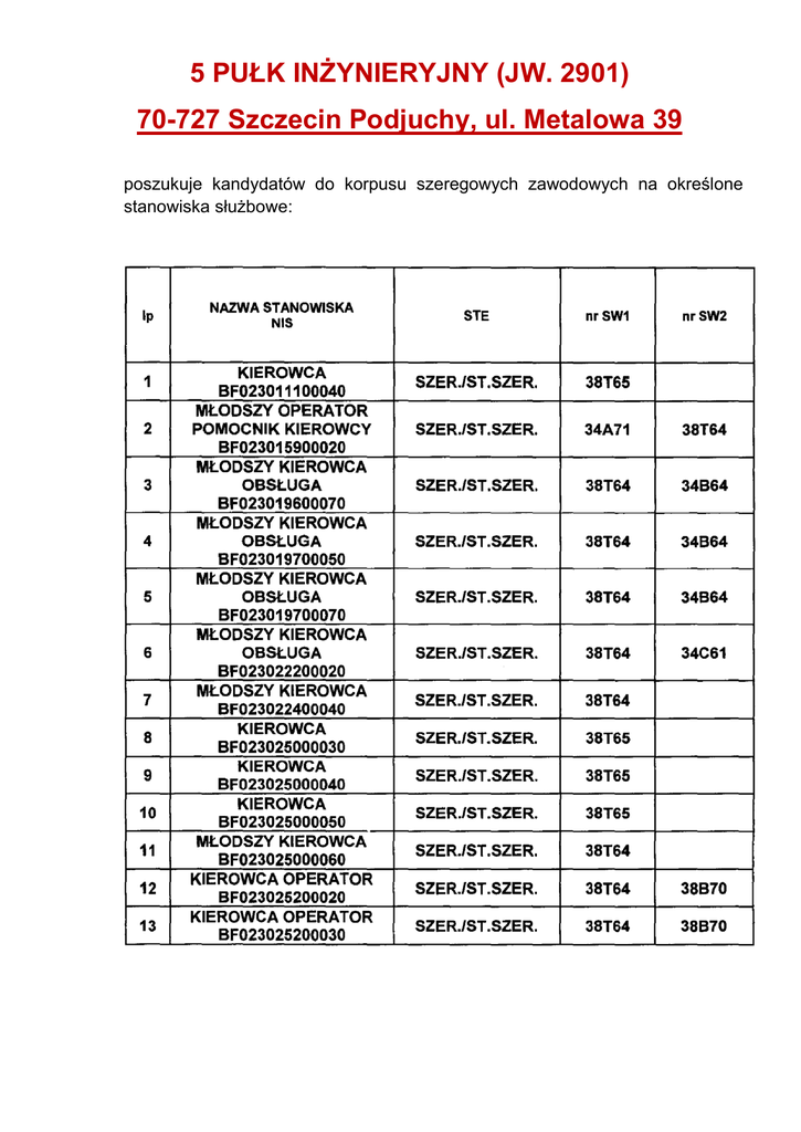 5 PUŁK INŻYNIERYJNY (JW. 2901) 70-727 Szczecin Podjuchy, ul. Metalowa 39 poszukuje kandydatów do korpusu szeregowych zawodowych na określone stanowiska służbowe: Kwalifikacje do zawodowej służby wojskowej na powyższe stanowiska służbowe prowadzone będą w JW. w każdą środę w godz. 08:00 – 12:00 (stawiennictwo godz. 08:00) W dniu kwalifikacji kandydaci powinni posiadać: życiorys; książeczkę wojskową oraz dowód osobisty; dokumenty potwierdzające posiadane kwalifikacje (kserokopie); zaświadczenie lekarskie potwierdzające możliwość przystąpienia do egzaminu z wychowania fizycznego; strój sportowy odpowiedni do warunków atmosferycznych. Żołnierze rezerwy zainteresowani powyższą ofertą, a będący na ewidencji Wojskowej Komendy Uzupełnień w Szczecinku, proszeni są w pierwszej kolejności o kontakt osobisty (pokój nr 1) lub telefoniczny (tel. 261 474 720) w celu udzielenia szczegółowych informacji.