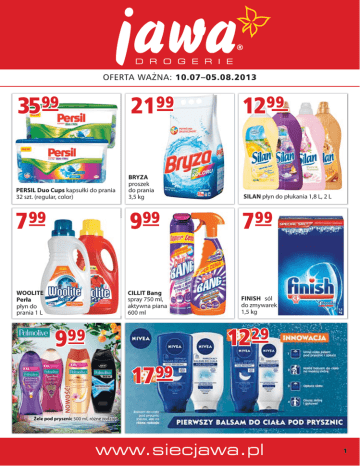OFERTA WAŻNA: 10.07–05.08.2013 3599 2199 1299 PERSIL Duo Cups kapsułki do prania 32 szt. (regular, color) BRYZA proszek do prania 3,5 kg SILAN płyn do płukania 1,8 L, 2 L 799 999 799 WOOLITE Perła płyn do prania 1 L CILLIT Bang spray 750 ml, aktywna piana 600 ml FINISH sól do zmywarek 1,5 kg 1229 999 1799 www.siecjawa.pl 1 229 1699 699 799 459 859 1359 2099 MARION szampon 4-8 myć saszetka 40 ml SYOSS farba do włosów MRS POTTER’S balsam, szampon do włosów 500ml SCHAUMA szampon 400ml, odżywka maska, spray 200 ml, suchy szampon 150 ml VERONA Spa&Wellness koncentrat do twarzy, twarzy i ciała KOLASTYNA Refresh mleczko, tonik 200 ml, żel 150 ml, płyn 125 ml, peeling 75 ml KOLASTYNA Repair, Lift krem 50 ml DAX Perfecta Exclusive krem na dzień/noc, p/zmarszczkowy 50 ml 799 799 999 659 899 849 1299 1099 AA żel do golenia 2 x 200 ml (drugi gratis) AA pianka do golenia 2 x 250 ml (druga gratis) LUKSJA płyn do kąpieli 1L 259 FA żel pod prysznic 400ml 329 NIVEA żel pod prysznic damski, męski 500 ml LUKSJA Creamy mydło w płynie zapas 900 ml INGRID Love Story mascara NIVEA deo damskie i męskie 150 ml, roll-on 50 ml, sztyft 40 ml 599 599 899 1199 1199 749 599 BIAŁY JELEŃ Premium mydło 100 g 359 NATURELLA Ultra podpaski 2 FITTI mydło w płynie 500 ml FA mydło w płynie 300 ml NIVEA mydło w płynie 250 ml PARODONTAX pasta do zębów 75 ml SENSODYNE Proszkliwo pasta do zębów 75 ml 899 279 859 349 499 SIGNAL Family pasta do zębów 100 ml SIGNAL Kids (2-6 lat) pasta do zębów 50 ml OB tampony 16 szt. CLEANIC Deo Soft, Fresh chusteczki odświeżające 12 szt. SHELLEY żel do golenia + chusteczki 659 MARION 14-dniowa terapia ampułki do włosów 5 x 7 ml, koncentrat antycellulitowy ampułki 5 x 6,5 ml 959 EVELINE utwardzacz, odżywka do paznokci 12 ml 3 225 1199 999 299 DOSIA proszek do prania 300 g DZIDZIUŚ balsam do prania/ koncentrat do płukania 1,5 L GLOBAL Sofin płyn do płukania 4L K płyn do płukania 500 ml 699 499 399 799 PUR płyn do naczyń 1,35 L FAIRY Platinum płyn do naczyń 480 ml CIF mleczko do czyszczenia 250 ml SIDOLUX Ochrona i nabłyszczanie 500 ml 1099 1099 369 299 GLADE BY BRISE Discreet Bathroom, Decor, Electric odświeżacze PRONTO aerozol do mebli 250 ml TAK żel do WC 1L 599 539 829 799 TORILLO Jumbo ręcznik kuchenny 300 listków 1 szt. VELVET papier toaletowy (biały, żółty) 12 szt. REGINA Najdłuższe Rolki papier toaletowy biały 4 szt. GRATIS VELVET Junior, Rumianek & Aloe papier toaletowy 42 szt. nawilżony + gratis papier Velvet żółty MOLA Classic ręcznik kuchenny (biały, decor) 2 szt. Baza 10 Oferta aktualna do wyczerpania zapasów. Ceny podane za 1 sztukę. Wygląd produktów na zdjęciach w ulotce może odbiegać od znajdujących się w sprzedaży. Firma nie ponosi odpowiedzialności za błędy w druku. 4
