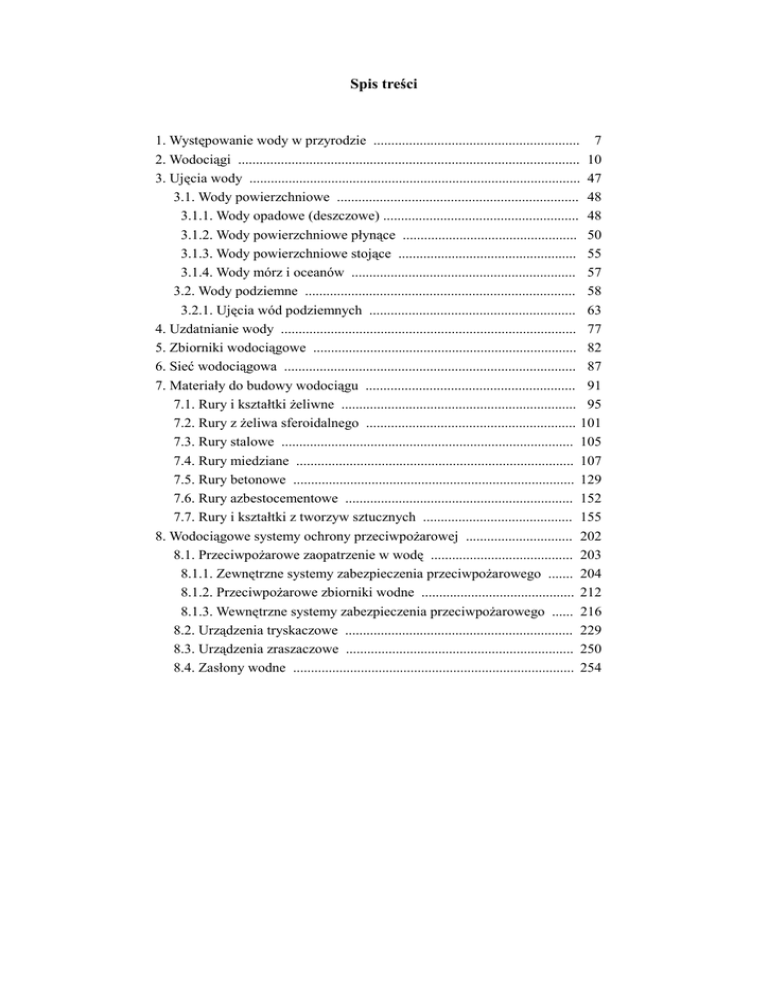 Spis treści 1. Występowanie wody w przyrodzie .......................................................... 7 2. Wodociągi ................................................................................................ 10 3. Ujęcia wody ............................................................................................. 47 3.1. Wody powierzchniowe .................................................................... 48 3.1.1. Wody opadowe (deszczowe) ....................................................... 48 3.1.2. Wody powierzchniowe płynące ................................................. 50 3.1.3. Wody powierzchniowe stojące .................................................. 55 3.1.4. Wody mórz i oceanów ............................................................... 57 3.2. Wody podziemne ............................................................................ 58 3.2.1. Ujęcia wód podziemnych .......................................................... 63 4. Uzdatnianie wody ................................................................................... 77 5. Zbiorniki wodociągowe .......................................................................... 82 6. Sieć wodociągowa .................................................................................. 87 7. Materiały do budowy wodociągu ........................................................... 91 7.1. Rury i kształtki żeliwne .................................................................. 95 7.2. Rury z żeliwa sferoidalnego ........................................................... 101 7.3. Rury stalowe .................................................................................. 105 7.4. Rury miedziane .............................................................................. 107 7.5. Rury betonowe ............................................................................... 129 7.6. Rury azbestocementowe ................................................................ 152 7.7. Rury i kształtki z tworzyw sztucznych .......................................... 155 8. Wodociągowe systemy ochrony przeciwpożarowej .............................. 202 8.1. Przeciwpożarowe zaopatrzenie w wodę ........................................ 203 8.1.1. Zewnętrzne systemy zabezpieczenia przeciwpożarowego ....... 204 8.1.2. Przeciwpożarowe zbiorniki wodne ........................................... 212 8.1.3. Wewnętrzne systemy zabezpieczenia przeciwpożarowego ...... 216 8.2. Urządzenia tryskaczowe ................................................................ 229 8.3. Urządzenia zraszaczowe ................................................................ 250 8.4. Zasłony wodne ............................................................................... 254 6 Spis rysunków ............................................................................................ Spis tablic ................................................................................................... Spis literatury ............................................................................................. Spis norm ................................................................................................... 255 260 264 277