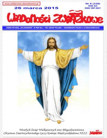 www.solidarnosc.starachowice.pl 26 marca 2015 Nr 6 (338) ROK XVI ISSN 1897-9831 PISMO KM NSZZ „SOLIDARNOŚĆ” W MAN Bus — PKC GROUP POLAND — GEGENBAUER POLSKA w STARACHOWICACH Wesołych Świąt Wielkanocnych oraz Błogosławieństwa Chrystusa Zmartwychwstałego życzy Komisja Międzyzakładowa NSZZ Nr 6 (338) Wiadomości Związkowe Rozmowy płacowe w MAN W dniach 19 i 20 marca odbyły się rozmowy na temat podwyżki wynagrodzeń. NSZZ „Solidarność” przedstawił swoje propozycje, które uzgodnione zostały na ostatnim posiedzeniu Komisji Międzyzakładowej. Tak, więc ustosunkowując się do propozycji prezesa zgodziliśmy się na podpisanie porozumienia, które obowiązywałoby dwa lata (2015 i 2016). Ze swoje strony zaproponowaliśmy, aby w roku 2015 podwyżka wyniosła 2% plus 0,5% na podwyżki indywidualne lub 1% plus 0,5% na podwyżki indywidualne plus bonus 500zł. Natomiast w 2016 roku 2% plus 0,5% na podwyżki indywidualne. W roku 2016 podwyżka kwotowa czyli wszyscy pracownicy otrzymaliby podwyżkę w jednakowej wysokości. Podwyżki w MAN podpisane W dniu 20 marca podpisane zostało porozumienie pomiędzy związkami zawodowymi a przedstawicielami pracodawcy dotyczące podwyżki wynagrodzeń. Ostatecznie ustalono, że porozumienie podpisane zostanie na dwa lata, czyli na 2015 i 2016 rok. W roku 2015 podwyżka wyniesie 1,5% plus 0,5% na podwyżki indywidualne plus bonus w wysokości 500zł. płatny przy wypłacie za miesiąc marzec. Podwyżka wchodzi w życie z dniem 1 stycznia, czyli przy wypłacie za miesiąc marzec pracownicy otrzymają wyrównanie za styczeń i luty. W roku 2016 podwyżka wyniesie 1% plus 0,5% na podwyżki indywidualne plus wysokość inflacji. W roku 2016 wszyscy pracownicy otrzymają podwyżkę w jednakowej wysokości czyli będzie to podwyżka kwotowa. Ponadto zapisano gwarancję wypłaty w latach 2015 i 2016 tak zwanego dobrowolnego dodatku w wysokości 60% bez względu na wynik firmy. Kolejne 40% uzależnione będzie od osiągnięcia określonych celów. Gdyby wszystkie składniki podwyżki wynagrodzeń zliczyć to podwyżka wynosi około 5% (w ciągu dwóch lat). Czy jest to dużo czy mało? Oczywiście mogłoby być więcej, ale również mogło być mniej. Komentarz: Tegoroczne negocjacje dotyczące podwyżki wynagrodzeń w MAN zostały zakończone. Po raz pierwszy podpisaliśmy porozumienie, które reguluje sprawę podwyżki płac na dwa lata. Tak więc już dzisiaj wiemy, jaki będzie wzrost płac nie tylko w roku bieżącym ale także w roku następnym czyli w 2016. Decyzja o podpisaniu porozumienia na dwa lata podjęta została po przeanalizowaniu propozycji prezesa Kobrigera. Propozycja na dwa lata była o wiele korzystniejsza niż na jeden rok, dlatego oczywiste było co należy wybrać. Rozmowy płacowe poprzedzone były przedstawieniem przez prezesa stanu firmy w tym wyników ekonomicznych. Oczywiście jak zwykle przedstawione dane mówiły, że sytuacja jest trudna. Do tego już zdążyliśmy się przyzwyczaić. Nie było jeszcze chyba przypadku, żebyśmy podczas negocjacji płacowych usłyszeli, że sytuacja jest dobra. W roku bieżącym pojawił się jeszcze jeden element, który powodował, że według prezesa sytuacja nie jest najlepsza. Chodzi oczywiście o koszty przeniesienia produkcji z Poznania do Starachowic. Nikt oczywiście nie może negować tego, że proces ten jest bardzo kosztowny, jednak należy to traktować jako inwestycję, która w następnych latach przyniesie firmie konkretne korzyści. Trudno nie zgodzić się z twierdzeniem prezesa, że inwestycja ta to stworzenie dodatkowych miejsc pracy i gwarancja pracy dla nas wszystkich. Tego nie należy lekceważyć i nie doceniać. W obecnych warunkach stabilność zatrudnienia to rzecz bezcenna szczególnie w starachowickiej rzeczywistości. Co by nie mówić to działania związków zawodowych sprawiły, że MAN stał się jednym z najlepszych pracodawców w regionie. Nie da się zaprzeczyć, ze to dzięki nam udało się znacznie podnieść zarobki pracowników i doprowadzić do tego, że 100% załogi zatrudnione jest na umowy na czas nieokreślony. Oczywiście trzeba było ponieść za to pewne koszty – głownie chodzi o porozumienie o elastycznym czasie pracy – ale jak widać to się opłaciło. Wracając do tego, co się obecnie w firmie dzieje to jak widzimy firma się rozwija. Czynione są różnego rodzaju inwestycje. Już wkrótce wyburzone zostanie kilka starych budynków a w ich miejsce wybudowane zostaną nowe, które nie tylko, że ułatwią życie pracownikom to znacznie poprawią wizerunek firmy. Tego nie można nie doceniać. Nie oznacza to jednak, że należy spocząć na laurach. Wprost przeciwnie należy wciąż dążyć do poprawy warunków pracy, poprawy stosunków międzyludzkich i oczywiście wzrostu płac. Jak wiadomo przenoszenie produkcji z Poznania do Starachowic ma na celu poprawę wyników finansowych firmy. Wyniki te mają być lesze już w roku następnym (2016). Gdy przeniesienie się zakończy wyniki powinny znacznie się poprawić. Oczywiste dla mnie jest, że poprawa wyników firmy musi przełożyć się na wzrost wynagrodzeń pracowników. Po prostu pracodawca musi podzielić się zyskami z pracownikami. Oczywiste jest, że nie zrobi tego z własnej woli. Musi go ktoś do tego mobilizować. Mogą to zrobić jedynie związki zawodowe. I oczywiście będziemy to robić, bo taka jest nasza rola. Tego oczekują od nas członkowie związku. A że potrafimy to robić wielokrotnie udowodniliśmy. Jak już powiedziałem należy doceniać, że mamy stabilne miejsca pracy i to, że w najbliższych latach nie grozi nam, że nagle je utracimy. Jest to dla nas, pracowników MAN-a, sytuacja wręcz komfortowa, której mogą nam pozazdrościć ludzie pracujący w większości starachowickich firm. Dlatego nie naleWyrazy głębokiego współczucia ży się dziwić, że po ogłoszeniu, że MAN przyjmie do pracy ponad 700 osób rozpoczął si