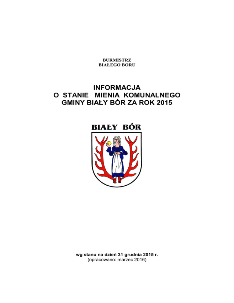 BURMISTRZ BIAŁEGO BORU INFORMACJA O STANIE MIENIA KOMUNALNEGO GMINY BIAŁY BÓR ZA ROK 2015 wg stanu na dzień 31 grudnia 2015 r. (opracowano: marzec 2016) SPIS TREŚCI ROZDZIAŁ 1. Gospodarka gruntami. 1. Informacje ogólne. 2. Ogólne zestawienie gruntów. 3. Grunty niezabudowane przeznaczone pod budownictwo mieszkaniowe. 4. Grunty niezabudowane przeznaczone na cele inne niż mieszkaniowe. ROZDZIAŁ 2. Budynki i obiekty komunalne. 1. Budynki i lokale mieszkalne. 2. Budynki i lokale niemieszkalne. 3. Przedszkola i szkoły. 4. Ośrodki kultury i świetlice. 5. Ośrodki rekreacyjne. 6. Ochrona przeciwpożarowa. 7. Placówki sportowe. 8. Cmentarze komunalne. ROZDZIAŁ 3. Charakterystyka infrastruktury komunalnej. 1. Sieć wodociągowa i kanalizacyjna. 2. Sieć gazowa. 3. Drogi i parkingi. 4. Oświetlenie uliczne. 5. Zieleń miejska. 6. Gospodarka odpadami komunalnymi. 7. Melioracja. ROZDZIAŁ 4. Finanse gminy. 1. Dochody. 2. Zobowiązania gminy z tytułu użytkowania i dzierżawy gruntów. 3. Główne wydatki związane z gospodarowaniem mieniem komunalnym. ROZDZIAŁ 5 . Informacja o zmianach w mieniu komunalnym w roku 2015. 1. Sprzedaż nieruchomości z zasobu gminy. 2. Przekształcenia prawa użytkowania wieczystego w prawo własności. 3. Zamiany nieruchomości. ROZDZIAŁ 1. Gospodarka gruntami – 2015 r. 1. Informacje ogólne. Gmina Biały Bór zajmuje powierzchnię ewidencyjną: 26.942 ha, w tym: - teren miejski 1.264 ha, w tym mienie komunalne 99 ha - teren wiejski 25.678 ha, w tym mienie komunalne 397 ha Wartość gruntów komunalnych według stanu na dzień 31 grudnia 2015 r. szacuje się na kwotę 6 764 681,97 zł, a budynków na kwotę 8 822 279 zł. Lp. Wyszczególnienie gruntów i użytków 1. 2. 3. 4. 5. Użytki rolne, w tym: - grunty orne - sady - łąki trwałe - pastwiska trwałe - grunty rolne zabud. - grunty pod rowami - grunty pod stawami Grunty leśne oraz zadrz. i zakrz. w tym: - lasy - grunty zadrzewione Grunty zabudowane i zurbanizowane, w tym: - mieszkaniowe - przemysłowe - inne tereny zabudowane - zurbanizowanie tereny niezabudowane - rekreacyjnowypoczynkowe Tereny komunikacyjne - drogi - koleje - inne - Użytki kopalne Grunty pod wodami, w tym: - płynącymi - powierzchniowo stojącymi Użytki ekologiczne Nieużytki Ogółem Grunty komunalne w zasobie na koniec 2015 r. Miasto w ha Gmina w ha Ogółem w ha % 46 42 1 2 1 1 81 58 5 9 2 7 10 127 100 1 7 9 3 7 11 26 1 48 6 4 289 7 4 337 2 5 6 2 3 4 5 9 10 - 10 3 10 13 21 1 1 1 3 99 246 28 9 9 8 397 267 1 28 10 10 11 496 2 67 2 3 100 Strukturę gruntów stanowiących mienie komunalne, będących własnością Gminy Biały Bór przedstawia poniższy wykres: Grunty rolne 1. Grunty leśne oraz zadrz. i zakrz. 2 3 Grunty zabudowane i zurbanizowane 4 Grunty pod wodami 5 Nieużytki Analizując powyższy wykres zauważa się, że gmina w swoim zasobie posiada najwięcej, bo 67% gruntów zabudowanych i zurbanizowanych, do których w przeważającej większości zaliczają się drogi -267 ha i użytki kopalne (góra piachu) 28 ha. Kolejną grupą przeważającą w strukturze własności gruntów są tereny zaliczone do użytków rolnych o pow. 127 ha, w tym 100 ha, sklasyfikowanych jako grunty orne, na które w części zostały wydane decyzje o warunkach zabudowy na zabudowę mieszkalną, między innymi osiedle w miejscowości Dołgie oraz osiedle w m. Kaliska. Niewielki udział przypada na grunty leśne i zadrzewione, grunty pod wodami oraz nieużytki. 2. Ogólne zestawienie gruntów na ternie Gminy Biały Bór z uwzględnieniem form władania oraz powierzchni Lp. Wyszczególnienie form własności Teren miejski pow. w ha własność w użytk. wieczystym Teren wiejski pow. w ha własność w użytk. wieczystym Pow. ogółem w ha Pow. gruntów w % 1. 2. Grunty Gminne Grunty Skarbu Państwa (ANR, LP) 99 932 6 18 397 15 779 3 74 505 16 803 2 62 3. Grunty osób fizycznych Grunty województw Grunty spółdzielni Grunty kościołów i związków wyznaniowych 186 - 6 679 - 6 865 26 1 5 - 3 56 - 1 3 61 0,1 0,1 0,3 Grunty powiatów Grunty spółek prawa handlowego i innych Ogółem 10 7 - 111 2 565 - 121 2 572 0,5 9 1 240 24 25 590 77 26 931 100 4. 5. 6. 7. Strukturę powierzchni i własności gruntów znajdujących się na terenie Gminy Biały Bór na koniec 2015 roku, przedstawia poniższy wykres: Grunty Gminne Gruntu Skarbu Państwa Grunty osób fizycznych Grunty spółek prawa handlowego Pozostałe grunty Analizując powyższy wykres, stwierdza się, że na terenie gminy Biały Bór, najwięcej, bo 62% powierzchni nieruchomości należy do Skarbu Państwa, w zarządzie Agencji Nieruchomości Rolnych i Lasów Państwowych, następnie do osób fizycznych 26%, grunty Gminne zajmują 2% całkowitej powierzchni Gminy Biały Bór. Poniższy wykres przedstawia orientacyjne porównanie struktury powierzchni i własności gruntów znajdujących się na terenie Gminy Biały Bór w latach 2012, 2013, 2014, 2015. 70 60 50 40 30 20 10 0 2012 2013 2014 2015 Grunty Gminne Grunty Skarbu Państwa Grynty osób fizycznych Grunty pozostałe Grunty spółek prawa handlowego Z powyższego wykresu można wywnioskować wstrzymanie sprzedaży gruntów stanowiących własność Skarbu Państwa, grunty gminne utrzymują się prawie na jednakowym poziomie. 3. Grunty niezabudowane przeznaczone pod budownictwo mieszkaniowe Na terenie Gminy Biały Bór znajduje się około 30 ha gruntów przeznaczonych pod budownictwo mieszkaniowe oraz na prowadzenie nieuciążliwych usług. Gmina posiada także niewielkie działki plombowe, które są zagospodarowane i dzierżawione. Takie działki znajdują się m.in. w miejscowościach Drzonowo, Stepień, Grabowo, Biskupice Między innymi na terenie Gminy Biały Bór znajduje się: - 7 działek znajdujących się przy ul. Dworcowej, obręb 03 m. Biały Bór: oznaczonych nr 39/12 o pow. 962 m2, nr 39/13 o pow. 972 m2, nr 39/15 o pow. 961 m2, nr 39/16 o pow. 959 m2, nr 39/17 o pow. 909 m2, nr 39/18 o pow. 915 m2, nr 39/19 o p
