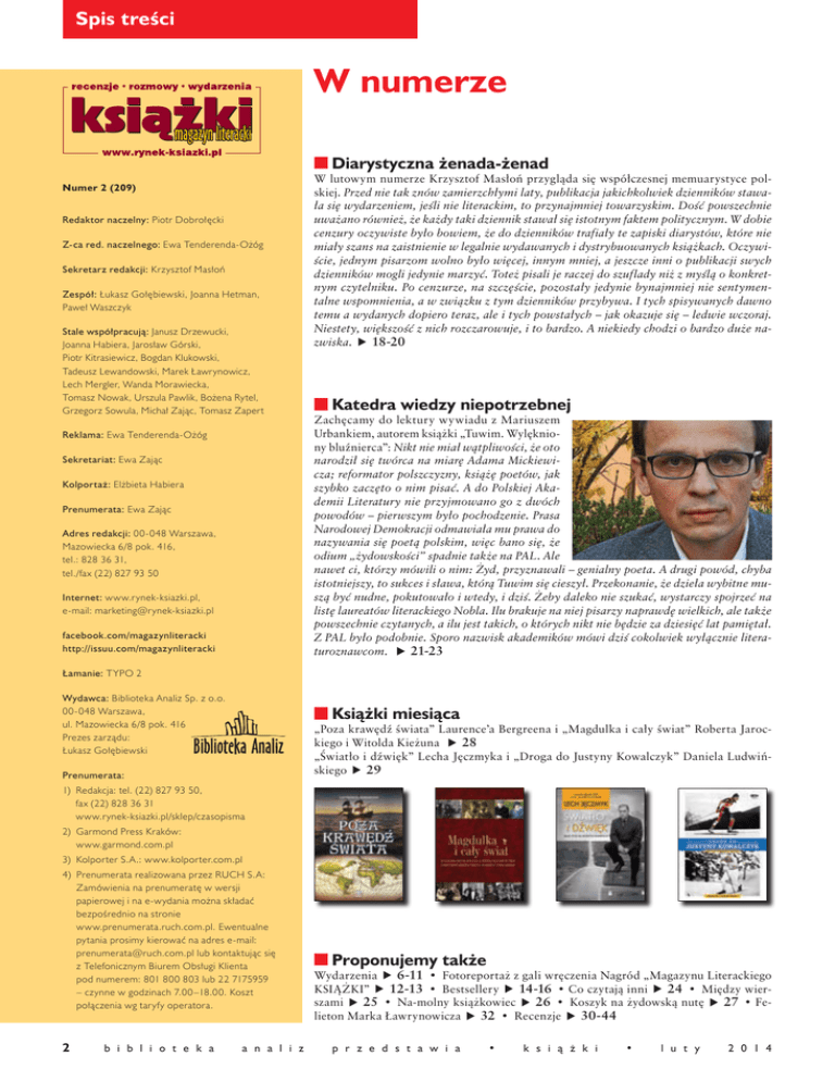 Spis treści W numerze Diarystyczna żenada-żenad Numer 2 (209) Redaktor naczelny: Piotr Dobrołęcki Z-ca red. naczelnego: Ewa Tenderenda-Ożóg Sekretarz redakcji: Krzysztof Masłoń Zespół: Łukasz Gołębiewski, Joanna Hetman, Paweł Waszczyk Stale współpracują: Janusz Drzewucki, Joanna Habiera, Jarosław Górski, Piotr Kitrasiewicz, Bogdan Klukowski, Tadeusz Lewandowski, Marek Ławrynowicz, Lech Mergler, Wanda Morawiecka, Tomasz Nowak, Urszula Pawlik, Bożena Rytel, Grzegorz Sowula, Michał Zając, Tomasz Zapert Reklama: Ewa Tenderenda-Ożóg Sekretariat: Ewa Zając Kolportaż: Elżbieta Habiera Prenumerata: Ewa Zając Adres redakcji: 00-048 Warszawa, Mazowiecka 6/8 pok. 416, tel.: 828 36 31, tel./fax (22) 827 93 50 Internet: www.rynek-ksiazki.pl, e-mail: [email protected] facebook.com/magazynliteracki http://issuu.com/magazynliteracki W lutowym numerze Krzysztof Masłoń przygląda się współczesnej memuarystyce polskiej. Przed nie tak znów zamierzchłymi laty, publikacja jakichkolwiek dzienników stawała się wydarzeniem, jeśli nie literackim, to przynajmniej towarzyskim. Dość powszechnie uważano również, że każdy taki dziennik stawał się istotnym faktem politycznym. W dobie cenzury oczywiste było bowiem, że do dzienników trafiały te zapiski diarystów, które nie miały szans na zaistnienie w legalnie wydawanych i dystrybuowanych książkach. Oczywiście, jednym pisarzom wolno było więcej, innym mniej, a jeszcze inni o publikacji swych dzienników mogli jedynie marzyć. Toteż pisali je raczej do szuflady niż z myślą o konkretnym czytelniku. Po cenzurze, na szczęście, pozostały jedynie bynajmniej nie sentymentalne wspomnienia, a w związku z tym dzienników przybywa. I tych spisywanych dawno temu a wydanych dopiero teraz, ale i tych powstałych – jak okazuje się – ledwie wczoraj. Niestety, większość z nich rozczarowuje, i to bardzo. A niekiedy chodzi o bardzo duże nazwiska. 18-20 Katedra wiedzy niepotrzebnej Zachęcamy do lektury wywiadu z Mariuszem Urbankiem, autorem książki „Tuwim. Wylękniony bluźnierca”: Nikt nie miał wątpliwości, że oto narodził się twórca na miarę Adama Mickiewicza; reformator polszczyzny, książę poetów, jak szybko zaczęto o nim pisać. A do Polskiej Akademii Literatury nie przyjmowano go z dwóch powodów – pierwszym było pochodzenie. Prasa Narodowej Demokracji odmawiała mu prawa do nazywania się poetą polskim, więc bano się, że odium „żydowskości” spadnie także na PAL. Ale nawet ci, którzy mówili o nim: Żyd, przyznawali – genialny poeta. A drugi powód, chyba istotniejszy, to sukces i sława, którą Tuwim się cieszył. Przekonanie, że dzieła wybitne muszą być nudne, pokutowało i wtedy, i dziś. Żeby daleko nie szukać, wystarczy spojrzeć na listę laureatów literackiego Nobla. Ilu brakuje na niej pisarzy naprawdę wielkich, ale także powszechnie czytanych, a ilu jest takich, o których nikt nie będzie za dziesięć lat pamiętał. Z PAL było podobnie. Sporo nazwisk akademików mówi dziś cokolwiek wyłącznie literaturoznawcom. 21-23 Łamanie: TYPO 2 Wydawca: Biblioteka Analiz Sp. z o.o. 00-048 Warszawa, ul. Mazowiecka 6/8 pok. 416 Prezes zarządu: Łukasz Gołębiewski Książki miesiąca „Poza krawędź świata” Laurence’a Bergreena i „Magdulka i cały świat” Roberta Jarockiego i Witolda Kieżuna 28 „Światło i dźwięk” Lecha Jęczmyka i „Droga do Justyny Kowalczyk” Daniela Ludwińskiego 29 Prenumerata: 1) Redakcja: tel. (22) 827 93 50, fax (22) 828 36 31 www.rynek-ksiazki.pl/sklep/czasopisma 2) Garmond Press Kraków: www.garmond.com.pl 3) Kolporter S.A.: www.kolporter.com.pl 4) Prenumerata realizowana przez RUCH S.A: Zamówienia na prenumeratę w wersji papierowej i na e-wydania można składać bezpośrednio na stronie www.prenumerata.ruch.com.pl. Ewentualne pytania prosimy kierować na adres e-mail: [email protected] lub kontaktując się z Telefonicznym Biurem Obsługi Klienta pod numerem: 801 800 803 lub 22 7175959 – czynne w godzinach 7.00–18.00. Koszt połączenia wg taryfy operatora. 2 b i b l i o t e k a a n a l i z Proponujemy także Wydarzenia 6-11 • Fotoreportaż z gali wręczenia Nagród „Magazynu Literackiego KSIĄŻKI” 12-13 • Bestsellery 14-16 • Co czytają inni 24 • Między wierszami 25 • Na-molny książkowiec 26 • Koszyk na żydowską nutę 27 • Felieton Marka Ławrynowicza 32 • Recenzje 30-44 p r z e d s t a w i a • k s i ą ż k i • l u t y 2 0 1 4