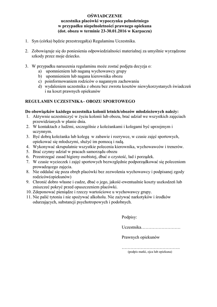 OŚWIADCZENIE uczestnika placówki wypoczynku pełnoletniego w przypadku niepełnoletności prawnego opiekuna (dot. obozu w terminie 23-30.01.2016 w Karpaczu) 1. Syn (córka) będzie przestrzegał(a) Regulaminu Uczestnika. 2. Zobowiązuje się do poniesienia odpowiedzialności materialnej za umyślnie wyrządzone szkody przez moje dziecko. 3. W przypadku naruszenia regulaminu może zostać podjęta decyzja o: a) upomnieniem lub naganą wychowawcy grupy b) upomnieniem lub nagana kierownika obozu c) poinformowaniem rodziców o nagannym zachowaniu d) wydaleniem uczestnika z obozu bez zwrotu kosztów niewykorzystanych świadczeń i na koszt prawnych opiekunów REGULAMIN UCZESTNIKA– OBOZU SPORTOWEGO Do obowiązków każdego uczestnika kolonii letnich/obozów młodzieżowych należy: 1. Aktywnie uczestniczyć w życiu kolonii lub obozu, brać udział we wszystkich zajęciach przewidzianych w planie dnia. 2. W kontaktach z ludźmi, szczególnie z koleżankami i kolegami być uprzejmym i uczynnym. 3. Być dobrą koleżanka lub kolegą w zabawie i rozrywce, w czasie zajęć sportowych, opiekować się młodszymi, służyć im pomocą i radą. 4. Wykonywać skrupulatnie wszystkie polecenia kierownika, wychowawców i trenerów. 5. Brać czynny udział w pracach samorządu obozu 6. Przestrzegać zasad higieny osobistej, dbać o czystość, ład i porządek. 7. W czasie wycieczek i zajęć sportowych bezwzględnie podporządkować się poleceniom prowadzącego zajęcia. 8. Nie oddalać się poza obręb placówki bez zezwolenia wychowawcy i podpisanej zgody rodziców(opiekunów) 9. Chronić dobro własne i cudze, dbać o jego, jakość-ewentualnie koszty uszkodzeń lub zniszczeć pokryć przed opuszczeniem placówki. 10. Zdeponować pieniądze i rzeczy wartościowe u wychowawcy grupy. 11. Nie palić tytoniu i nie spożywać alkoholu. Nie zażywać narkotyków i środków odurzających, substancji psychotropowych i podobnych. Podpisy: Uczestnika……………………… Prawnych opiekunów …………………………………. (podpis matki, ojca lub opiekuna)