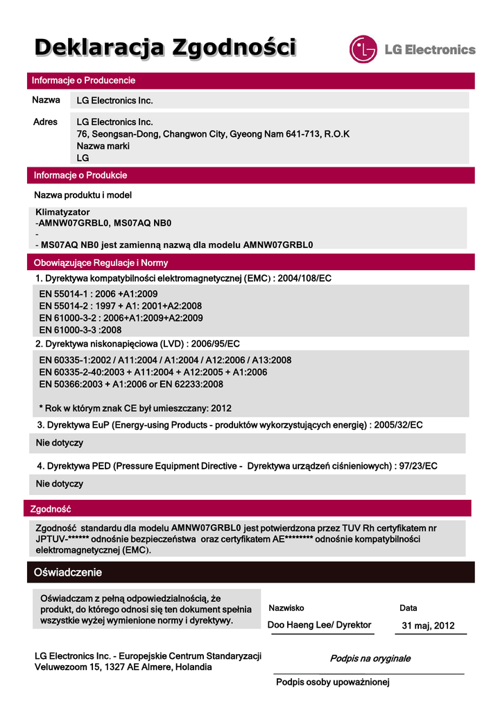 Deklaracja Zgodności Informacje o Producencie Nazwa LG Electronics Inc. Adres LG Electronics Inc. 76, Seongsan-Dong, Changwon City, Gyeong Nam 641-713, R.O.K Nazwa marki LG Informacje o Produkcie Nazwa produktu i model Klimatyzator -AMNW07GRBL0, MS07AQ NB0 - MS07AQ NB0 jest zamienną nazwą dla modelu AMNW07GRBL0 Obowiązujące Regulacje i Normy 1. Dyrektywa kompatybilności elektromagnetycznej (EMC) : 2004/108/EC EN 55014-1 : 2006 +A1:2009 EN 55014-2 : 1997 + A1: 2001+A2:2008 EN 61000-3-2 : 2006+A1:2009+A2:2009 EN 61000-3-3 :2008 2. Dyrektywa niskonapięciowa (LVD) : 2006/95/EC EN 60335-1:2002 / A11:2004 / A1:2004 / A12:2006 / A13:2008 EN 60335-2-40:2003 + A11:2004 + A12:2005 + A1:2006 EN 50366:2003 + A1:2006 or EN 62233:2008 * Rok w którym znak CE był umieszczany: 2012 3. Dyrektywa EuP (Energy-using Products - produktów wykorzystujących energię) : 2005/32/EC Nie dotyczy 4. Dyrektywa PED (Pressure Equipment Directive - Dyrektywa urządzeń ciśnieniowych) : 97/23/EC Nie dotyczyUzupełniające Informacje Zgodność Zgodność standardu dla modelu AMNW07GRBL0 jest potwierdzona przez TUV Rh certyfikatem nr JPTUV-****** odnośnie bezpieczeństwa oraz certyfikatem AE******** odnośnie kompatybilności elektromagnetycznej (EMC). Oświadczenie Oświadczam z pełną odpowiedzialnością, że produkt, do którego odnosi się ten dokument spełnia wszystkie wyżej wymienione normy i dyrektywy. LG Electronics Inc. - Europejskie Centrum Standaryzacji Veluwezoom 15, 1327 AE Almere, Holandia Nazwisko Data Doo Haeng Lee/ Dyrektor 31 maj, 2012 Podpis na oryginale Podpis osoby upoważnionej