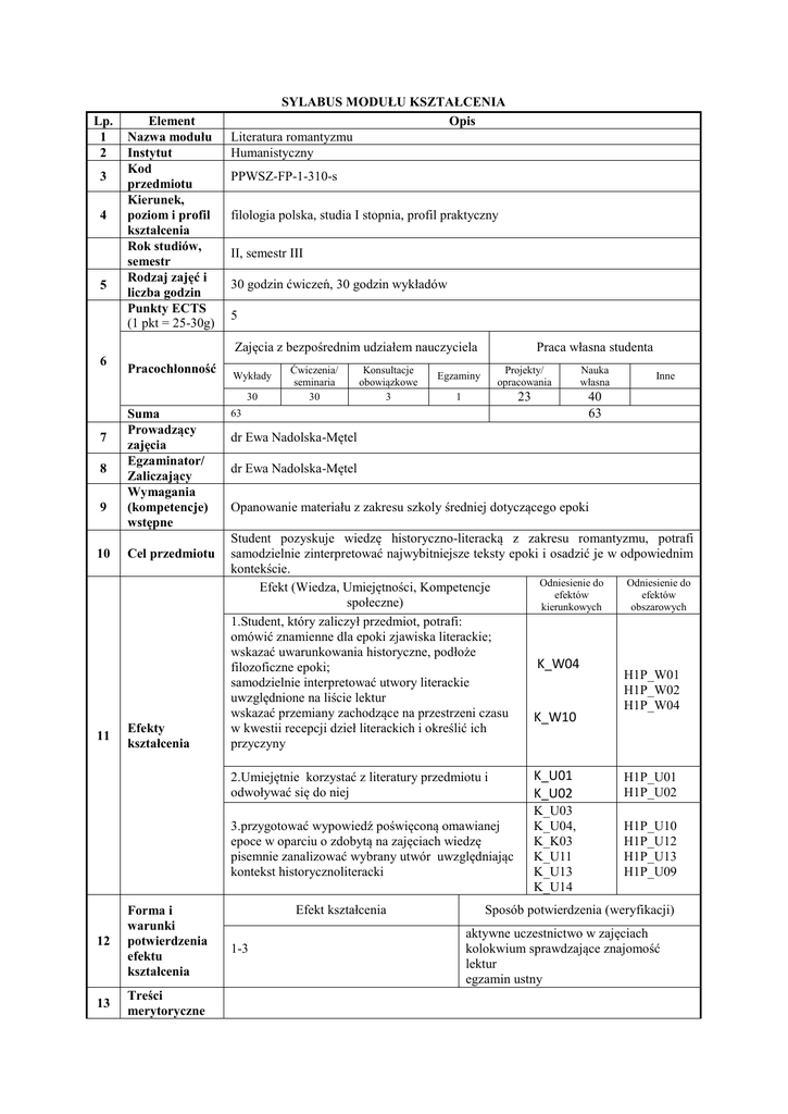 Lp. 1 2 3 4 5 Element Nazwa modułu Instytut Kod przedmiotu Kierunek, poziom i profil kształcenia Rok studiów, semestr Rodzaj zajęć i liczba godzin Punkty ECTS (1 pkt = 25-30g) SYLABUS MODUŁU KSZTAŁCENIA Opis Literatura romantyzmu Humanistyczny PPWSZ-FP-1-310-s filologia polska, studia I stopnia, profil praktyczny II, semestr III 30 godzin ćwiczeń, 30 godzin wykładów 5 Zajęcia z bezpośrednim udziałem nauczyciela 6 Pracochłonność Wykłady 30 7 8 9 Suma Prowadzący zajęcia Egzaminator/ Zaliczający Wymagania (kompetencje) wstępne 10 Cel przedmiotu 11 Efekty kształcenia 12 Forma i warunki potwierdzenia efektu kształcenia 13 Treści merytoryczne Ćwiczenia/ seminaria 30 Konsultacje obowiązkowe 3 Praca własna studenta Egzaminy Projekty/ opracowania Nauka własna 1 23 40 63 63 Inne dr Ewa Nadolska-Mętel dr Ewa Nadolska-Mętel Opanowanie materiału z zakresu szkoly średniej dotyczącego epoki Student pozyskuje wiedzę historyczno-literacką z zakresu romantyzmu, potrafi samodzielnie zinterpretować najwybitniejsze teksty epoki i osadzić je w odpowiednim kontekście. Odniesienie do Odniesienie do Efekt (Wiedza, Umiejętności, Kompetencje efektów efektów społeczne) kierunkowych obszarowych 1.Student, który zaliczył przedmiot, potrafi: omówić znamienne dla epoki zjawiska literackie; wskazać uwarunkowania historyczne, podłoże K_W04 filozoficzne epoki; H1P_W01 samodzielnie interpretować utwory literackie H1P_W02 uwzględnione na liście lektur H1P_W04 wskazać przemiany zachodzące na przestrzeni czasu K_W10 w kwestii recepcji dzieł literackich i określić ich przyczyny 2.Umiejętnie korzystać z literatury przedmiotu i odwoływać się do niej K_U01 K_U02 H1P_U01 H1P_U02 3.przygotować wypowiedź poświęconą omawianej epoce w oparciu o zdobytą na zajęciach wiedzę pisemnie zanalizować wybrany utwór uwzględniając kontekst historycznoliteracki K_U03 K_U04, K_K03 K_U11 K_U13 K_U14 H1P_U10 H1P_U12 H1P_U13 H1P_U09 Efekt kształcenia 1-3 Sposób potwierdzenia (weryfikacji) aktywne uczestnictwo w zajęciach kolokwium sprawdzające znajomość lektur egzamin ustny przedmiotu 14 Wykaz literatury podstawowej 15 Wykaz literatury uzupełniającej (pomocniczej) Zakres programowy obejmuje hist. lit. romantycznej z uwzględnieniem szerszego, europejskiego kontekstu(z przywołaniem utworów przynależnych do kanonu arcydzieł m.in.: Fausta Goethego, Eugeniusza Oniegina Puszkina, twórczości Byrona, Scotta, wybitnych prozaików europejskich: Musseta, Balzaca, Stendhala). Wykłady zmierzają ku syntetycznemu ujęciu, poświęcone więc będą romantycznej koncepcji świata, kreacji bohatera, charakterystycznym dla epoki gatunkom literackim (ballada, poemat dygresyjny, powieść poetycka), różnicom między polskimi a zachodnioeuropejskimi realizacjami, jak również wpływie romantyzmu na literaturę późniejaszą. Interpretacja najwybitniejszych dzieł wzbogaci obraz epoki o analityczne ujęcie. A.Witkowska, R. Przybylski, Romantyzm; Słownik Literatury polskiej XIX wieku, red. J. Bachórz, A. Kowalczykowa, Wrocław 1997; A. Kowalczykowa, Czym był romantyzm?, Warszawa 1990. T. Łubieński, M jak Mickiewicz,Warszawa 2005; A. Kowalczykowa, Juliusz Słowacki; Warszawa 1994; Romantyzm. Literatura, kultura i obyczaj. Studia, red. M. Jonca, M. Łoboz, Wrocław 2009; M. Kalinowska, Romantyczne antynomie samotności, Warszawa 1989; M. Kalinowska, Los, miłość, sacrum. Studia o dramacie i jego dwudziestowiecznej recepcji, Toruń 2003.