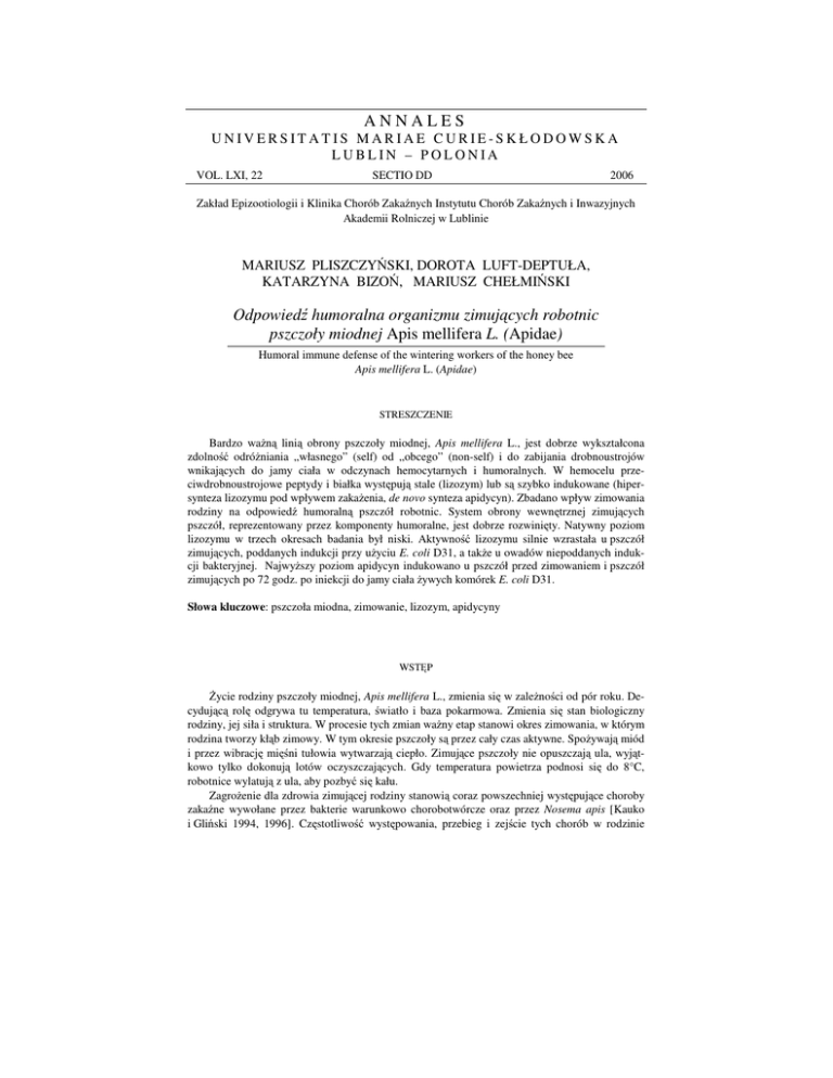 ANNALES UNIVERSITATIS MARIAE CURIE-SKŁODOWSKA LUBLIN – POLONIA VOL. LXI, 22 SECTIO DD 2006 Zakład Epizootiologii i Klinika Chorób Zaka nych Instytutu Chorób Zaka nych i Inwazyjnych Akademii Rolniczej w Lublinie MARIUSZ PLISZCZY SKI, DOROTA LUFT-DEPTUŁA, KATARZYNA BIZO , MARIUSZ CHEŁMI SKI Odpowied humoralna organizmu zimuj cych robotnic pszczoły miodnej Apis mellifera L. (Apidae) Humoral immune defense of the wintering workers of the honey bee Apis mellifera L. (Apidae) STRESZCZENIE Bardzo wa n lini obrony pszczoły miodnej, Apis mellifera L., jest dobrze wykształcona zdolno odró niania „własnego” (self) od „obcego” (non-self) i do zabijania drobnoustrojów wnikaj cych do jamy ciała w odczynach hemocytarnych i humoralnych. W hemocelu przeciwdrobnoustrojowe peptydy i białka wyst puj stale (lizozym) lub s szybko indukowane (hipersynteza lizozymu pod wpływem zaka enia, de novo synteza apidycyn). Zbadano wpływ zimowania rodziny na odpowied humoraln pszczół robotnic. System obrony wewn trznej zimuj cych pszczół, reprezentowany przez komponenty humoralne, jest dobrze rozwini ty. Natywny poziom lizozymu w trzech okresach badania był niski. Aktywno lizozymu silnie wzrastała u pszczół zimuj cych, poddanych indukcji przy u yciu E. coli D31, a tak e u owadów niepoddanych indukcji bakteryjnej. Najwy szy poziom apidycyn indukowano u pszczół przed zimowaniem i pszczół zimuj cych po 72 godz. po iniekcji do jamy ciała ywych komórek E. coli D31. Słowa kluczowe: pszczoła miodna, zimowanie, lizozym, apidycyny WST P ycie rodziny pszczoły miodnej, Apis mellifera L., zmienia si w zale no ci od pór roku. Decyduj c rol odgrywa tu temperatura, wiatło i baza pokarmowa. Zmienia si stan biologiczny rodziny, jej siła i struktura. W procesie tych zmian wa ny etap stanowi okres zimowania, w którym rodzina tworzy kł b zimowy. W tym okresie pszczoły s przez cały czas aktywne. Spo ywaj miód i przez wibracj mi ni tułowia wytwarzaj ciepło. Zimuj ce pszczoły nie opuszczaj ula, wyj tkowo tylko dokonuj lotów oczyszczaj cych. Gdy temperatura powietrza podnosi si do 8°C, robotnice wylatuj z ula, aby pozby si kału. Zagro enie dla zdrowia zimuj cej rodziny stanowi coraz powszechniej wyst puj ce choroby zaka ne wywołane przez bakterie warunkowo chorobotwórcze oraz przez Nosema apis [Kauko i Gli ski 1994, 1996]. Cz stotliwo wyst powania, przebieg i zej cie tych chorób w rodzinie 180 M. PLISZCZY SKI, D. LUFT-DEPTUŁA, K. BIZO , M. CHEŁMI SKI zimuj cej zale w du ym stopniu od stanu układu odporno ciowego robotnic. Immunosupresja, zwi zana ze znacznym zmniejszeniem stanu reaktywno ci immunologicznej organizmu, jest coraz cz ciej spowodowana ska eniem rodowiska, hodowl pszczół w warunkach odbiegaj cych znacznie od naturalnych, jakie panuj w zasiedlanych przez nie niszach ekologicznych, działaniem ró nych stresów. W ród stresów wa ne znaczenie odgrywa niepokojenie zimuj cej rodziny, brak lub nieodpowiedni jako ciowo pokarm, gwałtowne zmiany temperatury. Jedn z przyczyn immunosupresji jest ska enie rodowiska, stosowanie leków, których niepodanym efektem działania jest osłabienie odpowiedzi immunologicznej, inwazja roztocza Varroa destructor, Nosema apis, b d zamierzone działanie człowieka, czyli stosowanie rodków immunosupresyjnych [Jarosz 1994, Gli ski i Jarosz 1998, Jarosz i Gli ski 1999, Gli ski i Kauko 2000]. Wa n rol przy tym sposobie prowadzenia hodowli odgrywaj : dopływ pokarmu do rodziny, temperatura rodowiska i warunki zimowania. Brak pokarmu, choroby, rozwi zanie kł bu zimowego prowadz do mierci zimuj cej rodziny lub jej silnego osłabienia na wiosn . Ocena stanu przeciwzaka nej odporno ci humoralnej rodziny zimuj cej pszczoły miodnej jest celem przeprowadzonych bada . Zastosowano w nich dwa modele eksperymentalne. W jednym modelu, w którym wykorzystano pszczoły robotnice o niepobudzonym eksperymentalnie układzie odporno ciowym, okre lono wpływ zimowania na aktywno bakteriolityczn hemolimfy typu lizozymu. W drugim modelu, w którym obiektem bada były pszczoły o odporno ci indukowanej przez zaka enie jamy ciała ywymi komórkami Escherichia coli D31, okre lono wpływ zimowania na dwa humoralne parametry odporno ci nabytej: hipersyntez lizozymu oraz na poziom apidycyn w hemolimfie. Te parametry w pełni odzwierciedlaj stan odporno ci humoralnej owada [Gli ski i Jarosz 1993, Gli ski i Kostro 2001]. MATERIAŁ I METODY Badania przeprowadzono na robotnicach pszczoły miodnej, Apis mellifera L., pochodz cych z pasieki Oddziału Pszczelnictwa Instytutu Sadownictwa i Kwiaciarstwa w Puławach. Pszczoły pobierano do bada w odst pach 2-tygodniowych w 2003 i 2004 r. (tab. 1). Okres zimowania przypadał na miesi ce listopad– kwiecie . Badania wykonywano na grupie około 200 robotnic po 24-godzinnej aklimatyzacji. W trakcie bada pszczoły utrzymywano w klateczkach, w temperaturze 29°C i wilgotno ci wzgl dnej 85% oraz karmiono ciastem miodowo-cukrowym. Okres zimowania trwał od 17 listopada 2003 r. do 15 marca 2004 r. Rodziny, z których pochodziły pszczoły były wolne od warrozy, zgnilca ameryka skiego i zgnilca europejskiego. Aktywno bakteriolityczn typu lizozymu w hemolimfie u pszczół robotnic okre lono w czasie 0 oraz po 48 i 72 godz. aklimatyzacji pszczół, natomiast nasilenie hipersyntezy lizozymu i poziom apidycyn okre lono u robotnic po czasie 0, 48, 72 godz. po zaka eniu jamy ciała pszczoły 15 ⋅ 103 komórek E. coli D31/2 µl płynu dla Lepidoptera. Zaka enia dokonano po pobraniu próbek hemolimfy w czasie 0. Owady, które poddano immunizacji oraz owady nieimmunizowane, stanowi ce grup kontroln , były utrzymywane w identycznych warunkach do wiadczalnych. Ka dorazowo grupa liczyła od 50 do 100 pszczół robotnic. Hemolimf pobierano z zatoki grzbietowej do probówek Eppendorfa na ła ni lodowej. Zastosowanie ła ni lodowej zapobiegało melanizacji hemolimfy. Celem zobiektyzowania, wyniki poddano analizie statystycznej (test chi2 przy p<0.