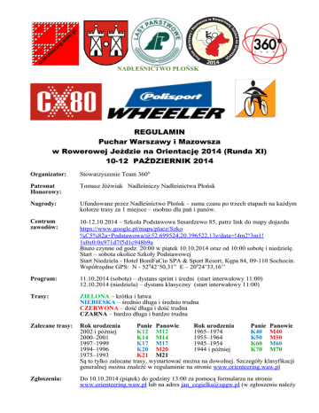 NADLEŚNICTWO PŁOŃSK REGULAMIN Puchar Warszawy i Mazowsza w Rowerowej Jeździe na Orientację 2014 (Runda XI) 10-12 PAŹDZIERNIK 2014 Organizator: Stowarzyszenie Team 360° Patronat Honorowy: Tomasz Jóźwiak Nadleśniczy Nadleśnictwa Płońsk Nagrody: Ufundowane przez Nadleśnictwo Płońsk – suma czasu po trzech etapach na każdym kolorze trasy za 1 miejsce – osobno dla pań i panów. Centrum zawodów: 10-12.10.2014 – Szkoła Podstawowa Smardzewo 85, patrz link do mapy dojazdu https://www.google.pl/maps/place/Szko %C5%82a+Podstawowa/@52.699524,20.396522,13z/data=!4m2!3m1! 1s0x0:0x971d7f5d1c948b9a Biuro czynne od godz. 20:00 w piątek 10.10.2014 oraz od 10:00 sobotę i niedzielę. Start – sobota okolice Szkoły Podstawowej Start Niedziela - Hotel BoniFaCio SPA & Sport Resort, Kępa 84, 09-110 Sochocin. Współrzędne GPS: N - 52042’50,31” E – 20024’33,16’’ Program: 11.10.2014 (sobota) – dystans sprint i średni (start interwałowy 11:00) 12.10.2014 (niedziela) – dystans klasyczny (start interwałowy 11:00) Trasy: ZIELONA – krótka i łatwa NIEBIESKA – średnio długa i średnio trudna CZERWONA – dość długa i dość trudna CZARNA – bardzo długa i bardzo trudna Zalecane trasy: Rok urodzenia Panie Panowie Rok urodzenia Panie Panowie 2002 i później K12 M12 1965–1974 K40 M40 2000–2001 K14 M14 1955–1964 K50 M50 1997–1999 K17 M17 1945–1954 K60 M60 1994–1996 K20 M20 1944 i później K70 M70 1975–1993 K21 M21 Są to tylko zalecane trasy, wystartować można na dowolnej. Szczegóły klasyfikacji generalnej można znaleźć w regulaminie na stronie www.orienteering.waw.pl Zgłoszenia: Do 10.10.2014 (piątek) do godziny 13:00 za pomocą formularza na stronie www.orienteering.waw.pl lub na adres [email protected] (w zgłoszeniu należy obowiązkowo podać rok urodzenia) Noclegi : Szkoła Podstawowa Smardzewo 85 – możliwość noclegu od piątku 10.10.2014 od godziny 20:00. Warunki – sale lekcyjne należy posiadać własny śpiwór i karimatę lub materac, możliwość dostępu do kuchni /jest gazowa plus czajniki/. Zapotrzebowanie na nocleg należy podać w uwagach przy zgłoszeniu. Wpisowe: Zgłoszenia w terminie poprzez stronę www.orienteering.waw.pl 10 zł/za 1 start Zgłoszenia w terminie poprzez e-mail [email protected] 15 zł/za 1 start Zgłoszenia w dniu zawodów /w miarę posiadanych map/ 20 zł/za 1 start Osoby zgłoszone, a nie startujące 5 zł/za 1 start Mapy i teren: Nowe Specjalistyczne mapy do rowerowej jazdy na orientację w skali od 1:7 500 do 1:20 000, e-2.5m. Aktualność: wiosna 2014. Numer startowy: Każdy zawodnik otrzyma imienny numer startowy, który obowiązuje podczas całego cyklu Mistrzostw. Wydanie duplikatu numeru za opłatą 5 PLN. Obowiązki uczestników: Zawodnicy muszą posiadać kaski ochronne. Dzieci do lat 10 i nie posiadający karty rowerowej muszą przebywać pod opieką dorosłych. Potwierdzanie punktów: Karta startowa Klasyfikacja: Prowadzona będzie w poszczególnych kategoriach wiekowych w postaci rankingu zgodnie z Regulaminem Pucharu Warszawy i Mazowsza zamieszczonym na stronie www.orienteering.waw.pl Nagrody: Podsumowanie zawodów i wręczenie nagród nastąpi w dniu16.11.2014 r. Specjalna nagroda w postaci losowania jednego lub dwóch rowerów firmy Wheeler wśród osób, które wystartują w minimum jednym etapie w 9 rundach cyklu, za każdy start powyżej, zawodnik otrzymuję dodatkowy kupon biorący udział w losowaniu. Jedna osoba maksymalnie może mieć 4 kupony biorące udział w losowaniu. rowerów. Serdecznie zapraszamy do udziału wszystkie osoby posiadające rower. Więcej informacji na: www.orienteering.waw.pl, www.mtbo.pl oraz www.team360.pl