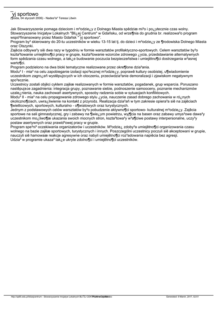 ¯yj sportowo (¶roda, 04 styczeñ 2006) - Nades³a³ Teresa Litwin Jak Stowarzyszenie pomaga dzieciom i m³odzie¿y z Dolnego Miasta spêdziæ mi³o i po¿ytecznie czas wolny. Stowarzyszenie Inicjatyw Lokalnych "Bli¿ej Centrum" w Gdañsku, od wrze¶nia do grudnia br. realizowa³o program wspó³finansowany przez Miasto Gdañsk "¯yj sportowo". Program by³ skierowany do 20-tu uczestników w wieku 13-15 lat tj. do dzieci i m³odzie¿y ze ¶rodowiska Dolnego Miasta oraz Olszynki. Zajêcia odbywa³y siê dwa razy w tygodniu w formie warsztatów profilaktyczno-sportowych. Celem warsztatów by³o kszta³towanie umiejêtno¶ci pracy w grupie, kszta³towanie wzorców zdrowego ¿ycia, przedstawianie alternatywnych form spêdzania czasu wolnego, a tak¿e budowanie poczucia bezpieczeñstwa i umiejêtno¶ci dostrzegania w³asnej warto¶ci. Program podzielono na dwa bloki tematyczne realizowane przez okre¶lone dzia³ania. Modu³ I - mia³ na celu zapobieganie izolacji spo³ecznej m³odzie¿y, poprawê kultury osobistej, u¶wiadomienie uczestnikom zagro¿eñ wystêpuj±cych w ich otoczeniu, przeciwdzia³anie demoralizacji i zjawiskom negatywnym spo³ecznie. Uczestnicy zostali objêci cyklem zajêæ realizowanych w formie warsztatów, pogadanek, grup wsparcia. Poruszano nastêpuj±ce zagadnienia: integracja grupy, poznawanie siebie, podnoszenie samooceny, poznanie mechanizmów uzale¿nienia, nauka zachowañ asertywnych, sposoby radzenia sobie w sytuacjach konfliktowych. Modu³ II - mia³ na celu propagowanie zdrowego stylu ¿ycia, nauczenie zasad dobrego zachowania w ró¿nych okoliczno¶ciach, uwra¿liwienie na kontakt z przyrod±. Realizacja dzia³añ w tym zakresie opiera³a siê na zajêciach ¶wietlicowych, sportowych, kulturalno - o¶wiatowych oraz turystycznych. Jednym z podstawowych celów warsztatów by³o pobudzenie aktywno¶ci sportowo- kulturalnej m³odzie¿y. Zajêcia sportowe na sali gimnastycznej, gry i zabawy na ¶wie¿ym powietrzu, wyj¶cia na basen oraz zabawy umys³owe dawa³y uczestnikom mo¿liwo¶æ ukazania swoich mocnych stron, kszta³towa³y w³a¶ciwe postawy interpersonalne, uczy³y postaw asertywnych oraz prawid³owej pracy w grupie. Program spe³ni³ oczekiwania organizatorów i uczestników. M³odzie¿ zdoby³a umiejêtno¶ci organizowania czasu wolnego na bazie zajêæ sportowych, turystycznych i innych. Poszczególni uczestnicy poczuli siê akceptowani w grupie, nauczyli siê hamowaæ reakcje agresywne oraz nabyli umiejêtno¶ci roz³adowania napiêcia bez agresji. Udzia³ w programie ukaza³ tak¿e ukryte zdolno¶ci i umiejêtno¶ci uczestników. http://sp65.edu.pl/blizejcentrum - Stowarzyszenie Inicjatyw Lokalnych BLI¯EJ CENTRUM Powered w Gdañsku by Mambo Generated: 9 March, 2017, 02:51