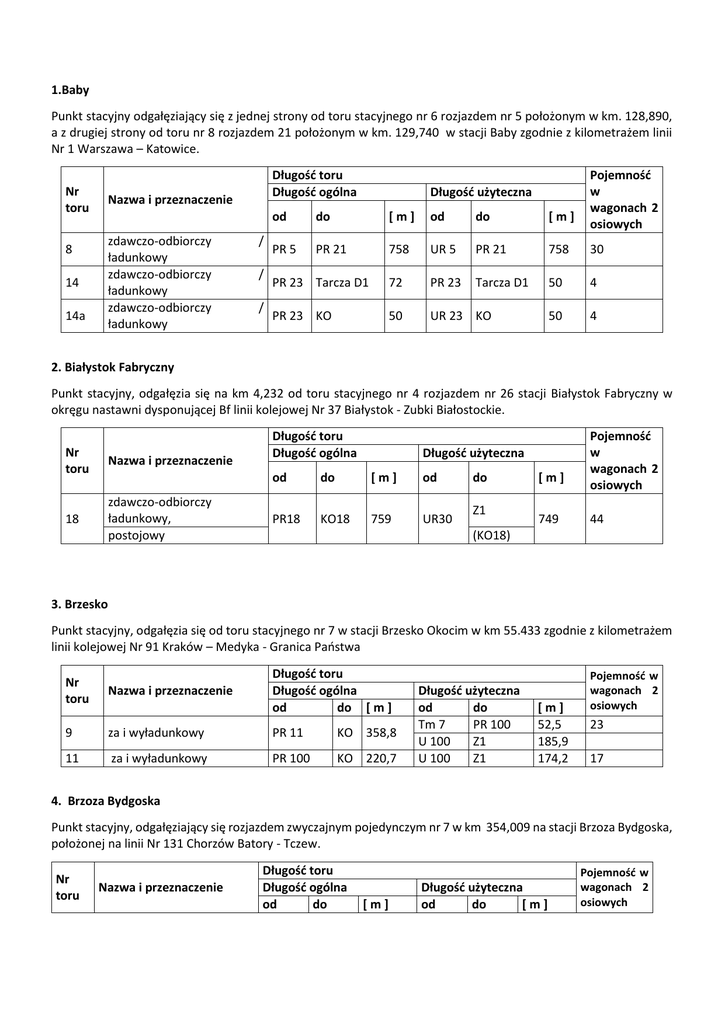 1.Baby Punkt stacyjny odgałęziający się z jednej strony od toru stacyjnego nr 6 rozjazdem nr 5 położonym w km. 128,890, a z drugiej strony od toru nr 8 rozjazdem 21 położonym w km. 129,740 w stacji Baby zgodnie z kilometrażem linii Nr 1 Warszawa – Katowice. Nr toru 8 14 14a Długość toru Długość ogólna Nazwa i przeznaczenie zdawczo-odbiorczy ładunkowy zdawczo-odbiorczy ładunkowy zdawczo-odbiorczy ładunkowy / / / Długość użyteczna Pojemność w wagonach 2 osiowych od do [m] od do [m] PR 5 PR 21 758 UR 5 PR 21 758 30 PR 23 Tarcza D1 72 PR 23 Tarcza D1 50 4 PR 23 KO 50 UR 23 KO 50 4 2. Białystok Fabryczny Punkt stacyjny, odgałęzia się na km 4,232 od toru stacyjnego nr 4 rozjazdem nr 26 stacji Białystok Fabryczny w okręgu nastawni dysponującej Bf linii kolejowej Nr 37 Białystok - Zubki Białostockie. Nr toru Nazwa i przeznaczenie 18 zdawczo-odbiorczy ładunkowy, postojowy Długość toru Długość ogólna Długość użyteczna od do [m] od PR18 KO18 759 UR30 do Z1 [m] 749 Pojemność w wagonach 2 osiowych 44 (KO18) 3. Brzesko Punkt stacyjny, odgałęzia się od toru stacyjnego nr 7 w stacji Brzesko Okocim w km 55.433 zgodnie z kilometrażem linii kolejowej Nr 91 Kraków – Medyka - Granica Państwa Długość toru Długość ogólna od do [ m ] Nr toru Nazwa i przeznaczenie 9 za i wyładunkowy PR 11 KO 358,8 11 za i wyładunkowy PR 100 KO 220,7 Długość użyteczna od do Tm 7 PR 100 U 100 Z1 U 100 Z1 [m] 52,5 185,9 174,2 Pojemność w wagonach 2 osiowych 23 17 4. Brzoza Bydgoska Punkt stacyjny, odgałęziający się rozjazdem zwyczajnym pojedynczym nr 7 w km 354,009 na stacji Brzoza Bydgoska, położonej na linii Nr 131 Chorzów Batory - Tczew. Nr toru Nazwa i przeznaczenie Długość toru Długość ogólna od do [m] Długość użyteczna od do [m] Pojemność w wagonach 2 osiowych 5 15 zdawczo-odbiorczy, ładunkowy zdawczo-odbiorczy, ładunkowy KR 7 PR 10 223,14 U7 PR 10 206,78 20 PR 10 KT 230,03 KR 10 Z1 Z1 19 5. Chociw Łaski Punkt stacyjny odgałęziający się od toru nr 6 stacji Chociw Łaski rozjazdem nr 10 w km 146,130 linii Katowice - Tczew i rozjazdem nr 6 od toru nr 4 w km 145,800 linii Katowice Tczew. Nr toru 7 27 Nazwa i przeznaczenie zdawczo-odbiorczy ładunkowy zdawczo-odbiorczy ładunkowy / / Długość toru Długość ogólna od do [m] Długość użyteczna od do [m] Pojemność w wagonach 2 osiowych KR 11 PR 12 155 UR 11 PR 12 138 14 KR 12 KO 130 UR 12 KO 122 12 6. Ciechanów Punkt stacyjny, usytuowany jest na torze nr 26 i odgałęzia się rozjazdem nr 401 w km 97,883 od toru nr 10 stacji Ciechanów na linii Nr 9 Warszawa Wschodnia Osobowa – Gdańsk Główny. Nr toru Nazwa i przeznaczenie 26 Zdawczo-odbiorczy ładunkowy Długość toru Długość ogólna / Długość użyteczna od do [m] od do [m] PR401 KO 575 U401 Z1 565 Pojemność w wagonach 2 osiowych 56 7. Ełk Punkt stacyjny, odgałęzia się zwrotnicą rozjazdu nr 118 od wstawki między rozjazdami nr 116 i 118 stacji Ełk w okręgu nastawni wykonawczej „Eo1” na km 102,768 linii kolejowej nr 38 Białystok – Bartoszyce – Głomno Długość toru Długość ogólna od do [m] ładunkowy PR 123 KO 220 ładunkowy PR 124 KO 318 Nr toru Nazwa i przeznaczenie 12 14 Długość użyteczna od do [m] Z1 UR 123 160 (KO 12) Z1 UR 124 256 (KO 14) Pojemność w wagonach 2 osiowych 16 25 8. Giżycko Punkt stacyjny, odgałęzia się zwrotnicą rozjazdu nr 39 od toru stacyjnego nr 8 stacji Giżycko w okręgu nastawni dysponującej Go1 na km 151,231 linii kolejowej nr 38 Białystok – Bartoszyce Nazwa i przeznaczenie Długość toru Długość ogólna Nr toru 8 ładunkowy Długość użyteczna od do [m] PR 34 Km 310 0,417 od do [m] PR 34 Km 0,417 310 Pojemność w wagonach 2 osiowych 31 9. Gomunice Punkt stacyjny, odgałęziający się od toru stacyjnego nr 3 z jednej strony rozjazdem nr 4 położonym w km. 176,520, a z drugiej strony rozjazdem 22 położonym w km. 177,450 w stacji Gomunice zgodnie z kilometrażem linii Nr 1 Warszawa – Katowice. Nr toru 7 9 Długość toru Długość ogólna Nazwa i przeznaczenie zdawczo-odbiorczy ładunkowy zdawczo-odbiorczy ładunkowy / / Długość użyteczna Pojemność w wagonach 2 osiowych od do [m] od do [m] KR 22 KR 16 726 UR 16 UR 17 656 22 KR 16 KR 17 392 UR 16 UR 17 368 18 10. Jasło Punkt stacyjny, odgałęzia się na linii kolejowej Nr 108 Stróże - Krościenko Granica Państwa na km 45.440 od toru stacyjnego nr 4a rozjazdem nr 101 przy nastawni wykonawczej „Js-1” Nr toru Nazwa i przeznaczenie 4 ładunkowy Długość toru Długość ogólna od do [m] PR 101 PR 12 200,78 Pojemność wagonach osiowych Długość użyteczna od do [m] U 101 U 12 106,1 w 2 10 11. Kraków – Nowa Huta Szlakowy punkt stacyjny, odgałęziający się od rozjazdu nr 20 położonym w km. 8,112 szlaku jednotorowego Kraków Nowa Huta NHA – Kraków Krzesławice, linii nr 940 Kraków Nowa Huta NHB- Kraków Krzesławice (koniec linii), odgałęziającą się od toru głównego Nr 1 położonym w km. 8,008 szlaku jednotorowego Kraków Nowa Huta NHA – Kraków Krzesławice. Nr toru Nazwa i przeznaczenie 2 zdawczo-odbiorczy 4 6 odstawczy odstawczy 12 łącznikowy 14 wagowy 16 za i wyładunkowy Długość toru Długość ogólna od do KR3 KR 20 2 KR16 KO KR16 KO PR2 KR19 3 PR2 KR19 3 KR23 KO Długość użyteczna [ m ] od do U3 492 U20 2 573 U16 KO 576 U16 KO U2 148 U19 3 U2 149 U19 3 211 U23 KO Pojemność w wagonach 2 [ m ] osiowych 451 45 546 547 55 55 104 - 105 - 189 19 18 20 za i wyładunkowy za i wyładunkowy KR23 PT km. 8.488 34 za i wyładunkowy KR12 36 łącznikowy KR17 38 za i wyładunkowy KR17 40 42 44 34a 1/3 1/5 za i wyładunkowy odstawczy za i wyładunkowy wyciągowy wstawka torowa wstawka torowa KR26 KR25 KR27 PR1 KR1 KR1 2/12 wstawka torowa KR2 3/11 wstawka torowa KR1 11/14 wstawka torowa KR11 15/19 wstawka torowa KR15 KO KO KR2 6 PR2 4 KR2 7 KO KO KO KO PR3 PR5 PR1 2 PR1 1 PR1 4 PR1 9 186 111 U23 PT km. 8.488 334 U12 243 U17 321 U17 175 148 136 304 18 50