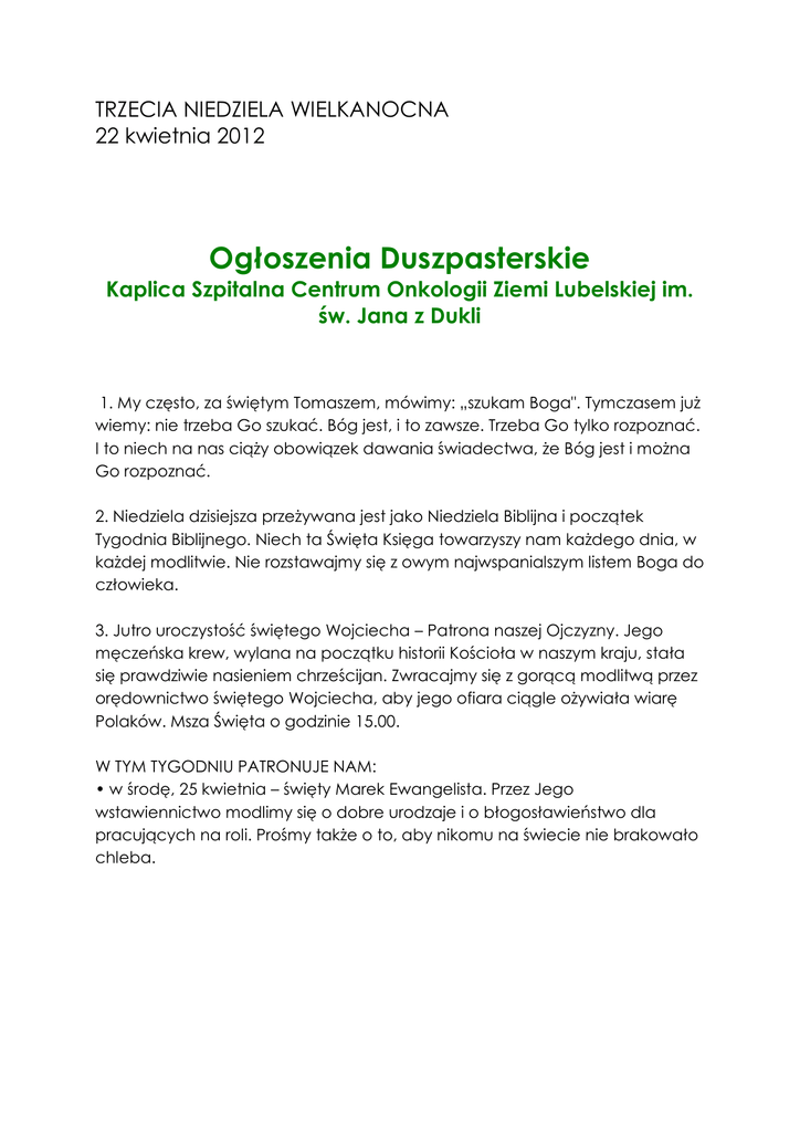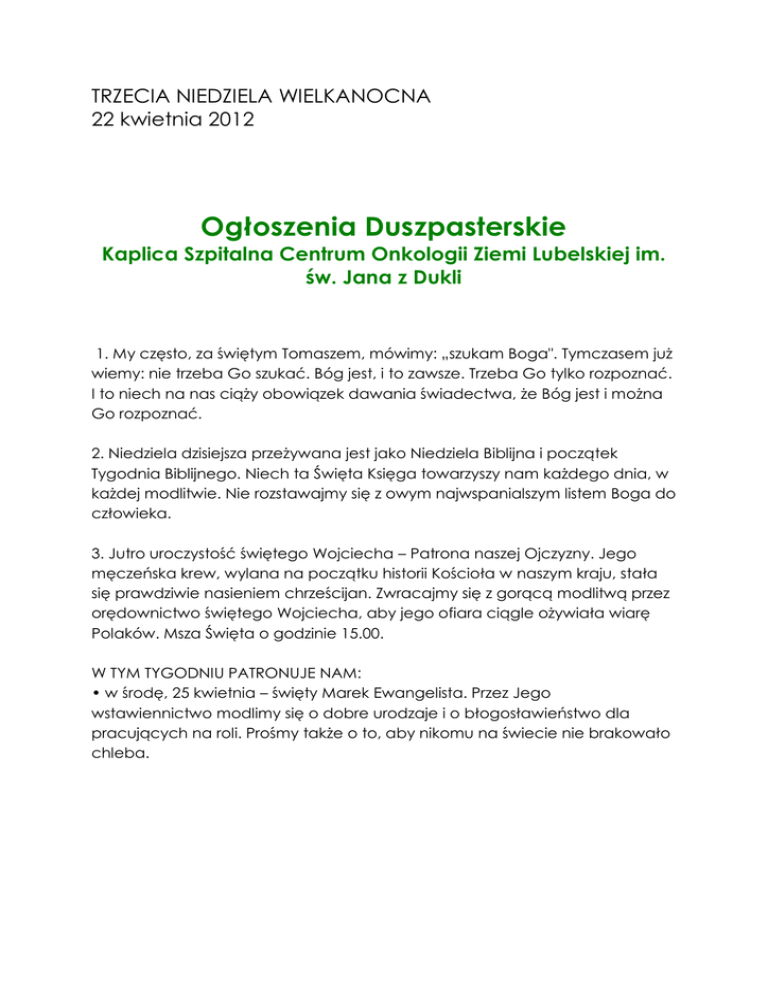 TRZECIA NIEDZIELA WIELKANOCNA 22 kwietnia 2012 Ogłoszenia Duszpasterskie Kaplica Szpitalna Centrum Onkologii Ziemi Lubelskiej im. św. Jana z Dukli 1. My często, za świętym Tomaszem, mówimy: „szukam Boga". Tymczasem już wiemy: nie trzeba Go szukać. Bóg jest, i to zawsze. Trzeba Go tylko rozpoznać. I to niech na nas ciąży obowiązek dawania świadectwa, że Bóg jest i można Go rozpoznać. 2. Niedziela dzisiejsza przeżywana jest jako Niedziela Biblijna i początek Tygodnia Biblijnego. Niech ta Święta Księga towarzyszy nam każdego dnia, w każdej modlitwie. Nie rozstawajmy się z owym najwspanialszym listem Boga do człowieka. 3. Jutro uroczystość świętego Wojciecha – Patrona naszej Ojczyzny. Jego męczeńska krew, wylana na początku historii Kościoła w naszym kraju, stała się prawdziwie nasieniem chrześcijan. Zwracajmy się z gorącą modlitwą przez orędownictwo świętego Wojciecha, aby jego ofiara ciągle ożywiała wiarę Polaków. Msza Święta o godzinie 15.00. W TYM TYGODNIU PATRONUJE NAM: • w środę, 25 kwietnia – święty Marek Ewangelista. Przez Jego wstawiennictwo modlimy się o dobre urodzaje i o błogosławieństwo dla pracujących na roli. Prośmy także o to, aby nikomu na świecie nie brakowało chleba.