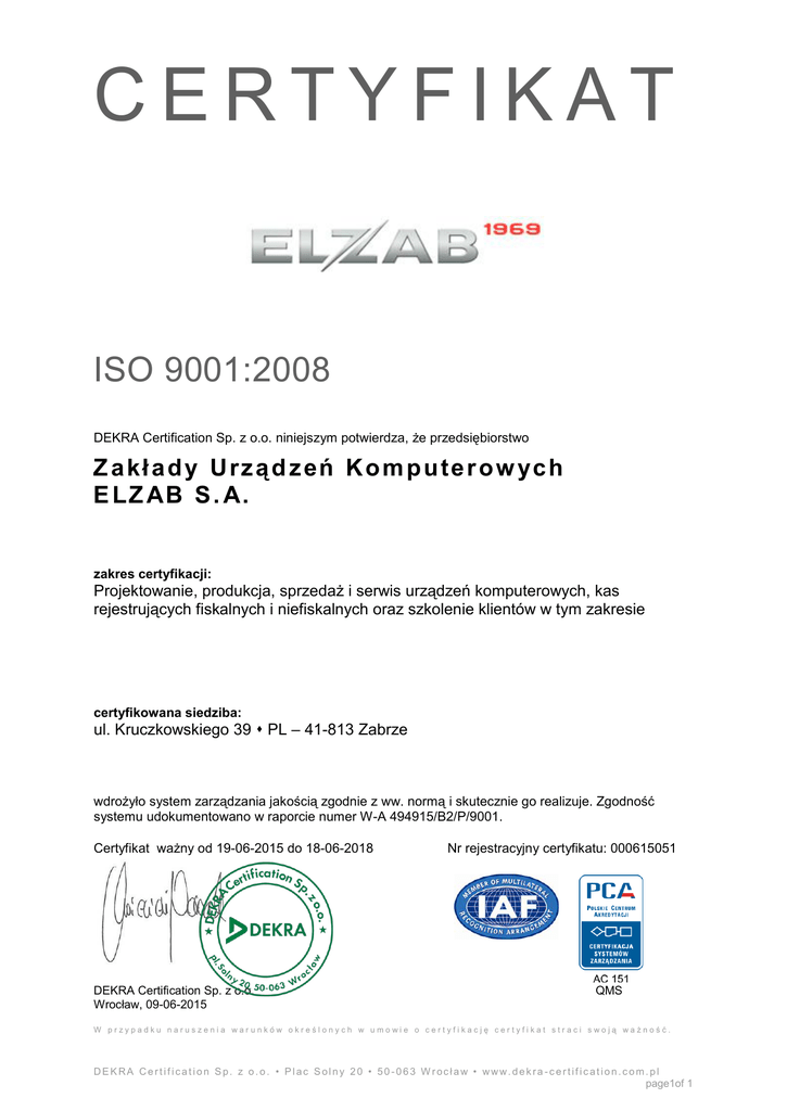 CERTYFIKAT ISO 9001:2008 DEKRA Certification Sp. z o.o. niniejszym potwierdza, że przedsiębiorstwo Z a k ł a d y U r z ą d z e ń K o m p u t e r ow yc h E L Z AB S . A. zakres certyfikacji: Projektowanie, produkcja, sprzedaż i serwis urządzeń komputerowych, kas rejestrujących fiskalnych i niefiskalnych oraz szkolenie klientów w tym zakresie certyfikowana siedziba: ul. Kruczkowskiego 39 PL – 41-813 Zabrze wdrożyło system zarządzania jakością zgodnie z ww. normą i skutecznie go realizuje. Zgodność systemu udokumentowano w raporcie numer W-A 494915/B2/P/9001. Certyfikat ważny od 19-06-2015 do 18-06-2018 DEKRA Certification Sp. z o.o. Wrocław, 09-06-2015 Nr rejestracyjny certyfikatu: 000615051 QMS W przypadku naruszenia warunków określonych w umowie o certyfikację certyfikat straci swoją ważność. DEKRA Certification Sp. z o.o. • Plac Solny 20 • 50 -063 W rocław • www.dekra -certification.com.pl page1of 1