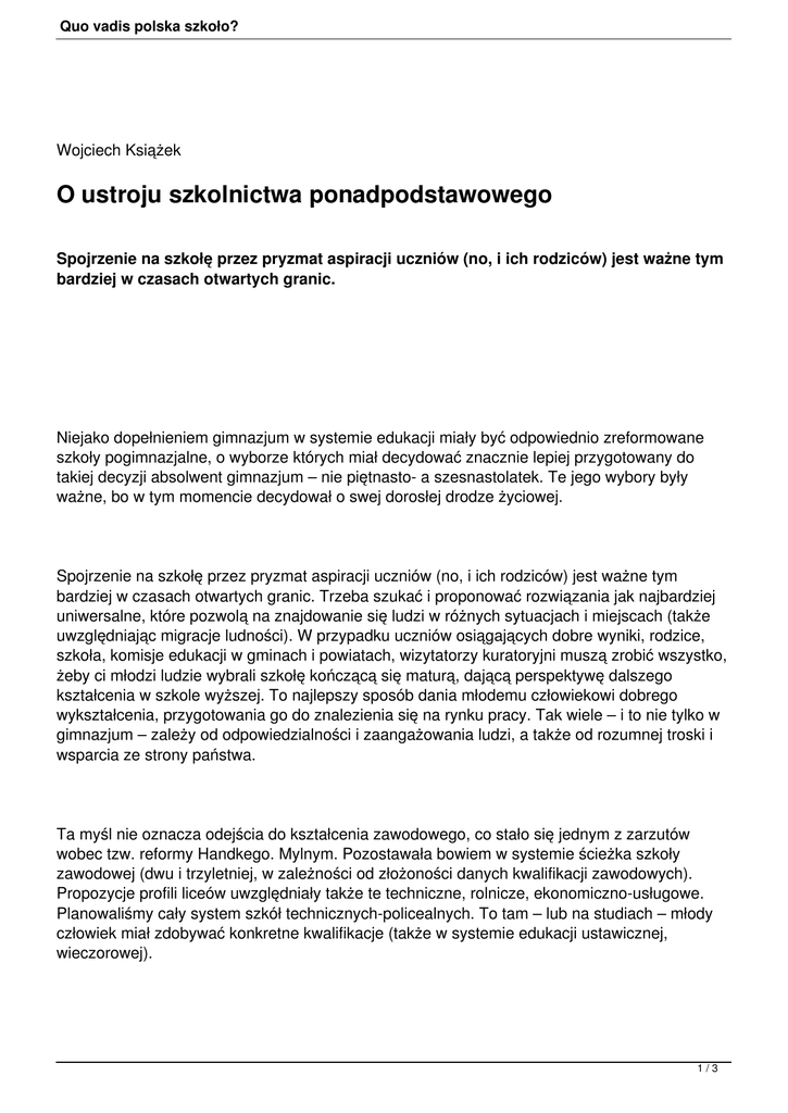 Quo vadis polska szkoło? Wojciech Książek O ustroju szkolnictwa ponadpodstawowego Spojrzenie na szkołę przez pryzmat aspiracji uczniów (no, i ich rodziców) jest ważne tym bardziej w czasach otwartych granic. Niejako dopełnieniem gimnazjum w systemie edukacji miały być odpowiednio zreformowane szkoły pogimnazjalne, o wyborze których miał decydować znacznie lepiej przygotowany do takiej decyzji absolwent gimnazjum – nie piętnasto- a szesnastolatek. Te jego wybory były ważne, bo w tym momencie decydował o swej dorosłej drodze życiowej. Spojrzenie na szkołę przez pryzmat aspiracji uczniów (no, i ich rodziców) jest ważne tym bardziej w czasach otwartych granic. Trzeba szukać i proponować rozwiązania jak najbardziej uniwersalne, które pozwolą na znajdowanie się ludzi w różnych sytuacjach i miejscach (także uwzględniając migracje ludności). W przypadku uczniów osiągających dobre wyniki, rodzice, szkoła, komisje edukacji w gminach i powiatach, wizytatorzy kuratoryjni muszą zrobić wszystko, żeby ci młodzi ludzie wybrali szkołę kończącą się maturą, dającą perspektywę dalszego kształcenia w szkole wyższej. To najlepszy sposób dania młodemu człowiekowi dobrego wykształcenia, przygotowania go do znalezienia się na rynku pracy. Tak wiele – i to nie tylko w gimnazjum – zależy od odpowiedzialności i zaangażowania ludzi, a także od rozumnej troski i wsparcia ze strony państwa. Ta myśl nie oznacza odejścia do kształcenia zawodowego, co stało się jednym z zarzutów wobec tzw. reformy Handkego. Mylnym. Pozostawała bowiem w systemie ścieżka szkoły zawodowej (dwu i trzyletniej, w zależności od złożoności danych kwalifikacji zawodowych). Propozycje profili liceów uwzględniały także te techniczne, rolnicze, ekonomiczno-usługowe. Planowaliśmy cały system szkół technicznych-policealnych. To tam – lub na studiach – młody człowiek miał zdobywać konkretne kwalifikacje (także w systemie edukacji ustawicznej, wieczorowej). 1/3 Quo vadis polska szkoło? Następcy zmienili ten projekt. Gimnazjum zawisło w próżni. Otwarcie (bezterminowe) przez koalicję SLD-PSL prawnej możliwości łączenia szkół podstawowych i gimnazjów w zespoły stworzyło model dziewięciolatki (6 + 3). Komentarzem do tej sytuacji niech będzie fragment tekstu, który przygotował prof. Mirosław Handke, były rektor AG-H (czyli osoba znająca styk oświaty ze szkolnictwem wyższym, stan przygotowania absolwentów liceów i techników), Minister Edukacji Narodowej w latach 1997-2000. To też znak czasu, że tekst ten nie został opublikowany (chociażby fragmenty w dziale listów) w „Uważam Rze”, mimo że jest odpowiedzią na drukowany tam artykuł „Elegia dla Liceów” autorstwa Andrzeja Mikosza. To nie są dobre praktyki. To pismo, którego jestem stałym czytelnikiem, powinno umożliwiać polemikę, oddawanie głosu różnym stronom sporu. Ale zanim oddam głos memu byłemu szefowi (którego szanuję także za akcent na formacyjny, wychowawczo-patriotyczny wymiar polskiej szkoły) jeszcze jedna uwaga do ustroju szkolnego. Pisałem niedawno, że gimnazjum stało się taką „przelotówką”. Niestety, dotyczy to także liceów, w których efektywna nauka to około dwa i pół roku (ostatnie pół, to już czas ostatnich przygotowań i zdawania egzaminu maturalnego). Marzy mi się, żeby można było dodać rok do liceów. Żeby młodzież miała w nim szanse na większe zakorzenienie się, poznanie siebie, stworzenie wspólnoty (problem ważny tym bardziej, gdy nie funkcjonuje zespół gimnazjum + liceum). Akcentuję ten wątek, gdyż zmiany programowe wprowadzone w ostatnim czasie, bardzo szybki wybór specjalizacji w LO (teoretycznie po, ale praktycznie przed pierwszą klasą) ten wspólnotowy, formacyjny wymiar szkoły ponadgimnazjalnej jeszcze bardziej narusza. A teraz głos ma minister Mirosław Handke: „Reforma (ustroju szkolnego – red.) wprowadzona od roku 1999 objęła 6 – letnią szkołę podstawową oraz 3 – letnie obowiązkowe gimnazja. Niestety reforma szkół ponadgimnazjalnych, po upadku koalicji AWS-UW, została wstrzymana, pozostał tylko jej projekt (tzw. niebieska książeczka). Pan A. Mikosz, nie związany bliżej z edukacją, chyba o tym zapomniał i przypisał mi także reformę szkół ponadgimnazjalnych. Żałuję bardzo, że nie danym mi było wprowadzenie naszego projektu. Gimnazja wydłużały o rok obowiązek szkolny, a zakaz ich łączenia ze szkołą podstawową, miał je zorientować na licea. Oczekiwaliśmy, że silne gimnazjum na tzw. prowincji będzie miało ambicje otwierania klas licealnych a skrócone szkoły licealne zostaną niejako zmuszone do otwierania pozarejonowych gimnazjów. Niestety to się zupełnie nie udało. Ekipa min. K. Łybackiej zniosła zakaz łączenia gimnazjum ze szkołą podstawową a samorządy chętnie tworzyły zespoły szkół: szkoła podstawowa – gimnazjum, nasza idea gimnazjum zawisła jakby w próżni, między zreformowaną szkołą podstawową a właściwie nie zreformowanym 2/3 Quo vadis polska szkoło? szkolnictwem ponadgimnazjalnym. Sporym zaskoczeniem dla mnie była niechęć szkół średnich, szczególnie liceów, to tworzenia zespołu szkół z gimnazjum. Szkoły, które zdecydowały się na połączenie gimnazjum z liceum (np. Liceum im S. Batorego w Warszawie, III LO w Gdyni czy Gimnazjum Akademickie Toruniu), mają jak najbardziej pozytywne doświadczenia. Zdawaliśmy sobie sprawę, że gimnazja będą trudnym ogniwem systemu edukacyjnego ale uznaliśmy, że wychowawczo znacznie korzystniejsze jest oddzielenie młodzieży od dzieci. Co by nie mówić, gimnazja skupiają uczniów, którzy czasami ciężko znoszą przejście od wieku dziecięcego w czas młodzieńczy i problemy ujawniające się szczególnie ostro w skomplikowanym czasie dojrzewania. (…) Jesteśmy przekonani, że to nie gimnazja stwarzają obecnie problemy, ale błędne dec