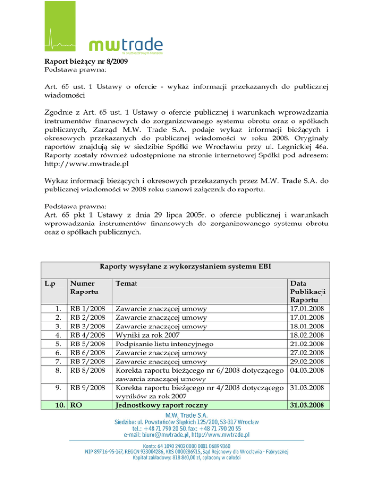 Raport bieŜący nr 8/2009 Podstawa prawna: Art. 65 ust. 1 Ustawy o ofercie - wykaz informacji przekazanych do publicznej wiadomości Zgodnie z Art. 65 ust. 1 Ustawy o ofercie publicznej i warunkach wprowadzania instrumentów finansowych do zorganizowanego systemu obrotu oraz o spółkach publicznych, Zarząd M.W. Trade S.A. podaje wykaz informacji bieŜących i okresowych przekazanych do publicznej wiadomości w roku 2008. Oryginały raportów znajdują się w siedzibie Spółki we Wrocławiu przy ul. Legnickiej 46a. Raporty zostały równieŜ udostępnione na stronie internetowej Spółki pod adresem: http://www.mwtrade.pl Wykaz informacji bieŜących i okresowych przekazanych przez M.W. Trade S.A. do publicznej wiadomości w 2008 roku stanowi załącznik do raportu. Podstawa prawna: Art. 65 pkt 1 Ustawy z dnia 29 lipca 2005r. o ofercie publicznej i warunkach wprowadzania instrumentów finansowych do zorganizowanego systemu obrotu oraz o spółkach publicznych. Raporty wysyłane z wykorzystaniem systemu EBI L.p Numer Raportu 1. 2. 3. 4. 5. 6. 7. 8. RB 1/2008 RB 2/2008 RB 3/2008 RB 4/2008 RB 5/2008 RB 6/2008 RB 7/2008 RB 8/2008 9. RB 9/2008 10. RO Temat Data Publikacji Raportu Zawarcie znaczącej umowy 17.01.2008 Zawarcie znaczącej umowy 17.01.2008 Zawarcie znaczącej umowy 18.01.2008 Wyniki za rok 2007 18.02.2008 Podpisanie listu intencyjnego 21.02.2008 Zawarcie znaczącej umowy 27.02.2008 Zawarcie znaczącej umowy 29.02.2008 Korekta raportu bieŜącego nr 6/2008 dotyczącego 04.03.2008 zawarcia znaczącej umowy Korekta raportu bieŜącego nr 4/2008 dotyczącego 31.03.2008 wyników za rok 2007 Jednostkowy raport roczny 31.03.2008 11. 12. 13. 14. 15. 16. 17. 18. 19. 20. 21. 22. 23. 24. 25. 26. 27. 28. 29. 30. 10/2008 RB 11/2008 RB 12/2008 RB 13/2008 RB 14/2008 RB 15/2008 RB 16/2008 RB 17/2008 RB 18/2008 RB 19/2008 RB 20/2008 RB 21/2008 RB 22/2008 RB 23/2008 RB 24/2008 RB 25/2008 RB 26/2008 RB 22/2008 RB 28/2008 RB 29/2008 RO Zwołanie Zwyczajnego Walnego Zgromadzenia 03.04.2008 Akcjonariuszy M.W. Trade S.A. Zawarcie znaczącej umowy 07.04.2008 Zawarcie znaczącej umowy 07.04.2008 Informacja o przychodach ze sprzedaŜy w I 14.04.2008 kwartale 2008 roku Zawarcie znaczącej umowy 21.04.2008 Zmiana w składzie Zarządu 28.04.2008 Projekty uchwał ZWZA M.W. Trade S.A. 29.04.2008 Zawarcie znaczącej umowy 08.05.2008 Treść uchwał podjętych na ZWZA M.W. Trade SA 12.05.2008 w dniu 9 maja 2008 roku Zawarcie znaczącej umowy 13.05.2008 Zawarcie znaczącej umowy 20.05.2008 Wykaz akcjonariuszy 21.05.2008 Zawarcie znaczącej umowy 02.06.2008 Zawarcie znaczącej umowy 03.06.2008 Zawarcie znaczącej umowy 05.06.2008 Zawarcie umowy o przeprowadzenie oferty 05.06.2008 publicznej Spółki z DI BRE Wykaz akcjonariuszy posiadających co najmniej 5 21.05.2008 % głosów na ZWZA Zawarcie znaczącej umowy 01.07.2008 Zawarcie znaczącej umowy 21.07.2008 Raport za I półrocze 30.07.2008 31. 32. 33. 34. 35. 36. 37. 38. 39. 40. 41. 42. 43. 44. 30/2008 RB 31/2008 RB 32/2008 RB 33/2008 RB 34/2008 RB 35/2008 RB 36/2008 RB 37/2008 RB 38/2008 RB 39/2008 RB 40/2008 RB 41/2008 RB 42/2008 RB 43/2008 RB 44/2008 Zawarcie znaczącej umowy 03.08.2008 Zwołanie Nadzwyczajnego Walnego 05.08.2008 Zgromadzenia Akcjonariuszy M.W. Trade S.A. Zawarcie znaczącej umowy 11.08.2008 Zawarcie znaczącej umowy 21.08.2008 Projekt uchwał WZA M.W. Trade S.A. w dniu 8. września 2008r. Wykaz akcjonariuszy posiadających co najmniej 5% głosów na WZA Treść uchwał podjętych na WZA M.W. Trade SA w dniu 8 września 2008 roku Rozwiązanie znaczących umów 02.09.2008 Zawarcie znaczącej umowy 19.09.2008 ZłoŜenie prospektu emisyjnego do KNF 30.09.2008 Zawarcie znaczącej umowy 06.10.2008 Powołanie nowego członka Zarządu 28.10.2008 Zawarcie znaczących umów 04.11.2008 Zawarcie znaczącej umowy 06.11.2008 09.09.2008 09.09.2008 15.09.2008 Raporty wysyłane z wykorzystaniem systemu ESPI L.p Numer Raportu Temat Data Publikacji 45. RB 27/2008 46. RB 36/2008 47. RB 45/2008 48. RB 46/2008 49. RB 47/2008 50. RB 48/2008 51. RB 49/2008 Raportu Nabycie akcji przez Członka Rady Nadzorczej 26.06.2008 M.W. Trade S.A. Wykaz akcjonariuszy posiadających co najmniej 09.09.2008 5% głosów na WZA Zatwierdzenie prospektu emisyjnego przez 09.12.2008 Komisję Nadzoru Finansowego Przestrzeganie Zasad Ładu Korporacyjnego 14.12.2008 Uchwała GPW SA w sprawie dopuszczenia i 18.12.2008 wprowadzenia do obrotu giełdowego na Głównym Rynku GPW akcji M.W.Trade SA Zawarcie znaczącej umowy 22.12.2008 Zmiany w składzie Zarządu M.W.Trade SA 23.12.2008