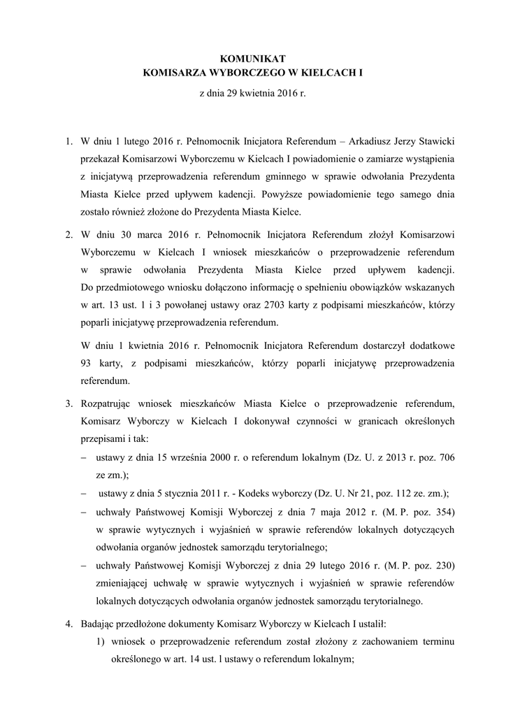 KOMUNIKAT KOMISARZA WYBORCZEGO W KIELCACH I z dnia 29 kwietnia 2016 r. 1. W dniu 1 lutego 2016 r. Pełnomocnik Inicjatora Referendum – Arkadiusz Jerzy Stawicki przekazał Komisarzowi Wyborczemu w Kielcach I powiadomienie o zamiarze wystąpienia z inicjatywą przeprowadzenia referendum gminnego w sprawie odwołania Prezydenta Miasta Kielce przed upływem kadencji. Powyższe powiadomienie tego samego dnia zostało również złożone do Prezydenta Miasta Kielce. 2. W dniu 30 marca 2016 r. Pełnomocnik Inicjatora Referendum złożył Komisarzowi Wyborczemu w Kielcach I wniosek mieszkańców o przeprowadzenie referendum w sprawie odwołania Prezydenta Miasta Kielce przed upływem kadencji. Do przedmiotowego wniosku dołączono informację o spełnieniu obowiązków wskazanych w art. 13 ust. 1 i 3 powołanej ustawy oraz 2703 karty z podpisami mieszkańców, którzy poparli inicjatywę przeprowadzenia referendum. W dniu 1 kwietnia 2016 r. Pełnomocnik Inicjatora Referendum dostarczył dodatkowe 93 karty, z podpisami mieszkańców, którzy poparli inicjatywę przeprowadzenia referendum. 3. Rozpatrując wniosek mieszkańców Miasta Kielce o przeprowadzenie referendum, Komisarz Wyborczy w Kielcach I dokonywał czynności w granicach określonych przepisami i tak: ustawy z dnia 15 września 2000 r. o referendum lokalnym (Dz. U. z 2013 r. poz. 706 ze zm.); ustawy z dnia 5 stycznia 2011 r. - Kodeks wyborczy (Dz. U. Nr 21, poz. 112 ze. zm.); uchwały Państwowej Komisji Wyborczej z dnia 7 maja 2012 r. (M. P. poz. 354) w sprawie wytycznych i wyjaśnień w sprawie referendów lokalnych dotyczących odwołania organów jednostek samorządu terytorialnego; uchwały Państwowej Komisji Wyborczej z dnia 29 lutego 2016 r. (M. P. poz. 230) zmieniającej uchwałę w sprawie wytycznych i wyjaśnień w sprawie referendów lokalnych dotyczących odwołania organów jednostek samorządu terytorialnego. 4. Badając przedłożone dokumenty Komisarz Wyborczy w Kielcach I ustalił: 1) wniosek o przeprowadzenie referendum został złożony z zachowaniem terminu określonego w art. 14 ust. l ustawy o referendum lokalnym; 2 2) z powiadomieniem, a następnie z wnioskiem o przeprowadzenie referendum wystąpiła 6 osobowa grupa obywateli, którym przysługuje prawo wybierania do organu stanowiącego danej jednostki samorządu terytorialnego tj. do Rady Miasta Kielce, co jest zgodne z art. 11 ust. l pkt l ustawy o referendum lokalnym, 3) w treści wniosku inicjator referendum wskazał, że informację o przedmiocie referendum wraz z uzasadnieniem podano do wiadomości mieszkańców Miasta Kielce, przez co wypełnił obowiązek wynikający z art. 13 ust. l i 3 ustawy o referendum lokalnym, 4) wniosek został prawidłowo podpisany. 5. Badając karty z podpisami mieszkańców Miasta Kielce popierających inicjatywę przeprowadzenia referendum, Komisarz Wyborczy w Kielcach I stwierdził, że zostały sporządzone zgodnie z wymogami określonymi w art. 14 ust. 2 i 4 ustawy o referendum lokalnym. Proces weryfikacji prawdziwości danych osobowych, umieszczonych na kartach z podpisami popierającymi wniosek o przeprowadzenie referendum polegał na porównaniu danych wyborcy udzielającego poparcia z danymi zawartymi w module PESEL aplikacji „Źródło” oraz w dostępnej na Platformie Wyborczej aplikacji Centralne Rozliczenie Informacji Dodatkowych. W wyniku przeprowadzonych czynności ustalono, co następuje: Liczba podpisów uznanych za prawidłowe wyniosła 16 005. ŁĄCZNA LICZBA PRZYPADKÓW DOTYCZĄCYCH ZAKWESTIONOWANIA PRAWIDŁOWOŚCI UDZIELONEGO POPARCIA w tym 6208 1. Wadliwie podane nazwisko lub imię 338 2. Wadliwie podany adres 41 3. Wadliwie podany nr PESEL 1859 4. Brak podpisu 22 5. Wadliwie podana data udzielenia poparcia 519 6. Brak prawa wybierania 2103 7. Kserokopia 287 8. Wielokrotne wystąpienie tego samego nr PESEL 937 9. Inne (nagłówek karty nie dotyczył referendum gminnego w sprawie odwołania Prezydenta Miasta Kielce) 102 3 Zgodnie z art. 24 powołanej ustawy Komisarz Wyborczy w Kielcach I zobowiązany jest wydać postanowienie w sprawie przeprowadzenia referendum lub o odrzuceniu wniosku mieszkańców o jego przeprowadzenie nie później niż w ciągu 30 dni od dnia złożenia wniosku. Termin ustawowy 30 dni na wydanie przez Komisarza Wyborczego w Kielcach I postanowienia w tej sprawie upływa 29 kwietnia 2016 r. 6. Liczba uprawnionych do głosowania mieszkańców Miasta Kielce objętych rejestrem wyborców na koniec kwartału poprzedzającego złożenie wniosku tj. na dzień 31 grudnia 2015 r. wynosiła 159 123 osób. Przedłożony Komisarzowi Wyborczemu w Kielcach I wniosek o przeprowadzenie referendum w sprawie odwołania Pana Wojciecha Lubawskiego Prezydenta Miasta Kielce przed upływem kadencji należy uznać za spełniający wymogi ustawy o referendum lokalnym, bowiem zgodnie z art. 4 pkt l tej uzyskał wymagane poparcie co najmniej l0% uprawnionych do głosowania mieszkańców Miasta Kielce tj. 15 913 osób. Komisarz Wyborczy w Kielcach I /-/ Bożena Fabrycy