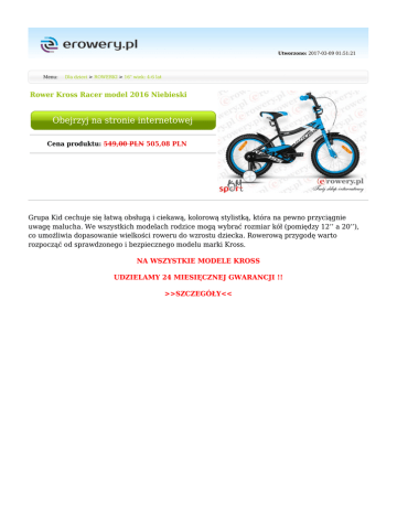 Utworzono: 2017-03-09 01:51:21 Menu: Dla dzieci > ROWERKI > 16" wiek: 4-6 lat Rower Kross Racer model 2016 Niebieski Obejrzyj na stronie internetowej Cena produktu: 549,00 PLN 505,08 PLN Grupa Kid cechuje się łatwą obsługą i ciekawą, kolorową stylistką, która na pewno przyciągnie uwagę malucha. We wszystkich modelach rodzice mogą wybrać rozmiar kół (pomiędzy 12’’ a 20’’), co umożliwia dopasowanie wielkości roweru do wzrostu dziecka. Rowerową przygodę warto rozpocząć od sprawdzonego i bezpiecznego modelu marki Kross. NA WSZYSTKIE MODELE KROSS UDZIELAMY 24 MIESIĘCZNEJ GWARANCJI !! >>SZCZEGÓŁY<< Klamki hamulców Hamulce Mechanizm korbowy Kierownica Plastik V-brake, Torpedo (hamulec w piaście) Stal 32Tx102mm Stal Mostek/ Wspornik kierownicy Stal Pedały Plastik Sztyca Stal Siodło PCV Przeznaczenie Dziecięcy Piasta przód Stal 28H Piasta tył Stal 28H Łańcuch 1/2"×1/8" Kaseta/ wolnobieg Obręcze Opony Typ roweru 16T Aluminium 28H 16x2,125 BMX Waga 9.8 Rozmiar kół 16" Sezon 2016 Rama Stal 16" Widelec/amortyzator Stal 16" Stery Stal Rozmiary ram - Oś korbowodu - Prowadzenie łańcucha - Szprychy - Wyposażenie dodatkowe - Tylny amortyzator /Damper Rodzina - Przerzutka przód - Przerzutka tył - Manetki - Kolor Producent Niebieski_#0000FF Kross Mimo dołożenia wszelkich starań nie gwarantujemy, że publikowane opisy i specyfikacje techniczne niezawierają uchybień lub błędów, które nie mogą jednak być podstawą do roszczeń. W przypadku jakichkolwiek wątpliwości, przed podjęciem decyzji prosimy o kontakt. Adres: www.erowery.pl Telefon: 605 515 185, 34 361 16 71 Email: [email protected]