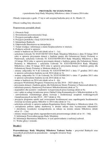 PROTOKÓŁ NR XXXIX/39/2014 z posiedzenia Sesji Rady Miejskiej Mikołowa z dnia 18 marca 2014 roku Obrady rozpoczęto o godz. 17-tej w sali sesyjnej budynku przy ul. K. Miarki 15. Obecni według listy obecności. Proponowany porządek obrad: 1. Otwarcie Sesji. 2. Stwierdzenie prawomocności Sesji. 3. Przyjęcie porządku obrad. 4. Przyjęcie protokołu z Sesji XXXVIII/2014. 5. Interpelacje Radnych. 6. Odpowiedzi Burmistrza na interpelacje. 7. Temat wiodący: informacja o stanie bezpieczeństwa w mieście. 8. Podjęcie uchwał w sprawie: - zmian w budżecie na 2014 rok (druki od nr 1 – 1e); - uchylenia Uchwały Nr XXXVIII/947/2014 Rady Miejskiej Mikołowa z dnia 18 lutego 2014 roku w sprawie przyznania dotacji z budżetu gminy dla Ochotniczej Straży Pożarnej w Paniowach, uchylenia Uchwały Nr XXXVIII/949/2014 Rady Miejskiej Mikołowa z dnia 18 lutego 2014 roku w sprawie przyznania dotacji z budżetu gminy dla Ochotniczej Straży Pożarnej w Mikołowie i uchylenia Uchwały Nr XXXVIII/950/2014 Rady Miejskiej Mikołowa z dnia 18 lutego 2014 roku w sprawie przyznania dotacji z budżetu gminy dla Ochotniczej Straży Pożarnej w Mokrem (druk nr 2); - zmiany załącznika Nr 9 do Uchwały Nr XXXVII/909/2013 z dnia 17 grudnia 2013 roku w sprawie uchwalenia budżetu na rok 2014 (druk nr 3); - zmiany załącznika Nr 13 do Uchwały Nr XXXVII/909/2013 z dnia 17 grudnia 2013 roku w sprawie uchwalenia budżetu na rok 2014 (druk nr 3a); - zmian w budżecie na 2014 rok (druki od nr 4 – 4j); - przyjęcia Wieloletniej Prognozy Finansowej na lata 2014 – 2025 (druk nr 5); - przyznania dotacji z budżetu gminy dla Ochotniczej Straży Pożarnej w Paniowach (druk 6); - udzielenia pomocy finansowej Powiatowi Mikołowskiemu (druk nr 7); - stypendiów dla uczniów i studentów wytypowanych przez komisję (druk nr 8); - cen i opłat za usługi świadczone przez Zakład Usług Komunalnych w Mikołowie(druk nr 9); - zatwierdzenia wieloletniego planu rozwoju i modernizacji urządzeń wodociągowych i kanalizacyjnych na lata 2014 – 2017 (druk nr 10); - przyjęcia programu opieki nad zwierzętami bezdomnymi oraz zapobiegania bezdomności zwierząt na terenie gminy Mikołów w 2014 roku (druk nr 11); - uchylenia uchwały w sprawie nadania Regulaminu Straży Miejskiej w Mikołowie (druk 12); - zarządzenia poboru opłaty skarbowej w drodze inkasa oraz wyznaczenia inkasentów i określenia wysokości wynagrodzenia za inkaso na terenie miasta Mikołowa (druki od nr 13 – 13a); - zmiany miejscowego planu zagospodarowania przestrzennego (druki od nr 14 – 14d). 9. Informacje Przewodniczącego Rady Miejskiej. 10. Informacje Burmistrza Mikołowa, w tym sprawozdanie z realizacji uchwał. 11. Wolne głosy i wnioski. Do pkt 1 Przewodniczący Rady Miejskiej Mikołowa Tadeusz Socha – przywitał Radnych oraz wszystkich przybyłych na posiedzenie – nastąpiło otwarcie Sesji. Do pkt 2 1 Przewodniczący Rady Tadeusz Socha – stwierdził prawomocność obrad. Do pkt 3 Przewodniczący Rady Tadeusz Socha – przedstawił powyższy porządek obrad. Burmistrz Mikołowa Marek Balcer - zaproponował zmiany w porządku obrad, które przedstawiła Skarbnik Barbara Gajda: wnieść do porządku obrad projekty uchwał: - w sprawie zmian w budżecie na 2014 rok na kwotę 300.000,- zł, jako zabezpieczenie środków na zadanie: poprawa jakości powietrza atmosferycznego wraz z rewitalizacją centrum miasta – projekt omówił Zastępca Burmistrza na Komisji ds. Budżetu – druk oznaczyć nr 4k; - w sprawie zmian w budżecie na 2014 rok na kwotę 4.000 zł, z przeznaczeniem na koszty sporządzania ekspertyz, w szczególności dotyczących dróg – druk oznaczyć nr 4l; - w sprawie udzielenia pomocy finansowej, w formie dotacji celowej, Powiatowi Mikołowskiemu jako współfinansowanie z Powiatem i gminami Powiatu Mikołowskiego wspólnego projektu „SilesiaNet – budowa społeczeństwa informacyjnego...” – druki oznaczyć: na kwotę 24 tys. nr 7a, na kwotę 4 tys. nr 7b, na kwotę 65.258,- nr 7c; - w sprawie zmiany miejscowego planu zagospodarowania przestrzennego dla terenu przy ul. Buczka - druk oznaczyć nr 14e; - w sprawie zmiany miejscowego planu zagospodarowania przestrzennego dla terenu przy ul. Mokierska – Zagrodowa - druk oznaczyć nr 14f; - w sprawie zmiany miejscowego planu zagospodarowania przestrzennego dla terenu przy ul. Zamkowej - druk oznaczyć nr 14g; - w sprawie zmiany miejscowego planu zagospodarowania przestrzennego dla terenu przy ul. Rusinów - druk oznaczyć nr 14h; - w sprawie zmiany miejscowego planu zagospodarowania przestrzennego dla terenu przy ul. Ks. Górka/Starych Młynów - druk oznaczyć nr 14i; - w sprawie wniosku o utworzenie Rodzinnego Ogrodu Działkowego - druk oznaczyć nr 15; - w sprawie dokonania zmian w Uchwale Nr X/176/2011 Rady Miejskiej Mikołowa z dnia 30 sierpnia 2011 roku w sprawie zatwierdzenia Regulaminu dostarczania wody i odprowadzania ścieków na terenie Gminy Mikołów - druk oznaczyć nr 16; - w sprawie utworzenia obwodów głosowania w szpitalach i Ośrodku dla Niepełnosprawnych w Mikołowie – Borowej Wsi - druk oznaczyć nr 17; - w sprawie zmiany uchwały Nr XXIII/526/2012 w sprawie podziału Miasta Mikołowa na stałe obwody głosowania - druk oznaczyć nr 18. Powyższe propozycje zostały przyjęte przez aklamację. Wyznaczono sekretarzy: Radną Katarzynę Syryjczyk – Słomską, która wyraziła zgodę, Radnego Krzysztofa Żura, który wyraził zgodę. Powyżsi sekretarze zostali przyjęci przez aklamację. Nastąpiło głosowanie nad przyjęciem porządku obrad z naniesionymi zmianami. Za przyjęciem głosowało 17 Radnych, sprzeciwu nie było, wstrzymało się 3 Radnych. Porządek obrad został przyjęty większością głosów. Do pkt 4 2 Przewodniczący Rady Tadeusz Socha – przedstawił protokół z poprzedniego posiedzenia. Do przedstawionego protokołu nie wniesiono żadnych uwag, ani zmian. Nastąpiło głosowanie nad przyjęciem ww protokołu. Za prz