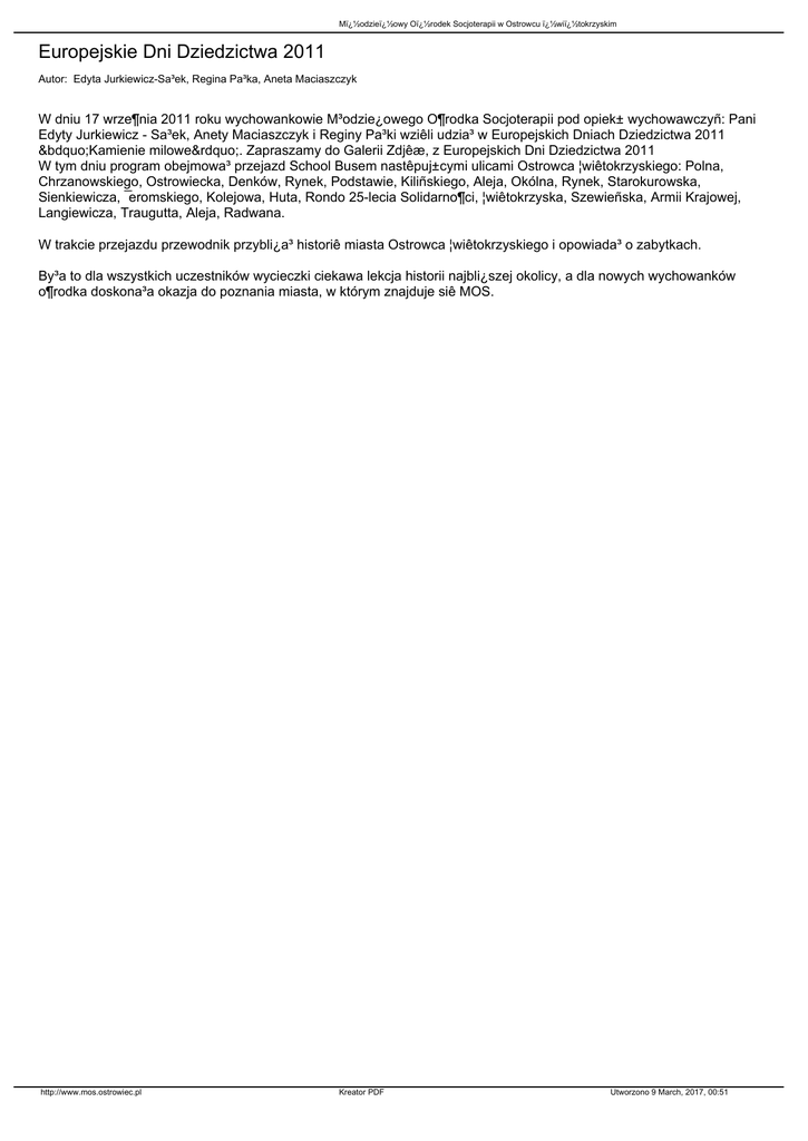 M�odzie�owy O�rodek Socjoterapii w Ostrowcu �wi�tokrzyskim Europejskie Dni Dziedzictwa 2011 Autor: Edyta Jurkiewicz-Sa³ek, Regina Pa³ka, Aneta Maciaszczyk W dniu 17 wrze¶nia 2011 roku wychowankowie M³odzie¿owego O¶rodka Socjoterapii pod opiek± wychowawczyñ: Pani Edyty Jurkiewicz - Sa³ek, Anety Maciaszczyk i Reginy Pa³ki wziêli udzia³ w Europejskich Dniach Dziedzictwa 2011 „Kamienie milowe”. Zapraszamy do Galerii Zdjêæ, z Europejskich Dni Dziedzictwa 2011 W tym dniu program obejmowa³ przejazd School Busem nastêpuj±cymi ulicami Ostrowca ¦wiêtokrzyskiego: Polna, Chrzanowskiego, Ostrowiecka, Denków, Rynek, Podstawie, Kiliñskiego, Aleja, Okólna, Rynek, Starokurowska, Sienkiewicza, ¯eromskiego, Kolejowa, Huta, Rondo 25-lecia Solidarno¶ci, ¦wiêtokrzyska, Szewieñska, Armii Krajowej, Langiewicza, Traugutta, Aleja, Radwana. W trakcie przejazdu przewodnik przybli¿a³ historiê miasta Ostrowca ¦wiêtokrzyskiego i opowiada³ o zabytkach. By³a to dla wszystkich uczestników wycieczki ciekawa lekcja historii najbli¿szej okolicy, a dla nowych wychowanków o¶rodka doskona³a okazja do poznania miasta, w którym znajduje siê MOS. http://www.mos.ostrowiec.pl Kreator PDF Utworzono 9 March, 2017, 00:51
