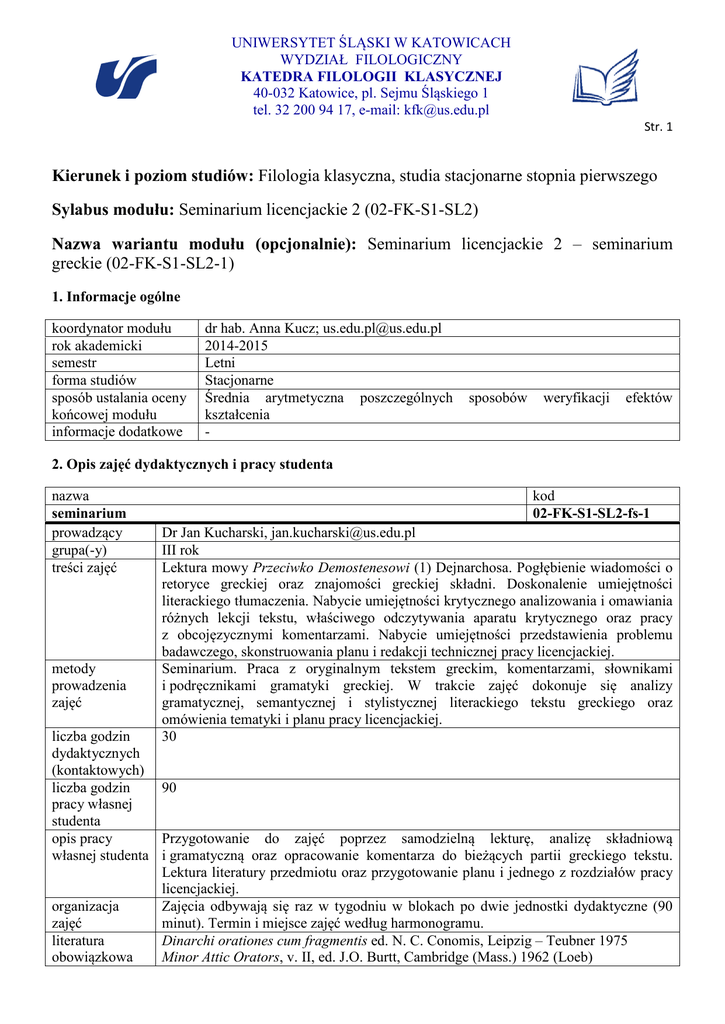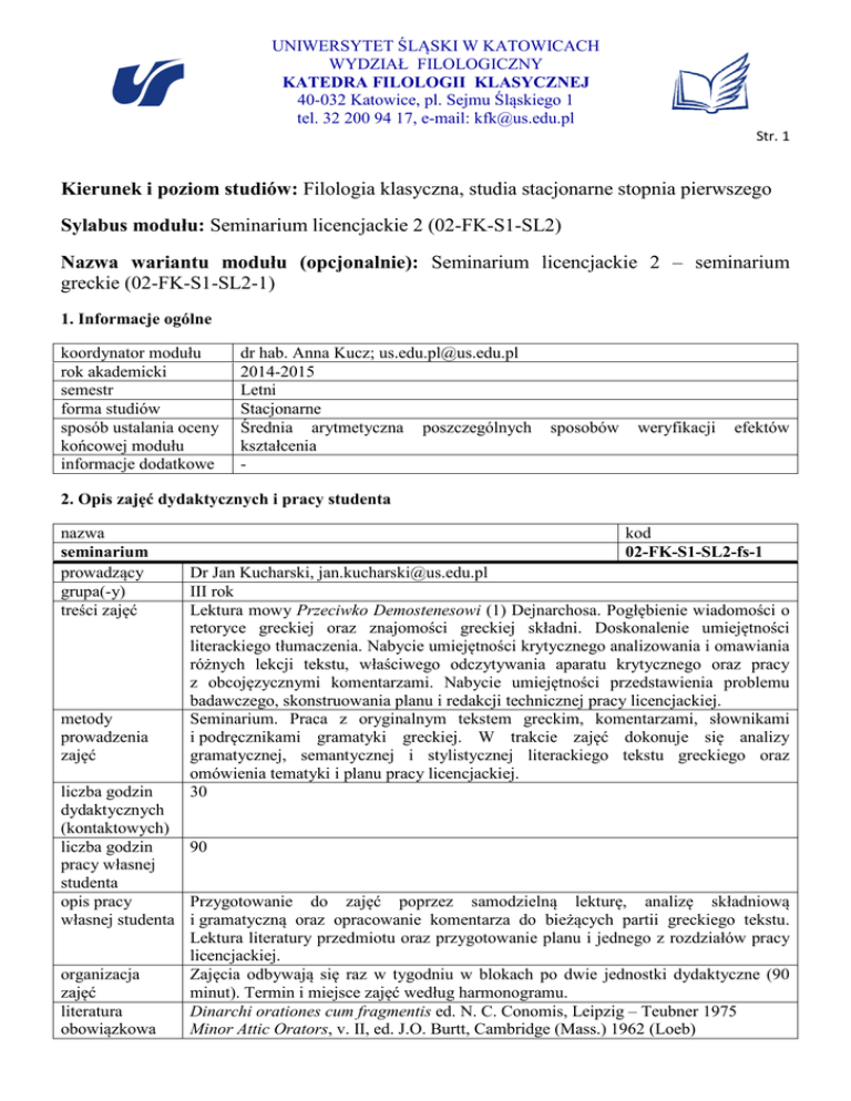 UNIWERSYTET ŚLĄSKI W KATOWICACH WYDZIAŁ FILOLOGICZNY KATEDRA FILOLOGII KLASYCZNEJ 40-032 Katowice, pl. Sejmu Śląskiego 1 tel. 32 200 94 17, e-mail: [email protected] Str. 1 Kierunek i poziom studiów: Filologia klasyczna, studia stacjonarne stopnia pierwszego Sylabus modułu: Seminarium licencjackie 2 (02-FK-S1-SL2) Nazwa wariantu modułu (opcjonalnie): Seminarium licencjackie 2 – seminarium greckie (02-FK-S1-SL2-1) 1. Informacje ogólne koordynator modułu rok akademicki semestr forma studiów sposób ustalania oceny końcowej modułu informacje dodatkowe dr hab. Anna Kucz; [email protected] 2014-2015 Letni Stacjonarne Średnia arytmetyczna poszczególnych kształcenia - sposobów weryfikacji efektów 2. Opis zajęć dydaktycznych i pracy studenta nazwa seminarium prowadzący grupa(-y) treści zajęć metody prowadzenia zajęć kod 02-FK-S1-SL2-fs-1 Dr Jan Kucharski, [email protected] III rok Lektura mowy Przeciwko Demostenesowi (1) Dejnarchosa. Pogłębienie wiadomości o retoryce greckiej oraz znajomości greckiej składni. Doskonalenie umiejętności literackiego tłumaczenia. Nabycie umiejętności krytycznego analizowania i omawiania różnych lekcji tekstu, właściwego odczytywania aparatu krytycznego oraz pracy z obcojęzycznymi komentarzami. Nabycie umiejętności przedstawienia problemu badawczego, skonstruowania planu i redakcji technicznej pracy licencjackiej. Seminarium. Praca z oryginalnym tekstem greckim, komentarzami, słownikami i podręcznikami gramatyki greckiej. W trakcie zajęć dokonuje się analizy gramatycznej, semantycznej i stylistycznej literackiego tekstu greckiego oraz omówienia tematyki i planu pracy licencjackiej. 30 liczba godzin dydaktycznych (kontaktowych) liczba godzin 90 pracy własnej studenta opis pracy Przygotowanie do zajęć poprzez samodzielną lekturę, analizę składniową własnej studenta i gramatyczną oraz opracowanie komentarza do bieżących partii greckiego tekstu. Lektura literatury przedmiotu oraz przygotowanie planu i jednego z rozdziałów pracy licencjackiej. organizacja Zajęcia odbywają się raz w tygodniu w blokach po dwie jednostki dydaktyczne (90 zajęć minut). Termin i miejsce zajęć według harmonogramu. literatura Dinarchi orationes cum fragmentis ed. N. C. Conomis, Leipzig – Teubner 1975 obowiązkowa Minor Attic Orators, v. II, ed. J.O. Burtt, Cambridge (Mass.) 1962 (Loeb) UNIWERSYTET ŚLĄSKI W KATOWICACH WYDZIAŁ FILOLOGICZNY KATEDRA FILOLOGII KLASYCZNEJ 40-032 Katowice, pl. Sejmu Śląskiego 1 tel. 32 200 94 17, e-mail: [email protected] Str. 2 literatura uzupełniająca adres strony www zajęć informacje dodatkowe Dinarque. Discours. Ed. M. Nouhaud, L. Dors-Méary. Paris 1990 (Budé) I. Worthington, Greek Orators II. Dinarchus, Hyperides. With Introduction, Translation and Commentary. Warminster 1999 I. Worthington, A Historical Commentary on Dinarchus. Rhetoric and Conspiracy in Later Fourth-Century Athens. Ann Arbor 1992 M.H. Hansen, Demokracja ateńska w czasach Demostenesa. Struktura, zasady, ideologia (tł. R. Kulesza), Warszawa 1999 R. Kulesza, Zjawisko korupcji w Atenach V-IV wieku p.n.e. Warszawa 1994 E. Badian, “Harpalus”, JHS 81 (1961) - 3. Opis sposobów weryfikacji efektów kształcenia modułu nazwa kod Śródsemestralne testy pisemne i sprawdzian ustny 02-FK-S1-SL2-w-1 kod(-y) zajęć 02-FK-S1-SL2-fs-1 osoba(-y) Dr Jan Kucharski, [email protected] przeprowadzająca (-e) weryfikację grupa(-y) III rok wymagania Opanowanie materiału i umiejętności wskazanych w treściach zajęć. merytoryczne kryteria oceny Ćwiczenia kończą się zaliczeniem z oceną. Ocena końcowa jest średnią ważoną ocen bieżącego przygotowania do zajęć (waga 2), końcowego sprawdzianu ustnego (waga 2) oraz postępu pisania pracy licencjackiej (waga 4). przebieg procesu Bieżącej ocenie podlegają: aktywna obecność na zajęciach, opanowanie weryfikacji dotychczasowego materiału oraz przygotowanie do zajęć. Końcowy sprawdzian ustny ocenia umiejętność tłumaczenia oraz analizy gramatycznej samodzielnie przygotowanej lektury. Ponadto ocenie podlega koncepcja, plan i redakcja techniczna jednego rozdziału pracy licencjackiej. informacje dodatkowe