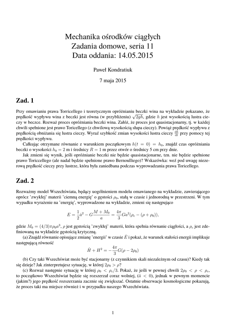 Mechanika ośrodków ciągłych Zadania domowe, seria 11 Data