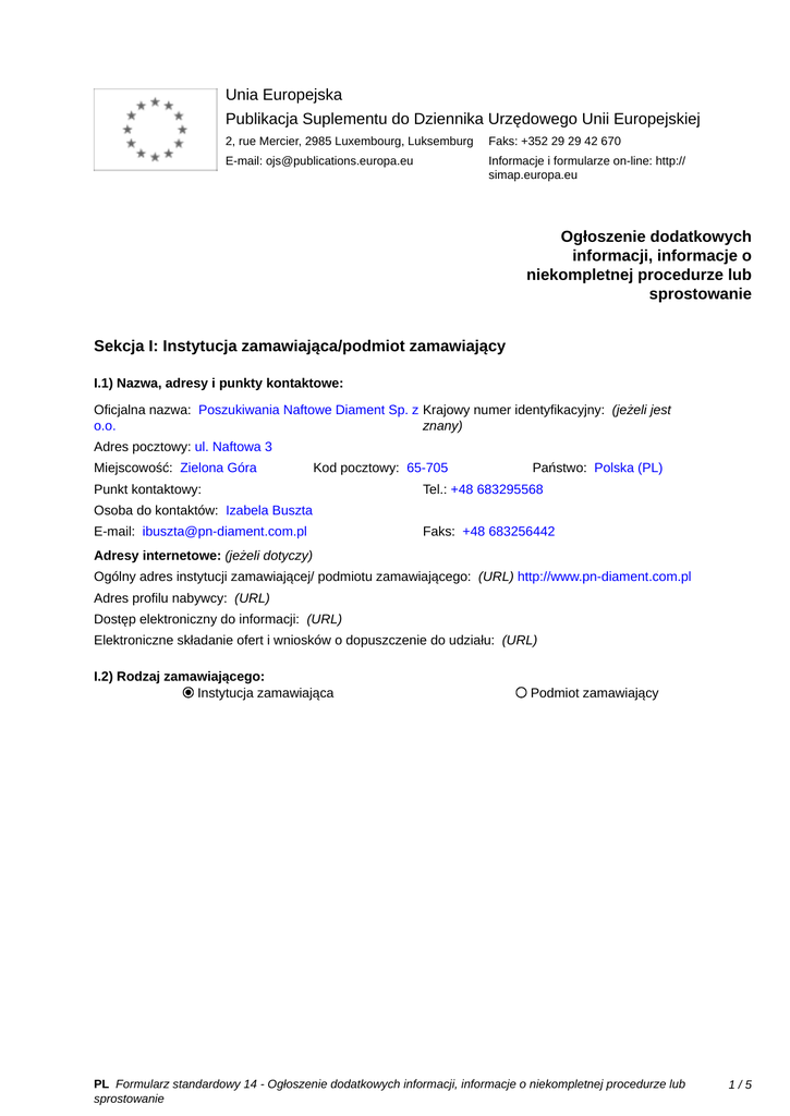 Unia Europejska Publikacja Suplementu do Dziennika Urzędowego Unii Europejskiej 2, rue Mercier, 2985 Luxembourg, Luksemburg Faks: +352 29 29 42 670 E-mail: [email protected] Informacje i formularze on-line: http:// simap.europa.eu Ogłoszenie dodatkowych informacji, informacje o niekompletnej procedurze lub sprostowanie Sekcja I: Instytucja zamawiająca/podmiot zamawiający I.1) Nazwa, adresy i punkty kontaktowe: Oficjalna nazwa: Poszukiwania Naftowe Diament Sp. z Krajowy numer identyfikacyjny: (jeżeli jest o.o. znany) _____ Adres pocztowy: ul. Naftowa 3 Miejscowość: Zielona Góra Kod pocztowy: 65-705 Punkt kontaktowy: _____ Państwo: Polska (PL) Tel.: +48 683295568 Osoba do kontaktów: Izabela Buszta E-mail: [email protected] Faks: +48 683256442 Adresy internetowe: (jeżeli dotyczy) Ogólny adres instytucji zamawiającej/ podmiotu zamawiającego: (URL) http://www.pn-diament.com.pl Adres profilu nabywcy: (URL) _____ Dostęp elektroniczny do informacji: (URL) _____ Elektroniczne składanie ofert i wniosków o dopuszczenie do udziału: (URL) _____ I.2) Rodzaj zamawiającego: Instytucja zamawiająca Podmiot zamawiający PL Formularz standardowy 14 - Ogłoszenie dodatkowych informacji, informacje o niekompletnej procedurze lub sprostowanie 1/5 Sekcja II: Przedmiot zamówienia II.1.1) Nazwa nadana zamówieniu: "Zakup Suszarki Fluidalnej do suszenia gęstwy solnej” do projektu pod nazwą ‘’Wdrożenie mobilnego systemu wyparnego oraz rozbudowa laboratorium" II.1.2) Krótki opis zamówienia lub zakupu: (podano w pierwotnym ogłoszeniu) Przez suszarkę do suszenia gęstwy solnej zamawiający rozumie urządzenie przeznaczone do suszenia otrzymanej w procesie wyparnym gęstwy kryształów solnych oraz jej zrzut do opakowania typu BIG BAG lub worki. Szczegółowe wymogi dotyczące przedmiotowego zamówienia określone zostały w załączniku nr 1 do SIWZ Specyfikacja Techniczna II.1.3) Wspólny Słownik Zamówień (CPV) Główny przedmiot Słownik główny 34951300 Słownik uzupełniający (jeżeli dotyczy) PL Formularz standardowy 14 - Ogłoszenie dodatkowych informacji, informacje o niekompletnej procedurze lub sprostowanie 2/5 Sekcja IV: Procedura IV.1)Rodzaj procedury (podano w pierwotnym ogłoszeniu) Otwarta Ograniczona Ograniczona przyspieszona Negocjacyjna Negocjacyjna przyspieszona Dialog konkurencyjny Negocjacyjna z uprzednim ogłoszeniem Negocjacyjna bez uprzedniego ogłoszenia Negocjacyjna z publikacją ogłoszenia o zamówieniu Negocjacyjna bez publikacji ogłoszenia o zamówieniu Udzielenie zamówienia bez uprzedniej publikacji ogłoszenia o zamówieniu w Dzienniku Urzędowym Unii Europejskiej IV.2)Informacje administracyjne IV.2.1)Numer referencyjny: (podano w pierwotnym ogłoszeniu) SIWZ/12/EHZ/0002 IV.2.2)Dane referencyjne ogłoszenia w przypadku ogłoszeń przesłanych drogą elektroniczną: Pierwotne ogłoszenie przesłane przez eNotices TED eSender Login: ENOTICES_PNDiament Dane referencyjne ogłoszenia: 2013-015998 rok i numer dokumentu IV.2.3)Ogłoszenie, którego dotyczy niniejsza publikacja: Numer ogłoszenia w Dz.U.: 2013/S 024-037231 z dnia: 02/02/2013 (dd/mm/rrrr) IV.2.4)Data wysłania pierwotnego ogłoszenia: 31/01/2013 (dd/mm/rrrr) PL Formularz standardowy 14 - Ogłoszenie dodatkowych informacji, informacje o niekompletnej procedurze lub sprostowanie 3/5 Sekcja VI: Informacje uzupełniające VI.1) Ogłoszenie dotyczy: Procedury niepełnej Sprostowania Informacji dodatkowych VI.2) Informacje na temat niepełnej procedury udzielenia zamówienia: Postępowanie o udzielenie zamówienia zostało przerwane Postępowanie o udzielenie zamówienia uznano za nieskuteczne Zamówienia nie udzielono Zamówienie może być przedmiotem ponownej publikacji VI.3) Informacje do poprawienia lub dodania : VI.3.1) Zmiana oryginalnej informacji podanej przez instytucję zamawiającą Publikacja w witrynie TED niezgodna z oryginalną informacją, przekazaną przez instytucję zamawiającą Oba przypadki VI.3.2) W ogłoszeniu pierwotnym W odpowiedniej dokumentacji przetargowej (więcej informacji w odpowiedniej dokumentacji przetargowej) W obu przypadkach (więcej informacji w odpowiedniej dokumentacji przetargowej) VI.3.3) Tekst, który należy poprawić w pierwotnym ogłoszeniu Miejsce, w którym znajduje się Zamiast: Powinno być: zmieniany tekst: Wykonawca ma posiadać wiedzę i Wykonawca ma posiadać wiedzę i III.2.3) Kwalifikacje techniczne doświadczenie w doświadczenie w realizacji w okresie ostatnich pięciu realizacji w okresie ostatnich lat przed upływem dziesięciu lat przed upływem terminu składania ofert, a jeżeli okres terminu składania ofert, a jeżeli okres prowadzenia prowadzenia działalności jest krótszy – w tym działalności jest krótszy – w tym okresie, co najmniej okresie, co najmniej jednej dostawy „suszarki fluidalnej” jednej dostawy „suszarki fluidalnej” na kwotę nie niższą na kwotę nie niższą niż 300.000,00 złotych netto niż 300.000,00 złotych netto (słownie: trzysta tysięcy (słownie: trzysta tysięcy złotych) z podaniem jej wartości, złotych) z podaniem jej wartości, przedmiotu, dat przedmiotu, dat wykonania i odbiorców z wykonania i odbiorców z załączeniem dokumentów załączeniem dokumentów potwierdzających, że dostawa ta potwierdzających, że dostawa ta została wykonana została wykonana należycie.Dokumenty na należycie.Dokumenty na potwierdzenie spełnienia potwierdzenie spełnienia warunków udziału w postępowaniu warunków udziału w postępowaniu zawarte są w zawarte są w PL Formularz standardowy 14 - Ogłoszenie dodatkowych informacji, informacje o niekompletnej procedurze lub sprostowanie 4/5 Rozdziale 11 SIWZ, tj. wykaz wykonanych dostaw oraz dokumenty potwierdzające że dostawy zostały wykonane należycie VI.3.4) Daty, które należy poprawić w pierwotnym ogłoszeniu Miejsce, w którym znajdują się Zamiast: zmieniane daty: Rozdziale 11 SIWZ, tj. wykaz wykonanych dostaw oraz dokumenty po