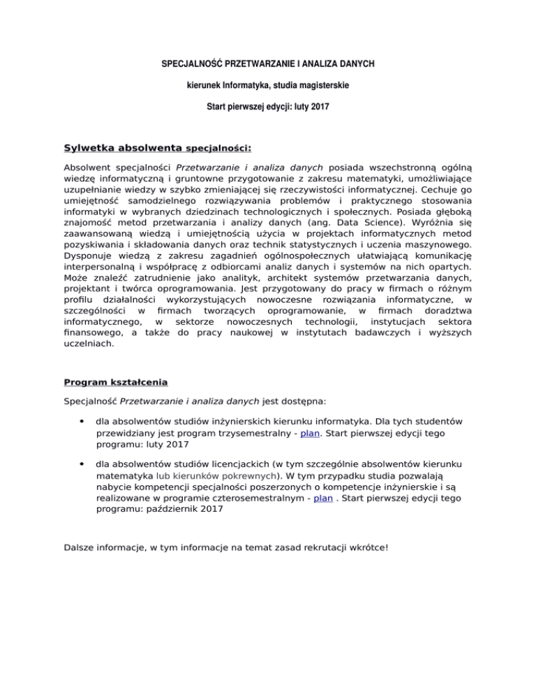 SPECJALNOŚĆ PRZETWARZANIE I ANALIZA DANYCH kierunek Informatyka, studia magisterskie Start pierwszej edycji: luty 2017 Sylwetka absolwenta specjalności: Absolwent specjalności Przetwarzanie i analiza danych posiada wszechstronną ogólną wiedzę informatyczną i gruntowne przygotowanie z zakresu matematyki, umożliwiające uzupełnianie wiedzy w szybko zmieniającej się rzeczywistości informatycznej. Cechuje go umiejętność samodzielnego rozwiązywania problemów i praktycznego stosowania informatyki w wybranych dziedzinach technologicznych i społecznych. Posiada głęboką znajomość metod przetwarzania i analizy danych (ang. Data Science). Wyróżnia się zaawansowaną wiedzą i umiejętnością użycia w projektach informatycznych metod pozyskiwania i składowania danych oraz technik statystycznych i uczenia maszynowego. Dysponuje wiedzą z zakresu zagadnień ogólnospołecznych ułatwiającą komunikację interpersonalną i współpracę z odbiorcami analiz danych i systemów na nich opartych. Może znaleźć zatrudnienie jako analityk, architekt systemów przetwarzania danych, projektant i twórca oprogramowania. Jest przygotowany do pracy w firmach o różnym profilu działalności wykorzystujących nowoczesne rozwiązania informatyczne, w szczególności w firmach tworzących oprogramowanie, w firmach doradztwa informatycznego, w sektorze nowoczesnych technologii, instytucjach sektora finansowego, a także do pracy naukowej w instytutach badawczych i wyższych uczelniach. Program kształcenia Specjalność Przetwarzanie i analiza danych jest dostępna: dla absolwentów studiów inżynierskich kierunku informatyka. Dla tych studentów przewidziany jest program trzysemestralny - plan. Start pierwszej edycji tego programu: luty 2017 dla absolwentów studiów licencjackich (w tym szczególnie absolwentów kierunku matematyka lub kierunków pokrewnych). W tym przypadku studia pozwalają nabycie kompetencji specjalności poszerzonych o kompetencje inżynierskie i są realizowane w programie czterosemestralnym - plan . Start pierwszej edycji tego programu: październik 2017 Dalsze informacje, w tym informacje na temat zasad rekrutacji wkrótce!