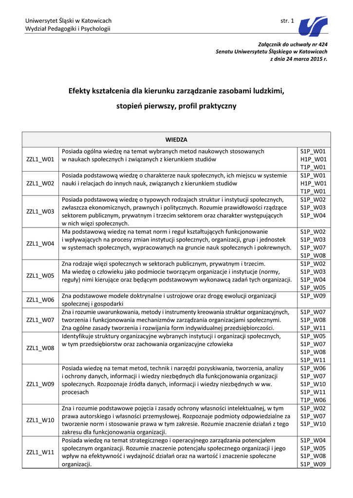 Uniwersytet Śląski w Katowicach Wydział Pedagogiki i Psychologii str. 1 Załącznik do uchwały nr 424 Senatu Uniwersytetu Śląskiego w Katowicach z dnia 24 marca 2015 r. Efekty kształcenia dla kierunku zarządzanie zasobami ludzkimi, stopień pierwszy, profil praktyczny WIEDZA ZZL1_W01 Posiada ogólna wiedzę na temat wybranych metod naukowych stosowanych w naukach społecznych i związanych z kierunkiem studiów ZZL1_W02 Posiada podstawową wiedzę o charakterze nauk społecznych, ich miejscu w systemie nauki i relacjach do innych nauk, związanych z kierunkiem studiów ZZL1_W03 ZZL1_W04 ZZL1_W05 ZZL1_W06 ZZL1_W07 ZZL1_W08 ZZL1_W09 ZZL1_W10 ZZL1_W11 Posiada podstawową wiedzę o typowych rodzajach struktur i instytucji społecznych, zwłaszcza ekonomicznych, prawnych i politycznych. Rozumie prawidłowości rządzące sektorem publicznym, prywatnym i trzecim sektorem oraz charakter występujących w nich więzi społecznych. Ma podstawową wiedzę na temat norm i reguł kształtujących funkcjonowanie i wpływających na procesy zmian instytucji społecznych, organizacji, grup i jednostek w systemach społecznych, wypracowanych na gruncie nauk społecznych i pokrewnych. Zna rodzaje więzi społecznych w sektorach publicznym, prywatnym i trzecim. Ma wiedzę o człowieku jako podmiocie tworzącym organizacje i instytucje (normy, reguły) nimi kierujące oraz będącym podstawowym wykonawcą zadań tych organizacji. Zna podstawowe modele doktrynalne i ustrojowe oraz drogę ewolucji organizacji społecznej i gospodarki Zna i rozumie uwarunkowania, metody i instrumenty kreowania struktur organizacyjnych, tworzenia i funkcjonowania mechanizmów zarządzania organizacjami społecznymi. Zna ogólne zasady tworzenia i rozwijania form indywidualnej przedsiębiorczości. Identyfikuje struktury organizacyjne wybranych instytucji i organizacji społecznych, w tym przedsiębiorstw oraz zachowania organizacyjne człowieka Posiada wiedzę na temat metod, technik i narzędzi pozyskiwania, tworzenia, analizy i ochrony danych, informacji i wiedzy niezbędnych dla funkcjonowania organizacji społecznych. Rozpoznaje źródła danych, informacji i wiedzy niezbędnych w ww. procesach Zna i rozumie podstawowe pojęcia i zasady ochrony własności intelektualnej, w tym prawa autorskiego i własności przemysłowej. Rozpoznaje podmioty odpowiedzialne za tworzenie norm i stosowanie prawa w tym zakresie. Rozumie znaczenie działań z tego zakresu dla funkcjonowania organizacji. Posiada wiedzę na temat strategicznego i operacyjnego zarządzania potencjałem społecznym organizacji. Rozumie znaczenie potencjału społecznego organizacji i jego wpływ na efektywność i wydajność działań oraz na wartość i znaczenie społeczne organizacji. S1P_W01 H1P_W01 T1P_W01 S1P_W01 H1P_W01 T1P_W01 S1P_W02 S1P_W03 S1P_W04 S1P_W02 S1P_W03 S1P_W07 S1P_W08 S1P_W02 S1P_W03 S1P_W04 S1P_W05 S1P_W09 S1P_W07 S1P_W08 S1P_W11 S1P_W05 S1P_W07 S1P_W08 S1P_W11 S1P_W06 S1P_W07 S1P_W10 S1P_W11 T1P_W06 S1P_W02 S1P_W07 S1P_W10 S1P_W04 S1P_W05 S1P_W08 S1P_W09 Uniwersytet Śląski w Katowicach Wydział Pedagogiki i Psychologii str. 2 Załącznik do uchwały nr 424 Senatu Uniwersytetu Śląskiego w Katowicach z dnia 24 marca 2015 r. ZZL1_W12 ZZL1_W13 Ma wiedzę na temat procesów planowania, kształtowania, rozwoju i optymalizacji wykorzystania zasobów ludzkich w organizacjach trzech sektorów. Zna i rozumie zagadnienia z zakresu: doboru kadr (rekrutacji i selekcji), motywowania, rozwijania kompetencji, budowania karier indywidualnych w powiązaniu ze ścieżką rozwoju organizacji, kontroli i oceny pracowniczej, procesów adaptacyjnych pracowników w organizacji oraz zarządzania optymalnym poziomem zatrudnienia i zarządzania zmianą. Posiada ogólną wiedzę na temat wybranych metod naukowych oraz zna zagadnienia charakterystyczne dla dyscypliny nauki niezwiązanej z kierunkiem studiów S1P_W04 S1P_W05 S1P_W07 S1P_W08 S1P_W09 S1P_W11 UMIEJĘTNOŚCI ZZL1_U01 ZZL1_U02 ZZL1_U03 ZZL1_U04 ZZL1_U05 ZZL1_U06 ZZL1_U07 ZZL1_U08 ZZL1_U09 Posiada umiejętność formułowania, analizowania i rozwiązywania problemów związanych z funkcjonowaniem organizacji oraz jednostek i grup w ramach organizacji na podstawie przyswojonej wiedzy teoretycznej z zakresu nauk związanych z kierunkiem studiów Potrafi realizować zadania procesu kadrowego oraz zarządzania optymalnym poziomem zatrudnienia i zarządzania zmianą. Potrafi aktywnie zarządzać ścieżką rozwoju zawodowego i kariery osób funkcjonujących wewnątrz organizacji zgodnie z jej celami oraz prowadzić doradztwo personalne w zakresie budowania indywidualnych ścieżek rozwoju zawodowego jednostek w cyklu życia. Posiada umiejętności samodzielnego poruszania się w strukturach oraz kreowania procesów innowacyjnych w organizacjach społecznych, wykorzystując wiedzę zdobytą podczas studiowania oraz praktyk zawodowych. Posiada umiejętność aplikacji na stanowiska pracy w organizacjach trzech sektorów. Potrafi opisać i analizować przyczyny, przebieg i skutki wybranych procesów i zjawisk społecznych. Umie identyfikować, pozyskiwać i analizować dane, informacje i wiedzę niezbędną do zrozumienia zjawisk zachodzących w organizacjach społecznych. Potrafi analizować podstawowe związki przyczynowo-skutkowe o charakterze prawnym, ekonomicznym, psychologicznym, socjologicznym i technicznym typowe dla organizacji społecznych. Potrafi poruszać się w otoczeniu politycznym, prawnym, gospodarczym i społecznym, wykorzystywać instytucje i szeroko rozumianą ofertę podmiotów je tworzących na rzecz prowadzonej działalności publicznej, gospodarczej i społecznej oraz na potrzeby indywidualne. Potrafi myśleć i działać w sposób przedsiębiorczy. Wykorzystuje instrumenty oraz procedury aplikacyjne dotyczące ochrony własności intelektualnej dla prawidłowego funkcjonowania organizacji oraz na potrzeby własnego rozwoju zawodowego i osobistego. Posiada umiejętności lingwist