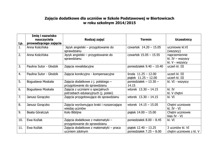 Zajęcia dodatkowe dla uczniów w Szkole Podstawowej w Biertowicach w roku szkolnym 2014/2015 Lp. 1. Imię i nazwisko nauczyciela prowadzącego zajęcia Anna Kościńska 2. Anna Kościńska 3. Rodzaj zajęć Termin Język angielski – przygotowanie do sprawdzianu Język angielski – przygotowanie do sprawdzianu czwartek 14.20 – 15.05 Paulina Sutor - Głodzik Zajęcia rewalidacyjne poniedziałek 9.40 – 10.40 4. Paulina Sutor - Głodzik Zajęcia korekcyjno - kompensacyjne 5. Bogusława Moskała 6. Bogusława Moskała 7. Janusz Gorączko Zajęcia dodatkowe z j. polskiego – przygotowanie do sprawdzianu Zajęcia z uczniami o specjalnych potrzebach edukacyjnych (j. polski) Zajęcia przygotowujące do sprawdzianu środa 11.25 – 12.00 piątek 11.25 – 12.00 poniedziałek – 13.30 – 14.15 wtorek 13.30 – 14.15 8. Janusz Gorączko 9. Beata Góralczyk 10. Ewa Koźlak 11. Ewa Koźlak czwartek 15.05 – 15.55 wtorek 13.30 – 14.15 Uczestnicy uczniowie kl.VI (wszyscy) naprzemiennie kl. IV – wszyscy kl. V - wszyscy uczeń kl. III uczeń kl. III uczeń kl. III kl. VI - wszyscy kl. IV kl. V chętni kl. VI Zajęcia wyrównujące braki i rozszerzające wiedzę uczniów Koło Biblijne wtorek 14.15 – 15.05 Zajęcia dodatkowe z matematyki – przygotowanie do sprawdzianu Zajęcia dodatkowe z matematyki – praca uczniem zdolnym poniedziałek 8.00 – 8.45 Chętni uczniowie kl. IV - VI Chętni uczniowie klas IV - VI kl. VI piątek 12.40 – 13.25 poniedziałek 7.25 – 8.00 3 uczniów kl. VI chętni uczniowie z kl. V piątek 14.00 – 15.00 12. Ewa Koźlak Zajęcia dodatkowe z matematyki środa 12.40 – 13.25 13. Ewa Koźlak piątek 7.25 – 8.00 14. Anna Burda 15. Anna Burda 16. Małgorzata Bochenek Zajęcia dodatkowe z matematyki – dla uczniów mających trudności w nauce Zajęcia dodatkowe dla uczniów mających trudności w nauce z matematyki i j. polskiego Zajęcia dodatkowe z matematyki i j. polskiego – praca z uczniem zdolnym Zajęcia logopedyczne 17. Małgorzata Bochenek Diagnoza uczniów klasy I 18. Artur Konieczkowicz Zajęcia sportowo - rekreacyjne wrzesień – październik wtorek 12.25 – 13.25 sobota 10.30 – 12.00 Wszyscy uczniowie kl. IV uczniowie kl. VI środa 11.25 – 12.20 uczniowie kl. III (9 osób) piątek 11.25 – 12.20 uczniowie. kl. III (10 osób) cała klasa I wtorek 12.25 – 12.55 uczniowie kl. I Chętni uczniowie kl. III - VI